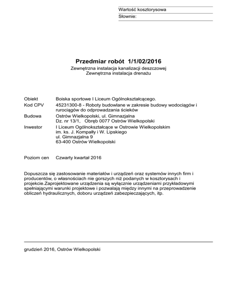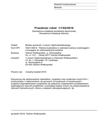 Wartość kosztorysowa Słownie: Przedmiar robót 1/1/02/2016 Zewnętrzna instalacja kanalizacji deszczowej Zewnętrzna instalacja drenażu Obiekt Kod CPV Budowa Inwestor Poziom cen Boiska sportowe I Liceum Ogólnokształcącego. 45231300-8 - Roboty budowlane w zakresie budowy wodociągów i rurociągów do odprowadzania ścieków Ostrów Wielkopolski, ul. Gimnazjalna Dz. nr 13/1, Obręb 0077 Ostrów Wielkopolski I Liceum Ogólnokształcące w Ostrowie Wielkopolskim im. ks. J. Kompałły i W. Lipskiego ul. Gimnazjalna 9 63-400 Ostrów Wielkopolski Czwarty kwartał 2016 Dopuszcza się zastosowanie materiałów i urządzeń oraz systemów innych firm i producentów, o własnościach nie gorszych niż podanych w kosztorysach i projekcie.Zaprojektowane urządzenia są wyłącznie urządzeniami przykładowymi spełniającymi warunki projektowe i pozwalają między innymi na przeprowadzenie obliczeń hydraulicznych, doboru urządzeń zabezpieczających, itp. grudzień 2016, Ostrów Wielkopolski Przedmiar robót Boiska sportowe I Liceum Ogólnokształcącego. Nr Podstawa Nr ST Opis robót Jm 1. Kanalizacja deszczowa 1.1. Roboty budowlane 1 KNR 2-01 ST01.01 Roboty pomiarowe przy liniowych robotach ziemnych km 0120/03 - trasa kanału sanitarnego w terenie równinnym 2 KNNR 6 ST01.01 Tablice informacyjne szt 0702/05 Wykopy na odkład 3 KNNR 1 ST01.01 Wykopy oraz przekopy wykonywane na odkład m3 0210/03 koparkami podsiębiernymi o pojemności łyżki 0,25-0,60m3 na głębokość do 3m w gruncie kategorii III-IV 4 KNNR 1 ST01.01 Wykopy liniowe w gruncie suchym kategorii III-IV m3 0307/06 szerokości 0,8-2,5m, głębokości 6,0m o ścianach pionowych, z ręcznym wydobyciem urobku Wykopy z wywozem urobku 5 KNNR 1 ST01.01 Roboty ziemne wykonywane koparkami m3 0202/08 podsiębiernymi o pojemności łyżki 0,60m3 w gruncie kategorii III-IV z transportem urobku samochodami samowyładowczymi na odległość 1km 6 KNNR 1 ST01.01 Wykopy w gruncie kategorii IV z załadunkiem m3 0301/03 ręcznym i transportem na odległość do 1km 7 KNNR 1 ST01.01 Nakłady uzupełniające do tablic za każdy dalszy m3 0208/02 rozpoczęty 1km odległości transportu ponad 1km samochodami samowyładowczymi gruntu kat. I-IV po drogach o nawierzchni utwardzonej Podsypka i zasypka 8 KNNR 4 ST01.01 Podłoża pod studnie i separator z materiałów sypkich m3 1411/03 o grubości 20cm 9 KNNR 4 ST01.01 Podłoża pod kanały i obiekty z materiałów sypkich o m3 1411/02 grubości 15cm 10 KNNR 4 ST01.01 Obsypka (do wys. 30 cm nad kanał) m3 1411/04 Kolizje 11 KNNR 1 ST01.01 Montaż konstrukcji podwieszeń rurociągów i kanałów kpl 0529/01 o rozpiętości 4,0m 12 KNNR 1 ST01.01 Demontaż konstrukcji podwieszeń rurociągów i kpl 0529/06 kanałów o rozpiętości 4,0m Zabezpieczenie ścian wykopu 13 Kalkulacja ST01.01 Umocnienie ścian wykopu szalunkiem skrzynkowym m2 indywidualn a 14 KNR 4-01 ST01.01 Pomost drewniany nad wykopem dla ruchu pieszego m2 0107/08 Zasypywanie wykopów 15 KNNR 1 ST01.01 Zasypanie wykopów podłużnych, punktowych, m3 0214/02 gruntem kategorii III-IV o grubości warstwy w stanie luźnym 30cm z zagęszczeniem mechanicznym spycharkami 16 KNNR 1 ST01.01 Zasypanie wykopów o ścianach pionowych w gruncie m3 0318/06 kategorii III-IV o szerokości 0,8-2,5m i głębokości 6,0m 1.2. Roboty instalacyjne 17 KNNR 4 ST01.04 Studzienki kanalizacyjne o średnicy 425mm z szt 1417/02 zamknięciem rurą teleskopową 18 KNNR 4 ST01.04 Kanały z rur PVC-U klasy S o średnicy 160mm m 1308/02 łączone na wcisk z litą ścianką 19 KNNR 4 ST01.04 Kształtki z PCW kanalizacji zewnętrznej szt 1321/02 dwukielichowe o średnicy zewnętrznej 160mm łączone na wcisk (trójniki 45* 160/160mm) 20 KNNR 4 ST01.04 Kształtki z PCW kanalizacji zewnętrznej szt 1321/02 dwukielichowe o średnicy zewnętrznej 160mm łączone na wcisk (kolano 45*) 21 KNNR 4 ST01.04 Próba wodna szczelności kanałów rurowych o próba 1610/01 średnicy do 160mm z PCV 22 KNNR 6 ST01.04 Odwodnienia liniowe o szerokości koryta 100mm ze szt 0401/03 studzienką przyłączeniową i rusztem ze stali ocynkowanej klasy C250 i długości 3,7m 23 KNNR 6 ST01.04 Odwodnienia liniowe o szerokości koryta 100mm ze szt 0401/03 studzienką przyłączeniową i rusztem ze stali ocynkowanej klasy C250 i długości 23,5m 2. Instalacja drenażu 2.1. Roboty budowlane 24 KNR 2-01 ST01.01 Roboty pomiarowe przy liniowych robotach ziemnych km 0120/03 - trasa kanału drenażowego w terenie równinnym Strona 2/7 Ilość 0,059 1,000 46,782 4,726 28,921 10,295 39,216 1,400 8,895 27,278 3,000 3,000 178,648 2,400 46,782 4,726 7,000 59,300 3,000 3,000 7,000 2,000 1,000 0,144 Cena Wartość Przedmiar robót Boiska sportowe I Liceum Ogólnokształcącego. Nr Podstawa Nr ST Opis robót 25 KNNR 6 ST01.01 Tablice informacyjne 0702/05 Wykopy na odkład 26 KNNR 1 ST01.01 Wykopy oraz przekopy wykonywane na odkład 0210/03 koparkami podsiębiernymi o pojemności łyżki 0,25-0,60m3 na głębokość do 3m w gruncie kategorii III-IV Wykopy z wywozem urobku 27 KNNR 1 ST01.01 Roboty ziemne wykonywane koparkami 0202/08 podsiębiernymi o pojemności łyżki 0,60m3 w gruncie kategorii III-IV z transportem urobku samochodami samowyładowczymi na odległość 1km 28 KNNR 1 ST01.01 Wykopy w gruncie kategorii IV z załadunkiem 0301/03 ręcznym i transportem na odległość do 1km 29 KNNR 1 ST01.01 Nakłady uzupełniające do tablic za każdy dalszy 0208/02 rozpoczęty 1km odległości transportu ponad 1km samochodami samowyładowczymi gruntu kat. I-IV po drogach o nawierzchni utwardzonej Umocnienia ścian wykopu 30 Kalkulacja ST01.01 Umocnienie ścian wykopu szalunkiem skrzynkowym indywidualn a Podsypki i zasypki 31 KNNR 4 ST01.01 Podłoża pod kanały i obiekty z materiałów sypkich o 1411/02 grubości 15cm 32 KNNR 1 ST01.01 Wykonanie złoża filtracyjnego z tłucznia 0412/01 33 KNNR 1 ST01.01 Zabezpieczenie geowłókniną polipropylenową (do 0410/01 200 g/m2) warstwy przesiąkalnej Zasypywanie wykopu 34 KN