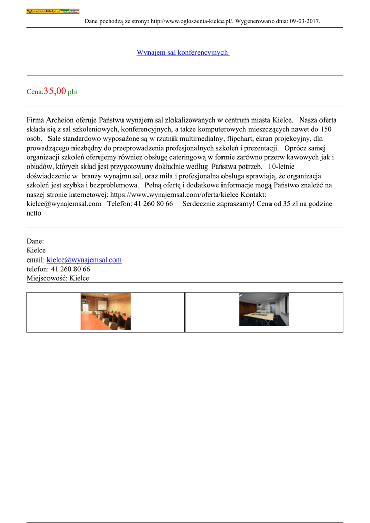 Dane pochodzą ze strony: http://www.ogloszenia-kielce.pl/. Wygenerowano dnia: 09-03-2017. Wynajem sal konferencyjnych Cena:35,00 pln Firma Archeion oferuje Państwu wynajem sal zlokalizowanych w centrum miasta Kielce. Nasza oferta składa się z sal szkoleniowych, konferencyjnych, a także komputerowych mieszczących nawet do 150 osób. Sale standardowo wyposażone są w rzutnik multimedialny, flipchart, ekran projekcyjny, dla prowadzącego niezbędny do przeprowadzenia profesjonalnych szkoleń i prezentacji. Oprócz samej organizacji szkoleń oferujemy również obsługę cateringową w formie zarówno przerw kawowych jak i obiadów, których skład jest przygotowany dokładnie według Państwa potrzeb. 10-letnie doświadczenie w branży wynajmu sal, oraz miła i profesjonalna obsługa sprawiają, że organizacja szkoleń jest szybka i bezproblemowa. Pełną ofertę i dodatkowe informacje mogą Państwo znaleźć na naszej stronie internetowej: https://www.wynajemsal.com/oferta/kielce Kontakt: [email protected] Telefon: 41 260 80 66 Serdecznie zapraszamy! Cena od 35 zł na godzinę netto Dane: Kielce email: [email protected] telefon: 41 260 80 66 Miejscowość: Kielce