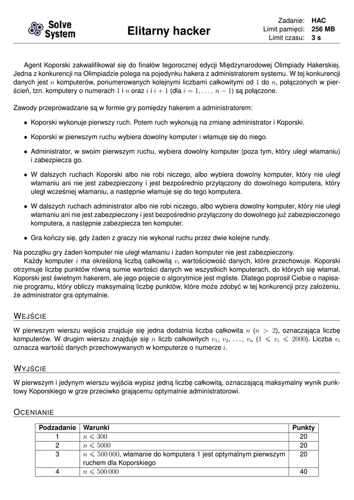 Elitarny hacker Zadanie: Limit pamieci: ˛ Limit czasu: HAC 256 MB 3s Agent Koporski zakwalifikował sie˛ do finałów tegorocznej edycji Miedzynarodowej ˛ Olimpiady Hakerskiej. Jedna z konkurencji na Olimpiadzie polega na pojedynku hakera z administratorem systemu. W tej konkurencji danych jest n komputerów, ponumerowanych kolejnymi liczbami całkowitymi od 1 do n, połaczonych ˛ w pierścień, tzn. komputery o numerach 1 i n oraz i i i + 1 (dla i = 1, . . . , n − 1) sa˛ połaczone. ˛ Zawody przeprowadzane sa˛ w formie gry pomiedzy ˛ hakerem a administratorem: • Koporski wykonuje pierwszy ruch. Potem ruch wykonuja˛ na zmiane˛ administrator i Koporski. • Koporski w pierwszym ruchu wybiera dowolny komputer i włamuje sie˛ do niego. • Administrator, w swoim pierwszym ruchu, wybiera dowolny komputer (poza tym, który uległ włamaniu) i zabezpiecza go. • W dalszych ruchach Koporski albo nie robi niczego, albo wybiera dowolny komputer, który nie uległ włamaniu ani nie jest zabezpieczony i jest bezpośrednio przyłaczony ˛ do dowolnego komputera, który uległ wcześniej włamaniu, a nastepnie ˛ włamuje sie˛ do tego komputera. • W dalszych ruchach administrator albo nie robi niczego, albo wybiera dowolny komputer, który nie uległ włamaniu ani nie jest zabezpieczony i jest bezpośrednio przyłaczony ˛ do dowolnego już zabezpieczonego komputera, a nastepnie ˛ zabezpiecza ten komputer. • Gra kończy sie, ˛ gdy żaden z graczy nie wykonał ruchu przez dwie kolejne rundy. Na poczatku ˛ gry żaden komputer nie uległ włamaniu i żaden komputer nie jest zabezpieczony. Każdy komputer i ma określona˛ liczba˛ całkowita˛ vi wartościowość danych, które przechowuje. Koporski otrzymuje liczbe˛ punktów równa˛ sumie wartości danych we wszystkich komputerach, do których sie˛ włamał. Koporski jest świetnym hakerem, ale jego pojecie ˛ o algorytmice jest mgliste. Dlatego poprosił Ciebie o napisanie programu, który obliczy maksymalna˛ liczbe˛ punktów, które może zdobyć w tej konkurencji przy założeniu, że administrator gra optymalnie. W EJ ŚCIE W pierwszym wierszu wejścia znajduje sie˛ jedna dodatnia liczba całkowita n (n > 2), oznaczajaca ˛ liczbe˛ komputerów. W drugim wierszu znajduje sie˛ n liczb całkowitych v1 , v2 , . . . , vn (1 ¬ vi ¬ 2000). Liczba vi oznacza wartość danych przechowywanych w komputerze o numerze i. W YJ ŚCIE W pierwszym i jedynym wierszu wyjścia wypisz jedna˛ liczbe˛ całkowita, ˛ oznaczajac ˛ a˛ maksymalny wynik punktowy Koporskiego w grze przeciwko grajacemu ˛ optymalnie administratorowi. O CENIANIE Podzadanie 1 2 3 Warunki n ¬ 300 n ¬ 5000 n ¬ 500 000, włamanie do komputera 1 jest optymalnym pierwszym Punkty 20 20 20 ruchem dla Koporskiego 4 n ¬ 500 000 40 P RZYKŁADY Wejście Wyjście 4 7 6 8 4 13 Wejście Wyjście 5 1 1 1 1 1 3 W pierwszym przykładzie Koporski powinien zaczać ˛ od włamania do komputera 2, za co otrzyma 6 punktów. Administrator zabezpieczy komputer 3. Koporski wtedy włamie sie˛ do niezabezpieczonego komputera 1, otrzymujac ˛ 7 punktów. Nastepnie ˛ administrator zabezpiecza komputer 4.