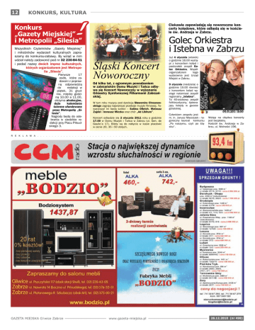Ciekawie zapowiadają się noworoczne koncerty kolędowe, które odbędą się w kościele św. Andrzeja w Zabrzu. Konkurs „Gazety Miejskiej” i Metropolii „Silesia” Golec Orkiestra i Istebna w Zabrzu Wszystkich Czytelników „Gazety Miejskiej” i miłośników wydarzeń kulturalnych zapraszamy do konkursu-zabawy. By wziąć w nim udział należy zadzwonić pod nr 32 230-84-51 i podać nazwy dwóch imprez kulturalnych, których organizatorem jest Metropolia „Silesia”. Śląski Koncert Noworoczny Pierwsze 17 osób, które zadzwoni z poprawną odpowiedzią do redakcji w piątek, 31 grudnia, między godziną 10.00 a 11.00, otrzyma atrakcyjne, duże kalendarze ścienne ufundowane przez Metropolię „Silesia”. Nagrody będą do odebrania w siedzibie redakcji przy Placu Piłsudskiego 3. R E K L A M A . . . . . . . . . . . . . . . . Już 4 stycznia (wtorek) o godzinie 18.00 wystąpi z koncertem kolęd i pastorałek zespół Golec Orkiestra. Współorganizatorem tego wydarzenia jest Urząd Miejski w Zabrzu. Od kilku lat, z ogromnym powodzeniem w zabrzańskim Domu Muzyki i Tańca odbywa się Koncert Noworoczny w wykonaniu Orkiestry Symfonicznej Filharmonii Zabrzańskiej. 9 stycznia (niedziela) o godzinie 19.00 również z koncertem kolęd wystąpi natomiast zespół regionalny „Istebna“. To 40-osobowy zespół folklorystyczny, śpiewający kolędy w gwarze góralskiej. W tym roku muzycy pod dyrekcją Sławomira Chrzanowskiego zagrają największe przeboje muzyki filmowej. Towarzyszyć im będą soliści – Sabina Olbrich, Mateusz Zajdel i Ireneusz Miczka oraz chór „Ad Libitum”. Członkiem zespołu jest m. in. Janusz Macoszek -- tegoroczny laureat konkursu „Po naszymu, czyli po śląsku“. Koncert odbędzie się 2 stycznia 2011 roku o godzinie 17.00 w Domu Muzyki i Tańca w Zabrzu (ul. Gen. de Gaulle’a 17). Bilety są do nabycia w kasie placówki w cenie 20, 35 i 50 złotych. . . . . . . . . . . . . . . . . . . . . . . . . . . . . . . . . . . . . . . . . . . Wstęp na obydwa koncerty jest bezpłatny. Kościół św. Andrzeja w Zabrzu, ul. Wolności 196. . .
