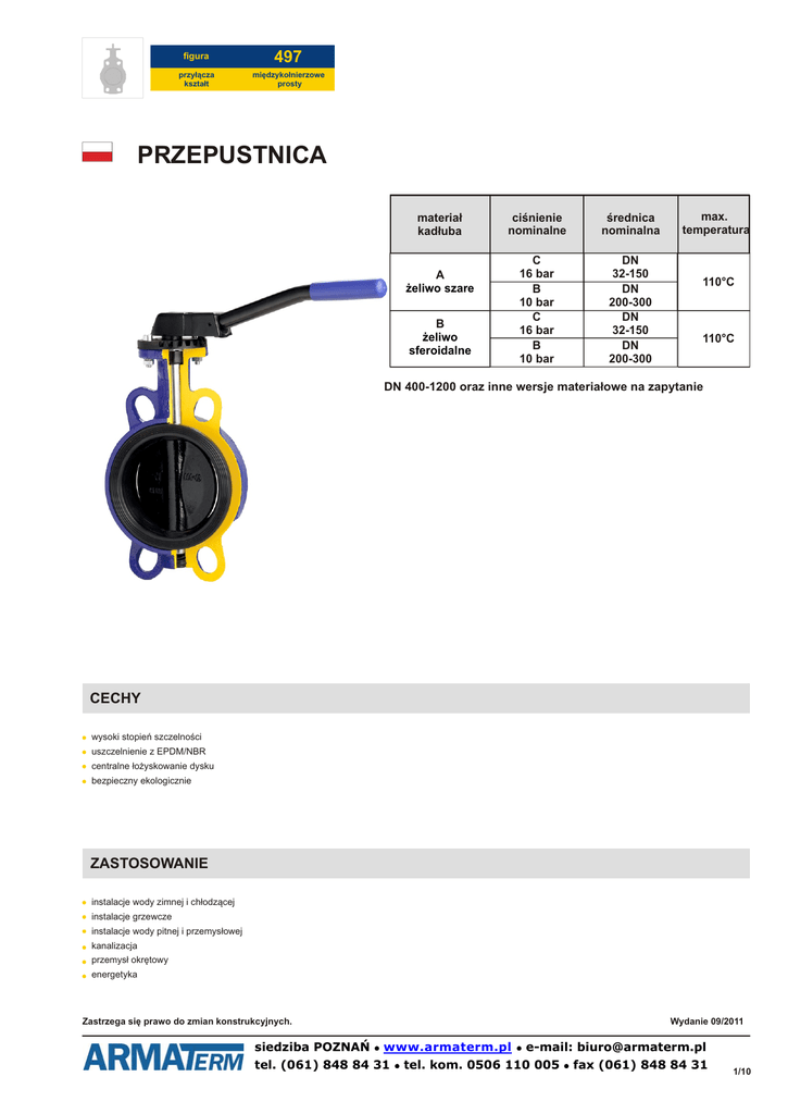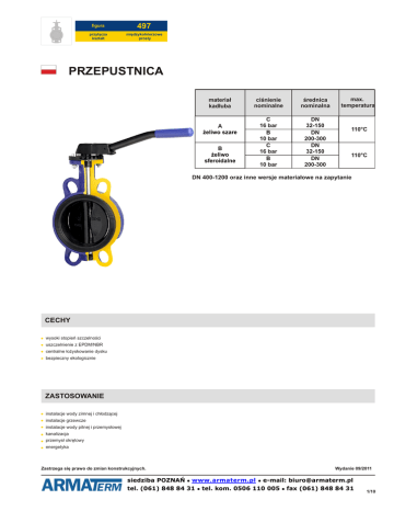 figura 497 przyłącza kształt międzykołnierzowe prosty PRZEPUSTNICA materiał kadłuba A żeliwo szare B żeliwo sferoidalne ciśnienie nominalne średnica nominalna C 16 bar B 10 bar C 16 bar B 10 bar DN 32-150 DN 200-300 DN 32-150 DN 200-300 max. temperatura 110°C 110°C DN 400-1200 oraz inne wersje materiałowe na zapytanie CECHY wysoki stopień szczelności uszczelnienie z EPDM/NBR centralne łożyskowanie dysku bezpieczny ekologicznie ZASTOSOWANIE instalacje wody zimnej i chłodzącej instalacje grzewcze instalacje wody pitnej i przemysłowej kanalizacja przemysł okrętowy energetyka Zastrzega się prawo do zmian konstrukcyjnych. Wydanie 09/2011 siedziba POZNAŃ • www.armaterm.pl • e-mail: [email protected] tel. (061) 848 84 31 • tel. kom. 0506 110 005 • fax (061) 848 84 31 1/10 figura 497 przyłącza kształt międzykołnierzowe prosty MATERIAŁY 4 1 3 2 materiał kadłuba wykonanie A 66 B 36 35 1 kadłub EN-GJL-250 JL 1040 + EPOXY EN-GJS-400-15 JS 1030 + EPOXY 2 dysk EN-GJS-400-15 JS 1030 + EPOXY X6CrNiMoTi 17-12-2 3 gniazdo 4 trzpień EPDM EPDM NBR X20Cr13 1.4021 max. temperatura Zastrzega się prawo do zmian konstrukcyjnych. 110oC 110oC 100oC Wydanie 09/2011 siedziba POZNAŃ • www.armaterm.pl • e-mail: [email protected] tel. (061) 848 84 31 • tel. kom. 0506 110 005 • fax (061) 848 84 31 2/10 figura 497 przyłącza kształt międzykołnierzowe prosty WYMIARY DN A B C D E F G H J K Q R ISO kg mm inch 32 1 1/4” 102,5 60,2 33 68 30 11 90 192,7 100 85 70 4x9 1,5 F-07 40 1 1/2” 110 56 33 76 30 11 90 196 110 95 70 4x9 1,7 F-07 50 2” 120 61,5 43 100 30 11 90 211,5 123 120,6 70 4x9 2 F-07 65 2 1/2” 135 69 46 108 30 11 90 234 145 127 70 4x9 2,6 F-07 80 3” 141 94 46 124 30 11 90 265 160 145 70 4x9 3,1 F-07 100 4” 165 106 52 147 30 11 90 301 185,5 165 70 4x9 3,9 F-07 125 5” 180 126,5 56 180 33 14 90 339,5 225 206 70 4x9 6,1 F-07 150 6” 193 133 56 206 33 14 90 359 241,3 229 70 4x9 7,2 F-07 200 8” 225 170 60 257 33 17 90 428 305 280 70 4x9 11 F-07 250 10” 282,5 210 68 324 23 22 130 515,5 362 335 102 4x12 20,5 F-10 300 12” 308 240 78 376 23 22 130 571 431,8 394 102 4x12 29,5 F-10 350 14” 338,5 263 78 430 31 22 160 632,5 476,3 445 102 4x12 35,4 F-10 400 16” 380 308 102 485 31 27 160 719 540 510 125 4x12 54,6 F-12 450 18” 380,5 340 114 536 38 36 190 758,5 140 4x14 80,8 F-14 500 20” 432,5 380 127 593 38 36 210 850,5 140 4x18 113,3 F-14 600 24” 494 440 154 690 80 60 210 1014 165 4x22 170,5 F-16 700 28” 590 490 165 830 106 65 300 1186 254 8x18 290,9 F-25 800 32” 630 565 190 902 106 80 300 1301 254 8x18 363,3 F-25 900 36” 695 610 78 1010 110 80 350 1415 254 8x18 497 F-25 1000 40” 770 675 78 1116 110 80 350 1555 254 8x18 598,5 F-25 1200 48” 875 818 78 1334 120 100 350 1813 298 8x23 931,5 F-30 mm Zastrzega się prawo do zmian konstrukcyjnych. Wydanie 09/2011 siedziba POZNAŃ • www.armaterm.pl • e-mail: [email protected] tel. (061) 848 84 31 • tel. kom. 0506 110 005 • fax (061) 848 84 31 3/10 figura 497 przyłącza kształt międzykołnierzowe prosty WYMIARY dźwignia zapadkowa DN 32-200 DN C dźwignia zaciskowa DN 250-300 X E2 H2 Y2 L2 M2 kg mm 32 33 68 49 151 212 220 90 1,9 40 33 76 49 159 215 220 90 2,1 50 43 100 49 169 230 220 90 2,9 65 46 108 49 184 253 220 90 3,0 80 46 124 60 201 295 260 90 3,6 100 52 147 60 225 331 260 90 4,4 125 56 180 75 225 381 315 90 6,6 150 56 206 75 268 401 315 90 7,6 200 60 257 75 300 470 315 90 11,4 250 68 324 - - - - - - 300 78 367 - - - - - - DN E3 H3 Y3 L3 M3 kg mm 250 120 402 612 500 130 22,5 300 120 428 668 500 130 32,7 Zastrzega się prawo do zmian konstrukcyjnych. Wydanie 09/2011 siedziba POZNAŃ • www.armaterm.pl • e-mail: [email protected] tel. (061) 848 84 31 • tel. kom. 0506 110 005 • fax (061) 848 84 31 4/10 figura 497 przyłącza kształt międzykołnierzowe prosty WYKONANIA figura 497 materiał kadłuba średnica nominalna DN ciśnienie nominalne PN A 32-150 C żeliwo szare EN-GJL-250 mm 16bar wykonanie 66 200-300 B mm 10bar Tmax 110 °C dysk - żeliwo sferoidalne epoksydowane dźwignia zapadkowa uszczelnienie EPDM 66 B 32-150 C żeliwo sferoidalne EN-GJS-400-15 mm 16bar Tmax 110 °C dysk - żeliwo sferoidalne epoksydowane dźwignia zapadkowa uszczelnienie EPDM 36 200-300 B mm 10bar dysk - stal nierdzewna dźwignia zapadkowa uszczelnienie EPDM dysk - stal nierdzewna dźwignia zapadkowa uszczelnienie EPDM dysk - stal nierdzewna dźwignia zapadkowa uszczelnienie NBR dysk - stal nierdzewna dźwignia zapadkowa uszczelnienie NBR Tmax 110 °C 36 32-150 C mm 16bar Tmax 110 °C 35 Tmax 100 °C 35 200-300 B mm 10bar Tmax 100 °C ZAMAWIANIE Uprasza się o zamawianie produktu wg indeksu figura materiał kadłuba średnica nominalna DN ciśnienie nominalne PN wykonanie 497 B 040 C 35 PRZYKŁAD ZAMÓWIENIA przepustnica, przyłącze międzykołnierzowe, kształt prosty 497 B 040 C 35 497 B żeliwo sferoidalne EN-GJS-400-15 040 średnica nominalna DN40 C ciśnienie nominalne PN16 dysk - stal nierdzewna ● dźwignia zapadkowa ● uszczelnienie NBR 35 siedziba POZNAŃ • www.armaterm.pl • e-mail: [email protected] tel. (061) 848 84 31 • tel. kom. 0506 110 005 • fax (061) 848 84 31 5/10 figura 497 przyłącza kształt międzykołnierzowe prosty PRZEPUSTNICA materiał kadłuba ciśnienie nominalne średnica nominalna max. temperatura B żeliwo sferoidalne C 16 bar DN 25-600 120°C CECHY wysoki stopień szczelności uszczelnienie z EPDM/NBR centralne łożyskowanie dysku bezpieczny ekologicznie PRZEKŁADNIA ŚLIMAKOWA żywotność 10 000 operacji zamknij/otwórz korpus aluminiowy lub żeliwny epoksydowany regulowane zderzaki dla pozycji zamknij/otwórz wskaźnik położenia ZASTOSOWANIE instalacje wody zimnej i chłodzącej instalacje grzewcze instalacje wody pitnej i przemysłowej kanalizacja przemysł okrętowy energetyka Zastrzega się prawo do zmian konstrukcyjnych. Wydanie 09/2011 siedziba POZNAŃ • www.armaterm.pl • e-mail: [email protected] tel. (061) 848 84 31 • tel. kom. 0506
