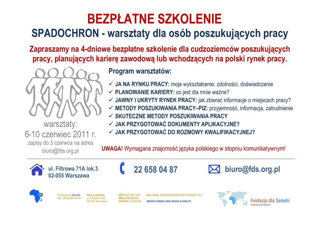 BEZPŁATNE SZKOLENIE SPADOCHRON - warsztaty dla osób poszukujących pracy Zapraszamy na 4-dniowe bezpłatne szkolenie dla cudzoziemców poszukujących pracy, planujących karierę zawodową lub wchodzących na polski rynek pracy. Program warsztatów: warsztaty: 6-10 czerwiec 2011 r. zapisy do 3 czerwca na adres [email protected] ul. Filtrowa 71A lok.3 02-055 Warszawa JA NA RYNKU PRACY: moje wykształcenie, zdolności, doświadczenie PLANOWANIE KARIERY: co jest dla mnie ważne? JAWNY I UKRYTY RYNEK PRACY: jak zbierać informacje o miejscach pracy? METODY POSZUKIWANIA PRACY–PIZ: przyjemność, informacja, zatrudnienie SKUTECZNE METODY POSZUKIWANIA PRACY JAK PRZYGOTOWAĆ DOKUMENTY APLIKACYJNE? JAK PRZYGOTOWAĆ DO ROZMOWY KWALIFIKACYJNEJ? UWAGA! Wymagana znajomość języka polskiego w stopniu komunikatywnym! 22 658 04 87 [email protected]