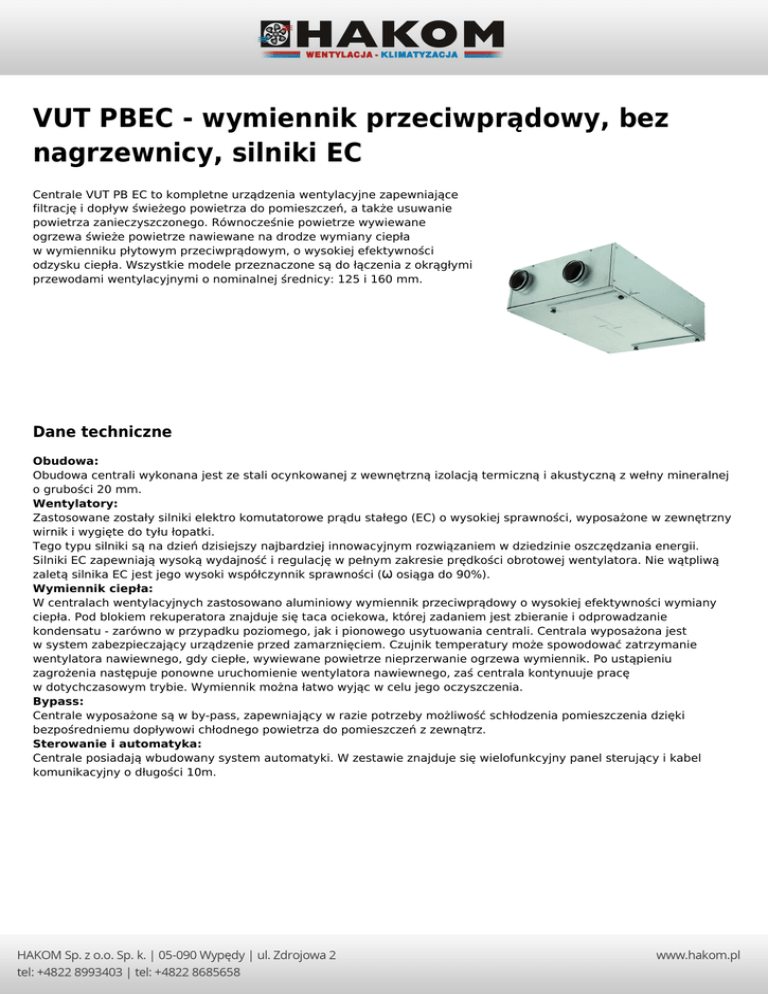 VUT PBEC - wymiennik przeciwprądowy, bez nagrzewnicy, silniki EC Centrale VUT PB EC to kompletne urządzenia wentylacyjne zapewniające filtrację i dopływ świeżego powietrza do pomieszczeń, a także usuwanie powietrza zanieczyszczonego. Równocześnie powietrze wywiewane ogrzewa świeże powietrze nawiewane na drodze wymiany ciepła w wymienniku płytowym przeciwprądowym, o wysokiej efektywności odzysku ciepła. Wszystkie modele przeznaczone są do łączenia z okrągłymi przewodami wentylacyjnymi o nominalnej średnicy: 125 i 160 mm. Dane techniczne Obudowa: Obudowa centrali wykonana jest ze stali ocynkowanej z wewnętrzną izolacją termiczną i akustyczną z wełny mineralnej o grubości 20 mm. Wentylatory: Zastosowane zostały silniki elektro komutatorowe prądu stałego (EC) o wysokiej sprawności, wyposażone w zewnętrzny wirnik i wygięte do tyłu łopatki. Tego typu silniki są na dzień dzisiejszy najbardziej innowacyjnym rozwiązaniem w dziedzinie oszczędzania energii. Silniki EC zapewniają wysoką wydajność i regulację w pełnym zakresie prędkości obrotowej wentylatora. Nie wątpliwą zaletą silnika EC jest jego wysoki współczynnik sprawności (Ѡ osiąga do 90%). Wymiennik ciepła: W centralach wentylacyjnych zastosowano aluminiowy wymiennik przeciwprądowy o wysokiej efektywności wymiany ciepła. Pod blokiem rekuperatora znajduje się taca ociekowa, której zadaniem jest zbieranie i odprowadzanie kondensatu - zarówno w przypadku poziomego, jak i pionowego usytuowania centrali. Centrala wyposażona jest w system zabezpieczający urządzenie przed zamarznięciem. Czujnik temperatury może spowodować zatrzymanie wentylatora nawiewnego, gdy ciepłe, wywiewane powietrze nieprzerwanie ogrzewa wymiennik. Po ustąpieniu zagrożenia następuje ponowne uruchomienie wentylatora nawiewnego, zaś centrala kontynuuje pracę w dotychczasowym trybie. Wymiennik można łatwo wyjąc w celu jego oczyszczenia. Bypass: Centrale wyposażone są w by-pass, zapewniający w razie potrzeby możliwość schłodzenia pomieszczenia dzięki bezpośredniemu dopływowi chłodnego powietrza do pomieszczeń z zewnątrz. Sterowanie i automatyka: Centrale posiadają wbudowany system automatyki. W zestawie znajduje się wielofunkcyjny panel sterujący i kabel komunikacyjny o długości 10m. Dane techniczne VUT 160 PB EC VUT 350 PB EC Napięcie (V) 1~230 Max moc centrali (W) 50 170 Maksymalny pobór prądu centrali (A) 0,4 1,3 Wydajność (m3/h) 190 410 3770 3200 48 58 -1 Obroty (min ) Poziom hałasu [dB(A)/3m] Max. temp. pracy (°C) Materiał obudowy Izolacja -25 +60 stal ocynkowana 20mm, wełna mineralna Filtr: wyciąg Średnica króćców przyłączeniowych (mm) Waga Sprawność rekuperacji Typ rekuperatora Materiał rekuperatora Wymiary Charakterystyka G4/G4 (F7*) Ø125 Ø160 48 70 od 82 do 94 od 80 do 91 przeciwprądowy aluminium