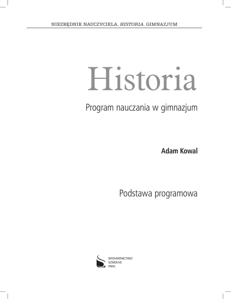 Niezbędnik nauczyciela. HISTORIA. GIMNAZJUM Historia Program nauczania w gimnazjum Adam Kowal Podstawa programowa Redaktor Dorota Ślubowska Redaktor techniczny Maryla Broda Skład i łamanie Grafini Copyright © by Wydawnictwo Szkolne PWN Sp. z o.o. Warszawa 2009 ISBN 978-83-262-0048-9 I. CHARAKTERYSTYKA PROGRAMU1 Realizacja zadań wynikających z programu nauczania historii w gimnazjum dla klas I–III pozwoli uczniom na zdobycie wiedzy i umiejętności historycznych obejmujących okres od pradziejów do I wojny światowej (określonych w podstawie programowej). Pozostałe wiadomości i umiejętności uczniowie mają zdobyć dopiero w szkole ponadgimnazjalnej. Nauczanie historii w gimnazjum opierać się będzie na trzech podstawowych celach kształcenia, którymi są: chronologia historyczna, • analiza i interpretacja historyczna, • tworzenie narracji historycznej. • Po ukończeniu kursu historii na poziomie gimnazjum uczeń powinien: • umiejscawiać postaci i wydarzenia w czasie historycznym; opisywać relacje człowieka z przyrodą; określać jego miejsce w społeczności lokalnej, ojczyźnie, przynależność do kręgu kulturowego, relacje z innymi narodami i religiami, • sytuować zjawiska i procesy historyczne w czasie i przestrzeni, odnajdywać związki między przeszłością a teraźniejszością i ich następstwa, dostrzegać ciągłość i zmienność historii, • wykorzystywać swoją wiedzę do powiązania zjawisk historycznych z zakresu dziejów powszechnych z historią Polski, • rozpatrywać wydarzenia w związkach przyczynowo-skutkowych, • znać, oceniać i interpretować fakty historyczne, • umieć docierać do różnego rodzaju źródeł historycznych, pozyskiwać z nich informacje, porównywać je, interpretować i formułować wnioski. Prezentowany program jest kursem chronologicznym i obejmuje okres od czasów najdawniejszych do I wojny światowej. Ramy chronologiczne, które proponuję w realizacji programu są następujące: klasa I – od czasów najdawniejszych do końca XV wieku, • klasa II – od końca XV wieku do końca wieku XVIII, • klasa III – cały wiek XIX do I wojny światowej. • W oddzielnej tabeli (dotyczy to podręczników Wydawnictwa Szkolnego PWN) zaznaczono materiał, który nauczyciel może pominąć bez szkody dla realizacji podstawy programowej. Program jest skorelowany z podręcznikami Wydawnictwa PWN i został skonstruowany tak, by stanowił „podróż” przez zmieniającą się w czasie cywilizację i kulturę, z pokazaniem ciągłości rozwoju cywilizacji i jej znaczenia dla świadomości współczesnych. Dzieje Polski przedstawiono jako fragment szerszych procesów ogólnoeuropejskich i światowych. Duży nacisk położono na wykształcenie u uczniów umiejętności: samodzielnego formułowania ocen i ich uzasadnienia (znajdowania odpowiednich argumentów), dyskusji, analizy tekstu. II. CELE NAUCZANIA Celem nauczania historii w szkole jest kształtowanie świadomości historycznej ucznia poprzez kształcenie myślenia, rozwijanie umiejętności intelektualnych, które dadzą mu możliwość samodzielnego poszukiwania i pogłębiania wiedzy historycznej. Dzięki zapoznaniu się z dziejami państwa i narodu polskiego rozpatrywanego na tle wydarzeń w Europie i świecie, uczeń zrozumie wydarzenia, które miały miejsce dawniej i dziś. A są to przecież zadania stawiane nauczaniu historii w gimnazjum. Można to osiągnąć poprzez cele szczegółowe, etapowe i finalne. Cele ogólne i etapowe są pomocne w tworzeniu celów szczegółowych. Poznawanie historii powinno odbywać się zarówno poprzez znajomość historii narodowej, powszechnej, jak również najważniejszych wydarzeń z historii regionalnej i lokalnej. Przy realizacji programu należy zwrócić szczególną uwagę na: • budzenie zainteresowania dorobkiem kulturowym i cywilizacyjnym ludzkości, • dostrzeganie związków pomiędzy „dużą” (dzieje Polski i historia powszechna) i „małą” (dzieje regionu) historią, • przedstawienie najważniejszych faktów historycznych, ich genezy i skutków, • przedstawienie życia i działalności ludzi tworzących historię regionalną, narodową i powszechną, znajomość najważniejszych etapów rozwoju społeczeństwa, Program opracowano na podstawie Rozporządzenia Ministra Edukacji Narodowej z dnia 23 grudnia 2008 r. w sprawie podstawy programowej wychowania przedszkolnego oraz kształcenia ogólnego w poszczególnych typach szkół. 1 © Wydawnictwo Szkolne PWN 3 • określenie wkładu państw i narodów w tworzenie kultury światowej oraz ich wpływu na dorobek Polski i regionu, • periodyzację dziejów i pojęcia czasu w historii, umowności przyjmowanych cezur między epokami. Należy pamiętać również o: • pogłębianiu rozumienia pojęć i wartości niezbędnych do zrozumienia życia politycznego, gospodarczego i społecznego, • rozumienia wpływu przeszłości na teraźniejszość, • tworzenia ciągów chronologicznych (kategorie przyczyn i skutków, kategorie: przed, równolegle, po), • rozwijaniu praktycznych umiejętności pozwalających uczniowi na samodzielną pracę z materiałem źródłowym (pozyskiwanie informacji ze źródła). Należy wykształcić w uczniach umiejętność rozpoznawania różnych typów źródeł oraz samodzielnego uzupełniania wiedzy o historii Polski, historii regionalnej i historii powszechnej. Należy pamiętać również o rozwijaniu w uczniach: • umiejętności myślenia historycznego i krytycyzmu (np. wobec uprzedzeń i nieracjonalnych argumentów), • dostrzegania w narracji historycznej warstwy informacyjnej, wyjaśniającej i oceniającej, • formułowania wniosków, uzasadniania własnego sądu oraz prowadzenia dyskusji. Nie można zapomnieć o kształceniu cech i umiejętności typowo historycznych: • analizy i syntezy materiału historycznego, wydarzeń, zjawisk i procesów historycznych, • odczytywania i interpretacji 