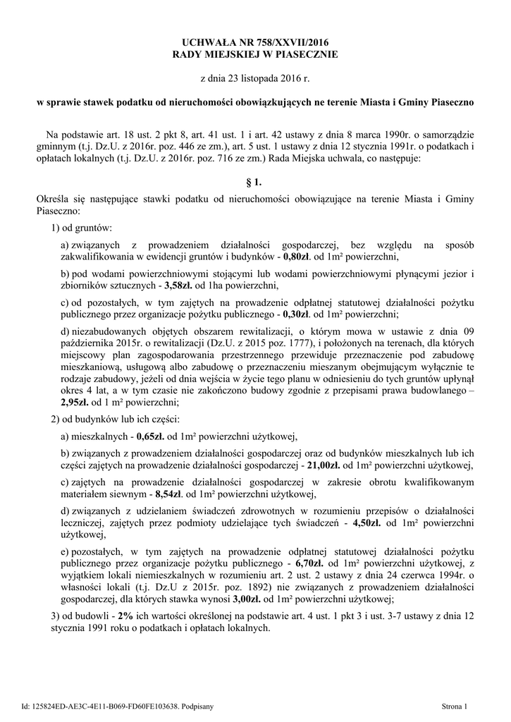 UCHWAŁA NR 758/XXVII/2016 RADY MIEJSKIEJ W PIASECZNIE z dnia 23 listopada 2016 r. w sprawie stawek podatku od nieruchomości obowiązkujących ne terenie Miasta i Gminy Piaseczno Na podstawie art. 18 ust. 2 pkt 8, art. 41 ust. 1 i art. 42 ustawy z dnia 8 marca 1990r. o samorządzie gminnym (t.j. Dz.U. z 2016r. poz. 446 ze zm.), art. 5 ust. 1 ustawy z dnia 12 stycznia 1991r. o podatkach i opłatach lokalnych (t.j. Dz.U. z 2016r. poz. 716 ze zm.) Rada Miejska uchwala, co następuje: § 1. Określa się następujące stawki podatku od nieruchomości obowiązujące na terenie Miasta i Gminy Piaseczno: 1) od gruntów: a) związanych z prowadzeniem działalności gospodarczej, bez względu zakwalifikowania w ewidencji gruntów i budynków - 0,80zł. od 1m² powierzchni, na sposób b) pod wodami powierzchniowymi stojącymi lub wodami powierzchniowymi płynącymi jezior i zbiorników sztucznych - 3,58zł. od 1ha powierzchni, c) od pozostałych, w tym zajętych na prowadzenie odpłatnej statutowej działalności pożytku publicznego przez organizacje pożytku publicznego - 0,30zł. od 1m² powierzchni; d) niezabudowanych objętych obszarem rewitalizacji, o którym mowa w ustawie z dnia 09 października 2015r. o rewitalizacji (Dz.U. z 2015 poz. 1777), i położonych na terenach, dla których miejscowy plan zagospodarowania przestrzennego przewiduje przeznaczenie pod zabudowę mieszkaniową, usługową albo zabudowę o przeznaczeniu mieszanym obejmującym wyłącznie te rodzaje zabudowy, jeżeli od dnia wejścia w życie tego planu w odniesieniu do tych gruntów upłynął okres 4 lat, a w tym czasie nie zakończono budowy zgodnie z przepisami prawa budowlanego – 2,95zł. od 1 m² powierzchni; 2) od budynków lub ich części: a) mieszkalnych - 0,65zł. od 1m² powierzchni użytkowej, b) związanych z prowadzeniem działalności gospodarczej oraz od budynków mieszkalnych lub ich części zajętych na prowadzenie działalności gospodarczej - 21,00zł. od 1m² powierzchni użytkowej, c) zajętych na prowadzenie działalności gospodarczej w zakresie obrotu kwalifikowanym materiałem siewnym - 8,54zł. od 1m² powierzchni użytkowej, d) związanych z udzielaniem świadczeń zdrowotnych w rozumieniu przepisów o działalności leczniczej, zajętych przez podmioty udzielające tych świadczeń - 4,50zł. od 1m² powierzchni użytkowej, e) pozostałych, w tym zajętych na prowadzenie odpłatnej statutowej działalności pożytku publicznego przez organizacje pożytku publicznego - 6,70zł. od 1m² powierzchni użytkowej, z wyjątkiem lokali niemieszkalnych w rozumieniu art. 2 ust. 2 ustawy z dnia 24 czerwca 1994r. o własności lokali (t.j. Dz.U z 2015r. poz. 1892) nie związanych z prowadzeniem działalności gospodarczej, dla których stawka wynosi 3,00zł. od 1m² powierzchni użytkowej; 3) od budowli - 2% ich wartości określonej na podstawie art. 4 ust. 1 pkt 3 i ust. 3-7 ustawy z dnia 12 stycznia 1991 roku o podatkach i opłatach lokalnych. Id: 125824ED-AE3C-4E11-B069-FD60FE103638. Podpisany Strona 1 § 2. Z dniem wejścia w życie niniejszej uchwały traci moc uchwała nr 378/XIV/2015 Rady Miejskiej w Piasecznie z dnia 18 listopada 2015r. w sprawie stawek podatku od nieruchomości obowiązujących na terenie miasta i gminy Piaseczno. § 3. Wykonanie uchwały powierza się Burmistrzowi Miasta i Gminy Piaseczno. § 4. Uchwała wchodzi w życie po upływie 14 dni od jej ogłoszenia w Dzienniku Urzędowym Województwa Mazowieckiego, nie wcześniej jednak niż z dniem 01 stycznia 2017r. Przewodniczący Rady Miejskiej w Piasecznie mgr inż. Piotr Obłoza Id: 125824ED-AE3C-4E11-B069-FD60FE103638. Podpisany Strona 2