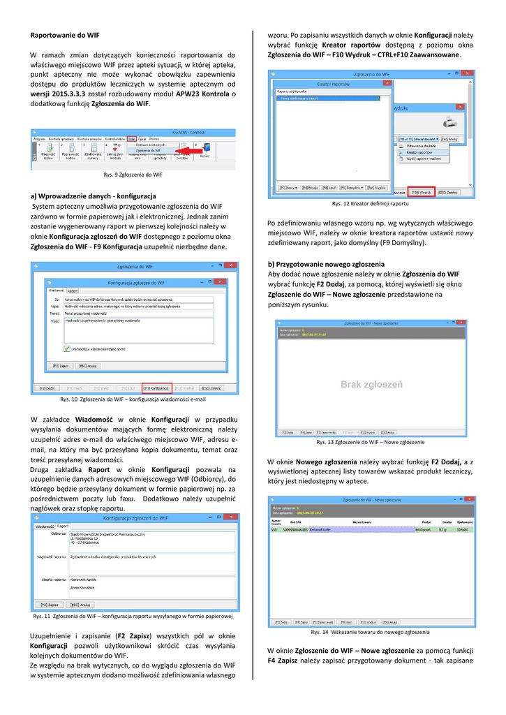 Raportowanie do WIF W ramach zmian dotyczących konieczności raportowania do właściwego miejscowo WIF przez apteki sytuacji, w której apteka, punkt apteczny nie może wykonać obowiązku zapewnienia dostępu do produktów leczniczych w systemie aptecznym od wersji 2015.3.3.3 został rozbudowany moduł APW23 Kontrola o dodatkową funkcję Zgłoszenia do WIF. wzoru. Po zapisaniu wszystkich danych w oknie Konfiguracji należy wybrać funkcję Kreator raportów dostępną z poziomu okna Zgłoszenia do WIF – F10 Wydruk – CTRL+F10 Zaawansowane. Rys. 9 Zgłoszenia do WIF a) Wprowadzenie danych - konfiguracja System apteczny umożliwia przygotowanie zgłoszenia do WIF zarówno w formie papierowej jak i elektronicznej. Jednak zanim zostanie wygenerowany raport w pierwszej kolejności należy w oknie Konfiguracja zgłoszeń do WIF dostępnego z poziomu okna Zgłoszenia do WIF - F9 Konfiguracja uzupełnić niezbędne dane. Rys. 12 Kreator definicji raportu Po zdefiniowaniu własnego wzoru np. wg wytycznych właściwego miejscowo WIF, należy w oknie kreatora raportów ustawić nowy zdefiniowany raport, jako domyślny (F9 Domyślny). b) Przygotowanie nowego zgłoszenia Aby dodać nowe zgłoszenie należy w oknie Zgłoszenia do WIF wybrać funkcję F2 Dodaj, za pomocą, której wyświetli się okno Zgłoszenie do WIF – Nowe zgłoszenie przedstawione na poniższym rysunku. Rys. 10 Zgłoszenia do WIF – konfiguracja wiadomości e-mail W zakładce Wiadomość w oknie Konfiguracji w przypadku wysyłania dokumentów mających formę elektroniczną należy uzupełnić adres e-mail do właściwego miejscowo WIF, adresu email, na który ma być przesyłana kopia dokumentu, temat oraz treść przesyłanej wiadomości. Druga zakładka Raport w oknie Konfiguracji pozwala na uzupełnienie danych adresowych miejscowego WIF (Odbiorcy), do którego będzie przesyłany dokument w formie papierowej np. za pośrednictwem poczty lub faxu. Dodatkowo należy uzupełnić nagłówek oraz stopkę raportu. Rys. 13 Zgłoszenie do WIF – Nowe zgłoszenie W oknie Nowego zgłoszenia należy wybrać funkcję F2 Dodaj, a z wyświetlonej aptecznej listy towarów wskazać produkt leczniczy, który jest niedostępny w aptece. Rys. 11 Zgłoszenia do WIF – konfiguracja raportu wysyłanego w formie papierowej Uzupełnienie i zapisanie (F2 Zapisz) wszystkich pól w oknie Konfiguracji pozwoli użytkownikowi skrócić czas wysyłania kolejnych dokumentów do WIF. Ze względu na brak wytycznych, co do wyglądu zgłoszenia do WIF w systemie aptecznym dodano możliwość zdefiniowania własnego Rys. 14 Wskazanie towaru do nowego zgłoszenia W oknie Zgłoszenie do WIF – Nowe zgłoszenie za pomocą funkcji F4 Zapisz należy zapisać przygotowany dokument - tak zapisane zgłoszenie do WIF można edytować/zmienić za pomocą funkcji F4 Zmień w oknie Zgłoszenia do WIF. Rys. 15 Zapisane zgłoszenie z możliwością zmiany Dodatkowo w oknie Zgłoszenie do WIF – Nowe zgłoszenie korzystając z funkcji F5 Zapisz i wyślij można zapisać oraz wysłać przygotowany dokument bezpośrednio do właściwego miejscowo WIF na adres e-mail zdefiniowany w oknie konfiguracji. Nie można później modyfikować wygenerowanego w ten sposób zgłoszenia. Dodatkowo w oknie Zgłoszenia do WIF za pomocą prawego przycisku myszy użytkownik może wywołać funkcję umożliwiającą zapisanie w repozytorium oraz eksport przygotowanego dokumentu do wybranego formatu. Rys. 16 Zapisane zgłoszenie bez możliwości zmiany W związku z faktem, że ustawodawca nie określił jednoznacznie kanału komunikacji pomiędzy apteką a WIF, istnieje możliwość skorzystania z tradycyjnej formy korespondencji i przesłania dokumentu pocztą lub faxem. Apteki, które wybiorą taką formę wymiany danych mogą w oknie "Zgłoszenia do WIF" skorzystać z funkcji "F10 Wydruk". Zapisany dokument Zgłoszenia do WIF automatycznie przekazywany jest do repozytorium KS-EDE.