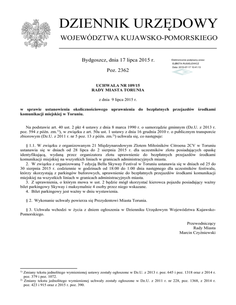 DZIENNIK URZĘDOWY WOJEWÓDZTWA KUJAWSKO-POMORSKIEGO Bydgoszcz, dnia 17 lipca 2015 r. Elektronicznie podpisany przez: ELŻBIETA RUSIELEWICZ Poz. 2362 Data: 2015-07-17 10:41:13 UCHWAŁA NR 109/15 RADY MIASTA TORUNIA z dnia 9 lipca 2015 r. w sprawie ustanowienia okolicznościowego uprawnienia do bezpłatnych przejazdów środkami komunikacji miejskiej w Toruniu. Na podstawie art. 40 ust. 2 pkt 4 ustawy z dnia 8 marca 1990 r. o samorządzie gminnym (Dz.U. z 2013 r. poz. 594 z późn. zm.1)), w związku z art. 50a ust. 1 ustawy z dnia 16 grudnia 2010 r. o publicznym transporcie zbiorowym (Dz.U. z 2011 r. nr 5 poz. 13 z późn. zm.2)) uchwala się, co następuje: § 1.1. W związku z organizowanym 21 Międzynarodowym Zlotem Miłośników Citroena 2CV w Toruniu ustanawia się w dniach od 28 lipca do 2 sierpnia 2015 r. dla uczestników zlotu posiadających opaskę identyfikującą, wydaną przez organizatora zlotu uprawnienie do bezpłatnych przejazdów środkami komunikacji miejskiej na wszystkich liniach w granicach administracyjnych miasta. 2. W związku z organizowaną 7 edycją Bella Skyway Festival w Toruniu ustanawia się w dniach od 25 do 30 sierpnia 2015 r. codziennie w godzinach od 18:00 do 1:00 dnia następnego dla uczestników festiwalu, którzy skorzystają z parkingów buforowych, uprawnienie do bezpłatnych przejazdów środkami komunikacji miejskiej na wszystkich liniach w granicach administracyjnych miasta. 3. Z uprawnienia, o którym mowa w ust. 2 będzie mógł skorzystać kierowca pojazdu posiadający ważny bilet parkingowy Skyway i maksymalnie 4 osoby przez niego wskazane. 4. Bilet parkingowy jest ważny w dniu wystawienia. § 2. Wykonanie uchwały powierza się Prezydentowi Miasta Torunia. § 3. Uchwała wchodzi w życia z dniem ogłoszenia w Dzienniku Urzędowym Województwa KujawskoPomorskiego. Przewodniczący Rady Miasta Marcin Czyżniewski 1) Zmiany tekstu jednolitego wymienionej ustawy zostały ogłoszone w Dz.U. z 2013 r. poz. 645 i poz. 1318 oraz z 2014 r. poz. 379 i poz. 1072. 2) Zmiany tekstu jednolitego wymienionej uchwały zostały ogłoszone w Dz.U. z 2011 r. nr 228, poz. 1368, z 2014 r. poz. 423 i 915 oraz z 2015 r. poz. 390.