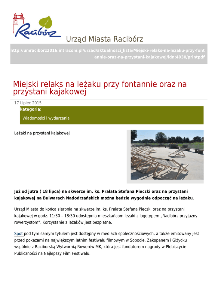 Urząd Miasta Racibórz http://umraciborz2016.intracom.pl/urzad/aktualnosci_lista/Miejski-relaks-na-lezaku-przy-font annie-oraz-na-przystani-kajakowej/idn:4030/printpdf Miejski relaks na leżaku przy fontannie oraz na przystani kajakowej 17 Lipiec 2015 kategoria: Wiadomości i wydarzenia Leżaki na przystani kajakowej Już od jutra ( 18 lipca) na skwerze im. ks. Prałata Stefana Pieczki oraz na przystani kajakowej na Bulwarach Nadodrzańskich można będzie wygodnie odpocząć na leżaku. Urząd Miasta do końca sierpnia na skwerze im. ks. Prałata Stefana Pieczki oraz na przystani kajakowej w godz. 11:30 – 18:30 udostępnia mieszkańcom leżaki z logotypem „Racibórz przyjazny rowerzystom”. Korzystanie z leżaków jest bezpłatne. Spot pod tym samym tytułem jest dostępny w mediach społecznościowych, a także emitowany jest przed pokazami na największym letnim festiwalu filmowym w Sopocie, Zakopanem i Giżycku wspólnie z Raciborską Wytwórnią Rowerów MK, która jest fundatorem nagrody w Plebiscycie Publiczności na Najlepszy Film Festiwalu.