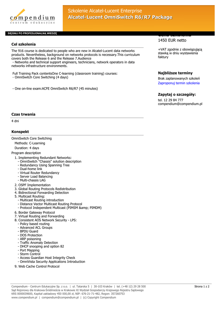 Szkolenie Alcatel-Lucent Enterprise Alcatel-Lucent OmniSwitch R6/R7 Package SIĘGNIJ PO PROFESJONALNĄ WIEDZĘ Cel szkolenia The 916 course is dedicated to people who are new in Alcatel-Lucent data networks products. Nevertheless, background on networks protocols is necessary.This curriculum covers both the Release 6 and the Release 7.Audience - Networks and technical support engineers, technicians, network operators in data networks infrastructure environments. Full Training Pack contentsOne C-learning (classroom training) courses: - OmniSwitch Core Switching (4 days) Cena szkolenia 1450 EUR netto +VAT zgodnie z obowiązującą stawką w dniu wystawienia faktury Najbliższe terminy Brak zaplanowanych szkoleń Zaproponuj termin szkolenia - One on-line exam:ACFE OmniSwitch R6/R7 (45 minutes) Zapytaj o szczegóły: tel. 12 29 84 777 [email protected] Czas trwania 4 dni Konspekt OmniSwitch Core Switching Methods: C-Learning Duration: 4 days Program description 1. Implementing Redundant Networks: - OmniSwitch "Chassis" solution description - Redundancy Using Spanning Tree - Dual-home link - Virtual Router Redundancy - Server Load Balancing - Multi-chassis LAG 2. OSPF Implementation 3. Global Routing Protocols Redistribution 4. Bidirectional Forwarding Detection 5. Multicast Routing: - Multicast Routing introduction - Distance Vector Multicast Routing Protocol - Protocol Independent Multicast (PIMSM & PIMDM) 6. Border Gateway Protocol 7. Virtual Routing and Forwarding 8. Consistent AOS Network Security - LPS: - Policy based routing - Advanced ACL Groups - BPDU Guard - DOS Protection - ARP poisoning - Traffic Anomaly Detection - DHCP snooping and option 82 - Port Mapping - Storm Control - Access Guardian Host Integrity Check - OmniVista Security Applications Introduction 9. Web Cache Control Protocol Compendium - Centrum Edukacyjne Sp. z o.o. | ul. Tatarska 5 | 30-103 Kraków | tel. (+48 12) 29 28 500 Sąd Rejonowy dla Krakowa-Śródmieścia w Krakowie XI Wydział Gospodarczy Krajowego Rejestru Sądowego KRS 0000039600, Kapitał zakładowy 450 000,00 zł, NIP: 676-21-71-482, Regon: 357260753 www.compendium.pl | [email protected] | (c) Copyright Compendium Strona 1 z 2 Szkolenie Alcatel-Lucent Enterprise Alcatel-Lucent OmniSwitch R6/R7 Package SIĘGNIJ PO PROFESJONALNĄ WIEDZĘ At the end of the course, the participant will be able to Implement and support a network comprised of Alcatel-Lucent OmniSwitch 9000E and 6250/6400/6450/6850E Series of switches. ACFE OmniSwitch R6/R7 Product/solution: Alcatel-Lucent OmniSwitch R6/R7 Reference: DT00TC1W4 Methods: I-Learning (on-line exam) Exam type: 30 MCQ Durations: 45 minutes This certification validates your ability to install, configure, manage and ensure the first level mainteance of the OmniSwith Stackable R6 solution. Wymagania - To have attended the on-line course DT00WTE909: OmniSwitch Series, - To have attended the course DT00CTE915: OmniSwitch Access Switching, - To have an understanding of LAN concepts (IP, Ethernet, switching and routing, VLAN, QOS, Spanning tree). Certyfikaty The participants will obtain certificates signed by Alcatel-Lucent. Also this course helps to prepare students for the following certification exams: - ACFE - Alcatel-Lucent Certified Field Expert - ACSE - Alcatel-Lucent Certified System Expert Lokalizacje Kraków - ul. Tatarska 5, II piętro, godz. 9:00 - 16:00 Warszawa - ul. Bielska 17, godz. 9:00 - 16:00 Prowadzący ACFE Instructor - Alcatel-Lucent Certified Field Expert Instructor. Cena szkolenia 1450 EUR netto Do ceny należy doliczyć 23% VAT Compendium - Centrum Edukacyjne Sp. z o.o. | ul. Tatarska 5 | 30-103 Kraków | tel. (+48 12) 29 28 500 Sąd Rejonowy dla Krakowa-Śródmieścia w Krakowie XI Wydział Gospodarczy Krajowego Rejestru Sądowego KRS 0000039600, Kapitał zakładowy 450 000,00 zł, NIP: 676-21-71-482, Regon: 357260753 www.compendium.pl | [email protected] | (c) Copyright Compendium Strona 2 z 2