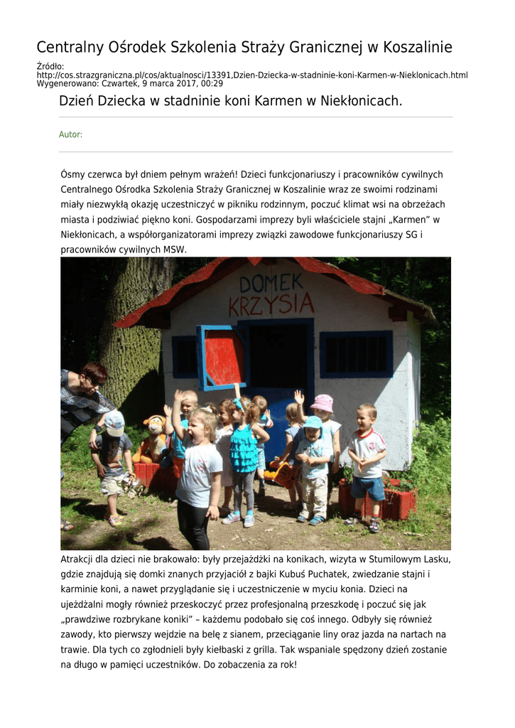 Centralny Ośrodek Szkolenia Straży Granicznej w Koszalinie Źródło: http://cos.strazgraniczna.pl/cos/aktualnosci/13391,Dzien-Dziecka-w-stadninie-koni-Karmen-w-Nieklonicach.html Wygenerowano: Czwartek, 9 marca 2017, 00:29 Dzień Dziecka w stadninie koni Karmen w Niekłonicach. Autor: Ósmy czerwca był dniem pełnym wrażeń! Dzieci funkcjonariuszy i pracowników cywilnych Centralnego Ośrodka Szkolenia Straży Granicznej w Koszalinie wraz ze swoimi rodzinami miały niezwykłą okazję uczestniczyć w pikniku rodzinnym, poczuć klimat wsi na obrzeżach miasta i podziwiać piękno koni. Gospodarzami imprezy byli właściciele stajni „Karmen” w Niekłonicach, a współorganizatorami imprezy związki zawodowe funkcjonariuszy SG i pracowników cywilnych MSW. Atrakcji dla dzieci nie brakowało: były przejażdżki na konikach, wizyta w Stumilowym Lasku, gdzie znajdują się domki znanych przyjaciół z bajki Kubuś Puchatek, zwiedzanie stajni i karminie koni, a nawet przyglądanie się i uczestniczenie w myciu konia. Dzieci na ujeżdżalni mogły również przeskoczyć przez profesjonalną przeszkodę i poczuć się jak „prawdziwe rozbrykane koniki” – każdemu podobało się coś innego. Odbyły się również zawody, kto pierwszy wejdzie na belę z sianem, przeciąganie liny oraz jazda na nartach na trawie. Dla tych co zgłodnieli były kiełbaski z grilla. Tak wspaniale spędzony dzień zostanie na długo w pamięci uczestników. Do zobaczenia za rok! 2014/06/DD.jpg