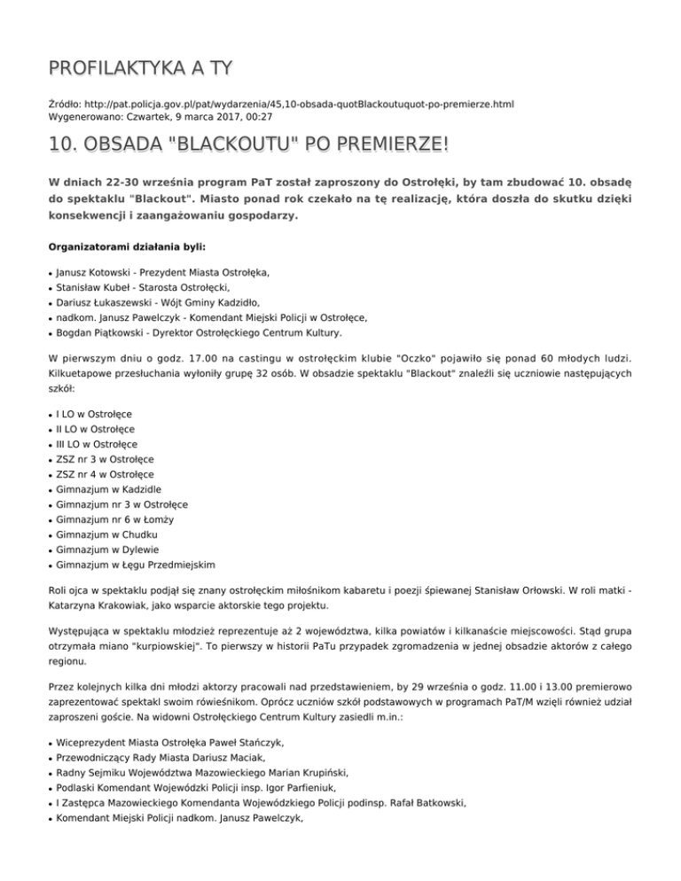 PROFILAKTYKA A TY Źródło: http://pat.policja.gov.pl/pat/wydarzenia/45,10-obsada-quotBlackoutuquot-po-premierze.html Wygenerowano: Czwartek, 9 marca 2017, 00:27 10. OBSADA "BLACKOUTU" PO PREMIERZE! W dniach 22-30 września program PaT został zaproszony do Ostrołęki, by tam zbudować 10. obsadę do spektaklu "Blackout". Miasto ponad rok czekało na tę realizację, która doszła do skutku dzięki konsekwencji i zaangażowaniu gospodarzy. Organizatorami działania byli: ● Janusz Kotowski - Prezydent Miasta Ostrołęka, ● Stanisław Kubeł - Starosta Ostrołęcki, ● Dariusz Łukaszewski - Wójt Gminy Kadzidło, ● nadkom. Janusz Pawelczyk - Komendant Miejski Policji w Ostrołęce, ● Bogdan Piątkowski - Dyrektor Ostrołęckiego Centrum Kultury. W pierwszym dniu o godz. 17.00 na castingu w ostrołęckim klubie "Oczko" pojawiło się ponad 60 młodych ludzi. Kilkuetapowe przesłuchania wyłoniły grupę 32 osób. W obsadzie spektaklu "Blackout" znaleźli się uczniowie następujących szkół: ● I LO w Ostrołęce ● II LO w Ostrołęce ● III LO w Ostrołęce ● ZSZ nr 3 w Ostrołęce ● ZSZ nr 4 w Ostrołęce ● Gimnazjum w Kadzidle ● Gimnazjum nr 3 w Ostrołęce ● Gimnazjum nr 6 w Łomży ● Gimnazjum w Chudku ● Gimnazjum w Dylewie ● Gimnazjum w Łęgu Przedmiejskim Roli ojca w spektaklu podjął się znany ostrołęckim miłośnikom kabaretu i poezji śpiewanej Stanisław Orłowski. W roli matki Katarzyna Krakowiak, jako wsparcie aktorskie tego projektu. Występująca w spektaklu młodzież reprezentuje aż 2 województwa, kilka powiatów i kilkanaście miejscowości. Stąd grupa otrzymała miano "kurpiowskiej". To pierwszy w historii PaTu przypadek zgromadzenia w jednej obsadzie aktorów z całego regionu. Przez kolejnych kilka dni młodzi aktorzy pracowali nad przedstawieniem, by 29 września o godz. 11.00 i 13.00 premierowo zaprezentować spektakl swoim rówieśnikom. Oprócz uczniów szkół podstawowych w programach PaT/M wzięli również udział zaproszeni goście. Na widowni Ostrołęckiego Centrum Kultury zasiedli m.in.: ● Wiceprezydent Miasta Ostrołęka Paweł Stańczyk, ● Przewodniczący Rady Miasta Dariusz Maciak, ● Radny Sejmiku Województwa Mazowieckiego Marian Krupiński, ● Podlaski Komendant Wojewódzki Policji insp. Igor Parfieniuk, ● I Zastępca Mazowieckiego Komendanta Wojewódzkiego Policji podinsp. Rafał Batkowski, ● Komendant Miejski Policji nadkom. Janusz Pawelczyk, ● komendanci miejscy i powiatowi z terenu Mazowsza, ● przedstawiciele władz oświatowych oraz instytucji zajmujących się profilaktyką i bezpieczeństwem, ● duchowieństwo. 30 września o godz. 10.00 i 12.00 w programach PaT/M uczestniczyli gimnazjaliści z terenu powiatu ostrołęckiego, w tym liczna reprezentacja gminy Kadzidło, której wójt Dariusz Łukaszewski od początku wspierał Ostrołękę w staraniach o realizację programu. Po niewątpliwych sukcesach w Ostrołęce, "obsada kurpiowska" wyruszy na pierwszą część trasy Mazowieckiej do Sochaczewa (15.10.) i Gostynina 16.10.). W dalszych planach jest również Łódź i Łomża. Koordynatorem programu na terenie Ostrołęki jest mł. asp. Sylwester Marczak z KMP. Zdjęcia: asp. sztab. Dariusz Wesołowski Ocena: 0/5 (0) Tweetnij