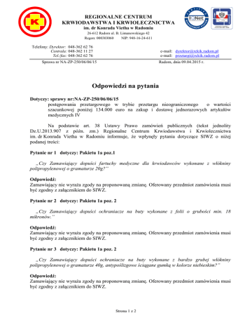 REGIONALNE CENTRUM KRWIODAWSTWA I KRWIOLECZNICTWA im. dr Konrada Vietha w Radomiu 26-612 Radom ul. B. Limanowskiego 42 Regon: 000303060 NIP: 948-16-24-611 Telefony: Dyrektor: 048-362 62 76 Centrala: 048-362 11 27 Tel./fax: 048-362 62 76 e-mail: [email protected] e-mail: [email protected] Sprawa nr NA-ZP-250/06/06/15 Radom, dnia 09.04.2015 r. Odpowiedzi na pytania Dotyczy: sprawy nr:NA-ZP-250/06/06/15 postępowania przetargowego w trybie przetargu nieograniczonego o wartości szacunkowej poniżej 134.000 euro na zakup i dostawę jednorazowych artykułów medycznych IV Na podstawie art. 38 Ustawy Prawo zamówień publicznych (tekst jednolity Dz.U.2013.907 z późn. zm.) Regionalne Centrum Krwiodawstwa i Krwiolecznictwa im. dr Konrada Vietha w Radomiu informuje, że wpłynęły pytania dotyczące SIWZ o niżej podanej treści: Pytanie nr 1 dotyczy: Pakietu 1a poz.1 „Czy Zamawiający dopuści fartuchy medyczne dla krwiodawców wykonane z włókniny polipropylenowej o gramaturze 20g?” Odpowiedź: Zamawiający nie wyraża zgody na proponowaną zmianę. Oferowany przedmiot zamówienia musi być zgodny z załącznikiem do SIWZ. Pytanie nr 2 dotyczy: Pakietu 1a poz. 2 „Czy Zamawiający dopuści ochraniacze na buty wykonane z folii o grubości min. 18 mikronów.” Odpowiedź: Zamawiający nie wyraża zgody na proponowaną zmianę. Oferowany przedmiot zamówienia musi być zgodny z załącznikiem do SIWZ. Pytanie nr 3 dotyczy: Pakietu 1a poz. 2 „Czy Zamawiający dopuści ochraniacze na buty wykonane z bardzo grubej włókniny polipropylenowej o gramaturze 40g, antypoślizgowe ściągane gumką w kolorze niebieskim?” Odpowiedź: Zamawiający nie wyraża zgody na proponowaną zmianę. Oferowany przedmiot zamówienia musi być zgodny z załącznikiem do SIWZ. Strona 1 z 2 Pytanie nr 4 dotyczy: Pakietu 1a poz. 5 „Czy Zamawiający dopuści jednorazowe podkłady higieniczne podkłady ochronne wykonane z 2-warstwowej celulozy. Rozmiar listka 50x38cm, 135 listków w rolce. Gramatura 34g/m2. Podkłady bez nasączenia środkiem bakteriostatycznym?” Odpowiedź: Zamawiający nie wyraża zgody na proponowaną zmianę. Oferowany przedmiot zamówienia musi być zgodny z załącznikiem do SIWZ. Podpisał Dyrektor RCKiK mgr Józef Waniek Strona 2 z 2