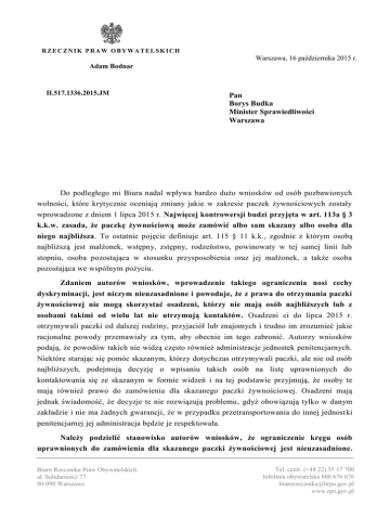 RZECZNIK PRAW OBYWATELSKICH Warszawa, 16 października 2015 r. Adam Bodnar II.517.1336.2015.JM Pan Borys Budka Minister Sprawiedliwości Warszawa Do podległego mi Biura nadal wpływa bardzo dużo wniosków od osób pozbawionych wolności, które krytycznie oceniają zmiany jakie w zakresie paczek żywnościowych zostały wprowadzone z dniem 1 lipca 2015 r. Najwięcej kontrowersji budzi przyjęta w art. 113a § 3 k.k.w. zasada, że paczkę żywnościową może zamówić albo sam skazany albo osoba dla niego najbliższa. To ostatnie pojęcie definiuje art. 115 § 11 k.k., zgodnie z którym osobą najbliższą jest małżonek, wstępny, zstępny, rodzeństwo, powinowaty w tej samej linii lub stopniu, osoba pozostająca w stosunku przysposobienia oraz jej małżonek, a także osoba pozostająca we wspólnym pożyciu. Zdaniem autorów wniosków, wprowadzenie takiego ograniczenia nosi cechy dyskryminacji, jest niczym nieuzasadnione i powoduje, że z prawa do otrzymania paczki żywnościowej nie mogą skorzystać osadzeni, którzy nie mają osób najbliższych lub z osobami takimi od wielu lat nie utrzymują kontaktów. Osadzeni ci do lipca 2015 r. otrzymywali paczki od dalszej rodziny, przyjaciół lub znajomych i trudno im zrozumieć jakie racjonalne powody przemawiały za tym, aby obecnie im tego zabronić. Autorzy wniosków podają, że powodów takich nie widzą często również administracje jednostek penitencjarnych. Niektóre starając się pomóc skazanym, którzy dotychczas otrzymywali paczki, ale nie od osób najbliższych, podejmują decyzję o wpisaniu takich osób na listę uprawnionych do kontaktowania się ze skazanym w formie widzeń i na tej podstawie przyjmują, że osoby te mają również prawo do zamówienia dla skazanego paczki żywnościowej. Osadzeni mają jednak świadomość, że decyzje te nie rozwiązują problemu, gdyż obowiązują tylko w danym zakładzie i nie ma żadnych gwarancji, że w przypadku przetransportowania do innej jednost ki penitencjarnej jej administracja będzie je respektowała. Należy podzielić stanowisko autorów wniosków, że ograniczenie kręgu osób uprawnionych do zamówienia dla skazanego paczki żywnościowej jest nieuzasadnione. Biuro Rzecznika Praw Obywatelskich al. Solidarności 77 00-090 Warszawa Tel. centr. (+48 22) 55 17 700 Infolinia obywatelska 800 676 676 [email protected] www.rpo.gov.pl Trudno zgodzić się z argumentem przedstawionym w odpowiedzi Pana Ministra (pismo z dnia 11 sierpnia 2015 r. DL-III-072-14/15/4) na wcześniejsze pismo Rzecznika Praw Obywatelskich w tej sprawie, że powodem wprowadzenia takiego ograniczenia „była chęć uniknięcia konieczności przyjmowania przez skazanego niechcianych produktów” przesyłanych w paczkach. Uważam, że niesłusznie założono, iż tylko osoba najbliższa dla skazanego wie najlepiej czego on potrzebuje. Należy przyjąć, że najlepszą wiedzę na ten temat posiada osoba, z którą skazany utrzymuje stały kontakt m.in. w formie korespondencji i rozmów telefonicznych, a często nie jest to osoba najbliższa. Ponadto, nie podzielam stanowiska przedstawionego w wyżej wymienionej odpowiedzi Pana Ministra, że członek dalszej rodziny lub inna osoba bliska (nie najbliższa), chcąc przekazać skazanemu artykuły żywnościowe lub wyroby tytoniowe może, zamiast składać zamówienie na paczkę, przelać na rachunek skazanego środki, jakie na ich zakup przeznacza, a wówczas skazany sam „będzie mógł dokonać takiego samego zakupu, spośród tego samego asortymentu, pokrywając koszty w tej samej wysokości”. W takim przypadku skazany istotnie będzie mógł zamówić dla siebie paczkę, wybierając produkty z tego samego wykazu i płacąc za nie tyle samo co składające zamówienie osoby najbliższe, jednak wybierze tych produktów dużo mniej, gdyż dokona zakupu jedynie za część kwoty, która zostanie mu przekazana. Zgodnie bowiem z art. 126 § 2 pkt 3 k.k.w. z każdego wpływu pieniężnego skazanego potrąca się 50 %, jednak nie więcej niż 4 % jednego przeciętnego miesięcznego wynagrodzenia pracowników, z przeznaczeniem na tzw. żelazną kasę. W 2014 r. przeciętne miesięczne wynagrodzenie w gospodarce narodowej wynosiła 3 783,46 zł , a jego 4 % to około 150 zł. Przyjęte w art. 113a § 3 k.k.w. ograniczenie kręgu osób uprawnionych do złożenie zamówienia, na paczkę żywnościową dla skazanego, do osoby najbliższej spowodowało, że skazani, którzy takiej osoby nie mają lub nie utrzymują z nią kontaktu, znaleźli się w znacznie gorszej sytuacji. Zachowując kodeksowe prawo do otrzymania paczki żywnościowej i mając osobę, która chce ją dla nich zamówić, nie mogą z tego prawa skorzystać na takiej samej zasadzie jak pozostali. W związku z powyższym uprzejmie proszę Pana Ministra o podjęcie inicjatywy legislacyjnej w celu zmiany art. 113a § 3 k.k.w., poprzez przyjęcie w nim, że paczkę dla skazanego może zamówić każda osoba, z którą skazany utrzymuje kontakt w formie korespondencji, widzeń i rozmów telefonicznych. Podpis na oryginale -2-