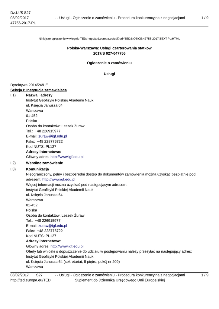 Dz.U./S S27 08/02/2017 47756-2017-PL - - Usługi - Ogłoszenie o zamówieniu - Procedura konkurencyjna z negocjacjami 1/9 Niniejsze ogłoszenie w witrynie TED: http://ted.europa.eu/udl?uri=TED:NOTICE:47756-2017:TEXT:PL:HTML Polska-Warszawa: Usługi czarterowania statków 2017/S 027-047756 Ogłoszenie o zamówieniu Usługi Dyrektywa 2014/24/UE Sekcja I: Instytucja zamawiająca I.1) Nazwa i adresy Instytut Geofizyki Polskiej Akademii Nauk ul. Księcia Janusza 64 Warszawa 01-452 Polska Osoba do kontaktów: Leszek Żuraw Tel.: +48 226915977 E-mail: [email protected] Faks: +48 228776722 Kod NUTS: PL127 Adresy internetowe: Główny adres: http://www.igf.edu.pl I.2) Wspólne zamówienie I.3) Komunikacja Nieograniczony, pełny i bezpośredni dostęp do dokumentów zamówienia można uzyskać bezpłatnie pod adresem: http://www.igf.edu.pl Więcej informacji można uzyskać pod następującym adresem: Instytut Geofizyki Polskiej Akademii Nauk ul. Księcia Janusza 64 Warszawa 01-452 Polska Osoba do kontaktów: Leszek Żuraw Tel.: +48 226915977 E-mail: [email protected] Faks: +48 228776722 Kod NUTS: PL127 Adresy internetowe: Główny adres: http://www.igf.edu.pl Oferty lub wnioski o dopuszczenie do udziału w postępowaniu należy przesyłać na następujący adres: Instytut Geofizyki Polskiej Akademii Nauk ul. Księcia Janusza 64 (sekretariat, II piętro, pokój nr 209) Warszawa 08/02/2017 S27 http://ted.europa.eu/TED - - Usługi - Ogłoszenie o zamówieniu - Procedura konkurencyjna z negocjacjami Suplement do Dziennika Urzędowego Unii Europejskiej 1/9 Dz.U./S S27 08/02/2017 47756-2017-PL - - Usługi - Ogłoszenie o zamówieniu - Procedura konkurencyjna z negocjacjami 2/9 01-452 Polska Osoba do kontaktów: Leszek Żuraw Tel.: +48 226915977 E-mail: [email protected] Faks: +48 228776722 Kod NUTS: PL127 Adresy internetowe: Główny adres: http://www.igf.edu.pl I.4) Rodzaj instytucji zamawiającej Podmiot prawa publicznego I.5) Główny przedmiot działalności Inna działalność: działalność naukowa Sekcja II: Przedmiot II.1) Wielkość lub zakres zamówienia II.1.1) Nazwa: Czarter jednostki pływającej wraz z załogą w celu odbycia dwóch rejsów na Svalbard w 2017 r. Numer referencyjny: ZP/02/17 II.1.2) Główny kod CPV 63726400 II.1.3) Rodzaj zamówienia Usługi II.1.4) Krótki opis: Przedmiotem umowy jest czarter statku wraz z załogą w celu odbycia dwóch rejsów na Svalbard w 2017 r., w tym: 1. przetransportowania osób i ładunku na trasie: dowolny port morski na terytorium RP – Polska Stacja Polarna Hornsund; 2. przetransportowania osób i ładunku na trasach lokalnych na terytorium Svalbardu (w ramach trasy: Hornsund – Longyearbyen – Petunia – Kaffioyra – Bellsund – Hornsund); 3. przetransportowania osób i ładunku na trasie Polska Stacja Polarna Hornsund – dowolny port morski na terytorium RP, w tym umożliwienia Zamawiającemu przeprowadzenia prac badawczo-naukowych na morzu Grenlandzkim w ramach rejsu I. II.1.5) Szacunkowa całkowita wartość II.1.6) Informacje o częściach To zamówienie podzielone jest na części: nie II.2) Opis II.2.1) Nazwa: II.2.2) Dodatkowy kod lub kody CPV II.2.3) Miejsce świadczenia usług Kod NUTS: PL6 II.2.4) Opis zamówienia: 1. Przedmiotem zamówienia jest czarter statku wraz z załogą w celu odbycia dwóch rejsów na Svalbard w 2017 r., w tym: 08/02/2017 S27 http://ted.europa.eu/TED - - Usługi - Ogłoszenie o zamówieniu - Procedura konkurencyjna z negocjacjami Suplement do Dziennika Urzędowego Unii Europejskiej 2/9 Dz.U./S S27 08/02/2017 47756-2017-PL - - Usługi - Ogłoszenie o zamówieniu - Procedura konkurencyjna z negocjacjami 3/9 1) przetransportowania osób i ładunku na trasie: dowolny port morski na terytorium RP – Polska Stacja Polarna Hornsund; 2) przetransportowania osób i ładunku na trasach lokalnych na terytorium Svalbardu (w ramach trasy: Hornsund – Longyearbyen – Petunia – Kaffioyra – Bellsund – Hornsund); 3) przetransportowania osób i ładunku na trasie Polska Stacja Polarna Hornsund – dowolny port morski na terytorium RP, w tym umożliwienia Zamawiającemu przeprowadzenia prac badawczo-naukowych na morzu Grenlandzkim w ramach rejsu I. 2. Planowane terminy i czas trwania rejsów: 1) Rejs I: Czerwiec/Lipiec 2017 r. – około 25 dni; 2) Rejs II: wrzesień 2017 r. – około 20 dni. Szczegółowe trasy i harmonogramy poszczególnych rejsów będą przedmiotem negocjacji z Wykonawcami. 3. Zamówienie musi być zrealizowane za pomocą jednostki pływającej spełniającej niżej wymienione wymagania: 1) klasa lodowa (znak wzmocnień lodowych): nie niższa niż L2 według klasyfikacji Polskiego Rejestru Statków (lub ekwiwalentna klasa lodowa według innych klasyfikacji); 2) spełnianie aktualnych wymogów dotyczących żeglugi na wodach Svalbardu; 3) posiadanie co najmniej 12 miejsc do dyspozycji Zamawiającego do transportu osób w trakcie trwania każdego z rejsów; 3 4) możliwość transportu (do dyspozycji Zamawiającego) co najmniej 150 m ładunku w trakcie trwania każdego z rejsów, w tym: 3 a) zamknięta ładownia: co najmniej 100 m ; 3 b) komora chłodnicza: co najmniej 5 m ; 3 c) komora głębokiego mrożenia: co najmniej 3 m ; 5) możliwość transportu: a) 10-stopowego kontenera; b) zbiorników z 3000 litrów benzyny; c) pojazdu kołowego typu Unimog; 6) posiadanie urządzeń umożliwiających załadunek/rozładunek i przeładunek na otwartym morzu (w tym dźwigu o nośności maksymalnej co najmniej 2,0 t); 7) posiadanie na wyposażeniu statku łodzi transportowej wraz z załogą. II.2.5) Kryteria udzielenia zamówienia Kryteria określone poniżej Kryterium jakości - Nazwa: Ilość miejsc, które będą do dyspozycji Zamawiającego w trakcie trwania każdego z rejsów / Waga: 20 Kryterium jakości - Nazwa: Maksymalna nośność dźwigu znajdującego się na wyposażeniu jednostki pływającej / Waga: 10 Kryterium jakości - Nazwa: Kubatura zamkniętej ładowni pozostawiona do dyspozycji
