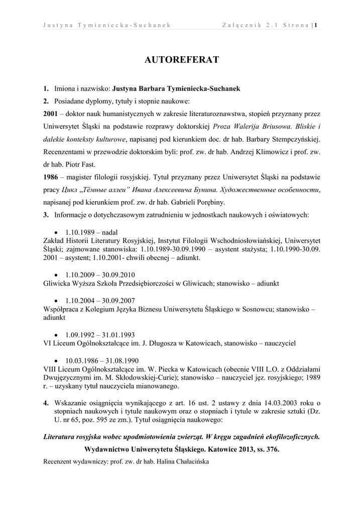 Justyna Tymieniecka-Suchanek Załączni k 2 .1 Str o na |1 AUTOREFERAT 1. Imiona i nazwisko: Justyna Barbara Tymieniecka-Suchanek 2. Posiadane dyplomy, tytuły i stopnie naukowe: 2001 – doktor nauk humanistycznych w zakresie literaturoznawstwa, stopień przyznany przez Uniwersytet Śląski na podstawie rozprawy doktorskiej Proza Walerija Briusowa. Bliskie i dalekie konteksty kulturowe, napisanej pod kierunkiem doc. dr hab. Barbary Stempczyńskiej. Recenzentami w przewodzie doktorskim byli: prof. zw. dr hab. Andrzej Klimowicz i prof. zw. dr hab. Piotr Fast. 1986 – magister filologii rosyjskiej. Tytuł przyznany przez Uniwersytet Śląski na podstawie pracy Цикл „Тёмные аллеи” Ивана Алексеевича Бунина. Художественные особенности, napisanej pod kierunkiem prof. zw. dr hab. Gabrieli Porębiny. 3. Informacje o dotychczasowym zatrudnieniu w jednostkach naukowych i oświatowych: 1.10.1989 – nadal Zakład Historii Literatury Rosyjskiej, Instytut Filologii Wschodniosłowiańskiej, Uniwersytet Śląski; zajmowane stanowiska: 1.10.1989-30.09.1990 – asystent stażysta; 1.10.1990-30.09. 2001 – asystent; 1.10.2001- chwili obecnej – adiunkt. 1.10.2009 – 30.09.2010 Gliwicka Wyższa Szkoła Przedsiębiorczości w Gliwicach; stanowisko – adiunkt 1.10.2004 – 30.09.2007 Współpraca z Kolegium Języka Biznesu Uniwersytetu Śląskiego w Sosnowcu; stanowisko – adiunkt 1.09.1992 – 31.01.1993 VI Liceum Ogólnokształcące im. J. Długosza w Katowicach, stanowisko – nauczyciel 10.03.1986 – 31.08.1990 VIII Liceum Ogólnokształcące im. W. Piecka w Katowicach (obecnie VIII L.O. z Oddziałami Dwujęzycznymi im. M. Skłodowskiej-Curie); stanowisko – nauczyciel jęz. rosyjskiego; 1989 r. – uzyskany tytuł nauczyciela mianowanego. 4. Wskazanie osiągnięcia wynikającego z art. 16 ust. 2 ustawy z dnia 14.03.2003 roku o stopniach naukowych i tytule naukowym oraz o stopniach i tytule w zakresie sztuki (Dz. U. nr 65, poz. 595 ze zm.). Tytuł osiągnięcia naukowego: Literatura rosyjska wobec upodmiotowienia zwierząt. W kręgu zagadnień ekofilozoficznych. Wydawnictwo Uniwersytetu Śląskiego. Katowice 2013, ss. 376. Recenzent wydawniczy: prof. zw. dr hab. Halina Chałacińska Justyna Tymieniecka-Suchanek Załączni k 2 .1 Str o na |2 4.1. Geneza rozprawy: Animal studies stanowią jeden z najważniejszych obszarów moich badań już od czasu studiów magisterskich, które podjęłam w 1981 r., kiedy w kręgu zainteresowań naukowych znalazła się biokomunikacja. Na początku mojej drogi zawodowej na uczelni w 1989 r. zrodził się pomysł studiów nad relacją człowiek – zwierzęta w literaturze rosyjskiej, a więc w polskiej rusycystyce jestem pionierem badań zwanych obecnie animal studies. Poszukiwałam w utworach literackich obrazów zwierząt jako żyjących z nami istot, a nie jako środków językowo-stylistycznych czegoś innego, interesował mnie etyczny wymiar problemu, a więc literatura rosyjska w trosce o zwierzęta. 4.2. Streszczenie metodologiczne i merytoryczne osiągnięcia naukowego: Przedłożona rozprawa naukowa dotyczy interdyscyplinarnie rozumianego ekofilozoficznego zagadnienia statusu aksjologicznego zwierząt w literaturze rosyjskiej od połowy XIX stulecia do czasów najnowszych. W aspekcie metodologicznym wykorzystałam do badań literaturoznawczych aparaturę i wiedzę ekofilozoficzną jako odnośnik metodologiczny całokształtu pracy. Dotąd nie analizowano relacji człowiek – zwierzę w literaturze rosyjskiej, ale prócz novum z zakresu tematyki i problematyki, zaproponowałam nowy program metodologiczny polegający na tym, że tradycyjną analizę połączyłam z wiedzą etologiczną, ekologiczną, zoosemiotyczną i in. Połączenie dwóch dróg poszukiwań – tradycyjnej (literaturoznawczej) i nowej (etologicznoekologicznej) dało oryginalny rezultat badawczy. Warto podkreślić, że utwory literackie nie stanowiły dla mnie pretekstu do omawiania problemów ekofilozofii, ponieważ przyjęta przeze mnie metodologia mieści się w najnowszym nurcie badawczym literaturoznawstwa zwanym ekokrytyką, która promuje studia, polegające na poszukiwaniu nowych konfiguracji między ludzkim gatunkiem a resztą uniwersum. Krytyka ekologiczna staje się szczególnym sposobem czytania literatury zarówno najnowszej, jak i dawnej, bowiem zakłada, że niemal w każdym dziele pisarz podświadomie buduje jakąś, ścisłą bądź luźną, relację pomiędzy zawartą w nim treścią a światem przyrody. Recepcja literatury omawianej w aspekcie ekokrytyki wysuwa na plan pierwszy problem relacji między ludźmi a nie-ludźmi. Ekokrytyka nie uznaje utworu literackiego jako samodzielnego i niezależnego tworu estetycznego, pozbawionego powiązań z rzeczywistością funkcjonującą poza tekstem. Dlatego w monografii wyraźnie sygnalizuję, że z rozmysłem rozmijam się z literaturoznawczą świadomością różnicującą dwuwartościową jedność „autor-tekst”, ponieważ tekst artystyczny w przedłożonym studium jest skorelowany z biograficznym aspektem (autor spoza dzieła), a więc tekstem nietożsamym z artystyczną formą wyrazu. Problem ten istnieje w zasadzie poza wypracowaną w monografii metodologią, wyraźnie skupioną na budowaniu odmiennego metakontekstu (teoretyczno-artystycznego), w Justyna Tymieniecka-Suchanek Załączni k 2 .1 Str o na |3 którym biografia istnieje na odpowiedniej doń, immanentnej zasadzie. Przyjmując założenia ekokrytyki sądzę, że natura nie jest wyłącznie strukturą dyskursywną, co nie znaczy, iż należy traktować pojęcie natury jako wyraziste i dane a priori. Ekokrytyka kategoryzuje, waloryzuje i problematyzuje koncept natury, pokazując jej rozliczne uwikłania w kontekst społecznohistoryczny, ale jednocześnie opowiada się za realnością tego, co kryje się pod określeniem „środowiska naturalnego” czy ”przyrody”. Projekt rozprawy stanowi