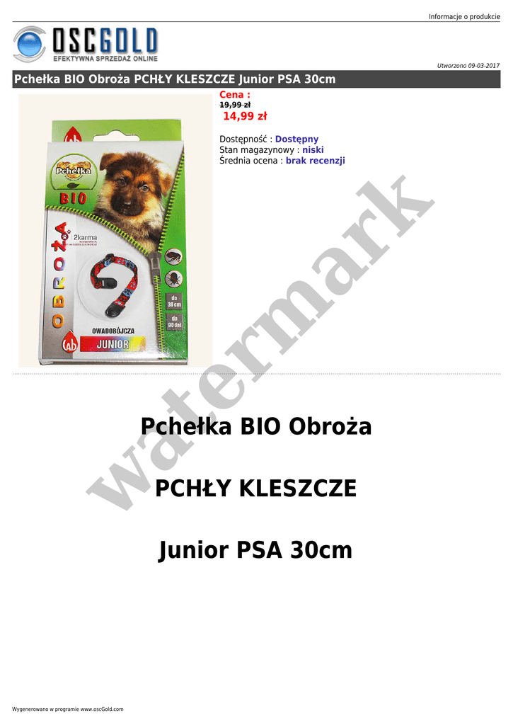 Informacje o produkcie Utworzono 09-03-2017 Pchełka BIO Obroża PCHŁY KLESZCZE Junior PSA 30cm Cena : 19,99 zł 14,99 zł er m ar k Dostępność : Dostępny Stan magazynowy : niski Średnia ocena : brak recenzji w at Pchełka BIO Obroża PCHŁY KLESZCZE Junior PSA 30cm Wygenerowano w programie www.oscGold.com er m ar k at w Przeznaczenie Kolorowa obroża przeciw pchłom i kleszczom dla psów i szczeniąt w wieku powyżej 4 tygodni. Charakterystyka ● ● ● ● ● ● ● Owadobójcza obroża przeznaczona do zwalczania pcheł i kleszczy u psów w wieku powyżej 3 miesięcy. Idealna dla szczeniąt i psów małych ras. Wygodna w użyciu dzięki zapięciu typu "klik" i łatwej regulacji długości. Substancje aktywne obroży nie powodują alergii i podrażnień delikatnej skóry i sierści psa. Taśmę obroży nasączono środkiem odpornym na działanie wody, zawierającym substancje Informacje o produkcie ● czynne: 10,0% fipronil, 1,0% pyriproxifen. Efekt obroży obserwuje się zwykle w ciągu 1-2 dni. Wskazania lecznicze ● Zwalcza pchły i kleszcze poprzez: zabijanie i odstraszanie dorosłych pcheł niszczenie jaj pcheł i ich larw przerywanie cyklu rozwojowego pchły w otoczeniu w którym znajduje się kot (np. legowisko, dywany itp.) zabijanie i odstraszanie kleszczy zabezpiecza przed ukłuciami komarów ❍ ❍ ❍ ❍ Przeciwwskazania ● ● ● ● Produktu nie należy stosować u szczeniąt w wieku poniżej 4 tygodni życia oraz suk karmiących. Nie stosować produktu u zwierząt chorych lub ze zmianami skórnymi. Sposób użycia ● ● ● ● Dopasować długość obroży do obwodu szyi psa za pomocą klamerki i zapiąć spinkę. Obroża działa od momentu założenia w czasie do 3 miesięcy na pchły i do 4 tygodni na kleszcze. Zużytą obrożę wyrzucić do śmieci razem z opakowaniem. at ● er m ar k ❍ w Wielkość opakowania 1 obroża o długości 30 cm Wygenerowano w programie www.oscGold.com