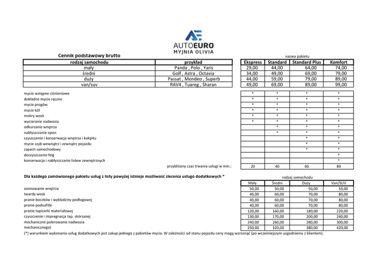 Cennik podstawowy brutto rodzaj samochodu mały średni duży van/suv nazwa pakietu przykład Panda , Polo , Yaris Golf , Astra , Octavia Passat , Mondeo , Superb RAV4 , Tuareg , Sharan mycie wstępne ciśnieniowe dokładne mycie ręczne mycie progów mycie kół mokry wosk wycieranie nadwozia odkurzanie wnętrza nabłyszczanie opon czyszczenie i konserwacja wnętrza i kokpitu mycie szyb wewnątrz i zewnątrz pojazdu zapach samochodowy doczyszczanie felg konserwacja i nabłyszczanie listew zewnętrznych przybliżony czas trwania usługi w min.: Ekspress 29,00 34,00 44,00 49,00 Standard 44,00 49,00 59,00 69,00 Standard Plus 64,00 69,00 79,00 89,00 Komfort 74,00 79,00 89,00 99,00 * * * * * * * * * * * * * * * * * * * * * * * * * 20 40 60 * * * * * * * * * * * * * 80 Dla każdego zamówionego pakietu usług z listy powyżej istnieje możliwość zlecenia usługo dodatkowych * rodzaj samochodu Mały Średni Duży ozonowanie wnętrza 50,00 50,00 50,00 twardy wosk 40,00 60,00 70,00 pranie boczków i wykładziny podłogowej 40,00 60,00 70,00 pranie podsufitki 40,00 60,00 70,00 pranie tapicerki materiałowej 120,00 160,00 180,00 czyszczenie i impregnacja tap. skórzanej 130,00 170,00 200,00 przygotowanie pojazdu do nadwozia sprzedaży (nie zawiera polerowania mechaniczne polerowanie 240,00 260,00 280,00 mechanicznego) 250,00 320,00 380,00 (*) warunkiem wykonania usług dodatkowych jest zakup jednego z pakietów mycia. W zależności od stanu pojazdu ceny mogą wzrosnąć (po wcześniejszym uzgodnieniu z klientem). Van/SUV 50,00 80,00 80,00 80,00 220,00 240,00 300,00 420,00