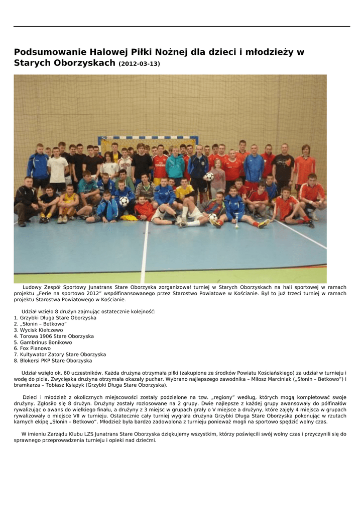 Podsumowanie Halowej Piłki Nożnej dla dzieci i młodzieży w Starych Oborzyskach (2012-03-13) Ludowy Zespół Sportowy Junatrans Stare Oborzyska zorganizował turniej w Starych Oborzyskach na hali sportowej w ramach projektu „Ferie na sportowo 2012” współfinansowanego przez Starostwo Powiatowe w Kościanie. Był to już trzeci turniej w ramach projektu Starostwa Powiatowego w Kościanie. Udział wzięło 8 drużyn zajmując ostatecznie kolejność: 1. Grzybki Długa Stare Oborzyska 2. „Słonin – Betkowo” 3. Wycisk Kiełczewo 4. Torowa 1906 Stare Oborzyska 5. Gambrinus Bonikowo 6. Fox Pianowo 7. Kultywator Zatory Stare Oborzyska 8. Blokersi PKP Stare Oborzyska Udział wzięło ok. 60 uczestników. Każda drużyna otrzymała piłki (zakupione ze środków Powiatu Kościańskiego) za udział w turnieju i wodę do picia. Zwycięska drużyna otrzymała okazały puchar. Wybrano najlepszego zawodnika – Miłosz Marciniak („Słonin – Betkowo”) i bramkarza – Tobiasz Książyk (Grzybki Długa Stare Oborzyska). Dzieci i młodzież z okolicznych miejscowości zostały podzielone na tzw. „regiony” według, których mogą kompletować swoje drużyny. Zgłosiło się 8 drużyn. Drużyny zostały rozlosowane na 2 grupy. Dwie najlepsze z każdej grupy awansowały do półfinałów rywalizując o awans do wielkiego finału, a drużyny z 3 miejsc w grupach grały o V miejsce a drużyny, które zajęły 4 miejsca w grupach rywalizowały o miejsce VII w turnieju. Ostatecznie cały turniej wygrała drużyna Grzybki Długa Stare Oborzyska pokonując w rzutach karnych ekipę „Słonin – Betkowo”. Młodzież była bardzo zadowolona z turnieju ponieważ mogli na sportowo spędzić wolny czas. W imieniu Zarządu Klubu LZS Junatrans Stare Oborzyska dziękujemy wszystkim, którzy poświęcili swój wolny czas i przyczynili się do sprawnego przeprowadzenia turnieju i opieki nad dziećmi. Powered by TCPDF (www.tcpdf.org)
