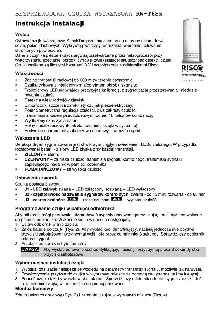 BEZPRZEWODOWA CZUJKA WSTRZĄSOWA RW-T6Sx Instrukcja instalacji Wstęp Cyfrowe czujki wstrząsowe ShockTec przeznaczone są do ochrony okien, drzwi, ścian, połaci dachowych. Wykrywają wstrząsy, uderzenia, wiercenie, piłowanie chronionych powierzchni. Dane z czujnika piezoelektrycznego są przetwarzane przez mikroprocesor przy wykorzystaniu specjalnej obróbki cyfrowej zwiększającej skuteczność detekcji czujki. Czujki zasilane są litowymi bateriami 3 V i współpracują z odbiornikami Risco. Właściwości • • • • • • • • • • Zasięg transmisji radiowej do 300 m (w terenie otwartym); Czujka cyfrowa z inteligentnym algorytmem obróbki sygnału; Trójkolorowy LED ułatwiający precyzyjną kalibrację, z sygnalizacją przesterowania i niedosterowania czułości; Detekcja wielu rodzajów zjawisk; Bimorficzny, szczelnie zamknięty czujnik piezoelektryczny; Potencjometryczna regulacja czułości, dwa zakresy czułości; Transmisja z kodem pseudolosowym, ponad 16 milionów kombinacji; Wydłużony czas życia baterii; Pełny nadzór radiowy (kontrola obecności czujki w systemie); Podwójna ochrona antysabotażowa obudowy – wierzch i spód. Wskazania LED Detekcja drgań sygnalizowana jest chwilowym ciągłym świeceniem LEDu zielonego. W przypadku rozładowanej baterii - zielony LED błyska przy każdej transmisji. • ZIELONY – alarm; • CZERWONY – za niska czułość, transmisja sygnału kontrolnego, transmisja sygnału zapisującego nadajnik w pamięci odbiornika; • POMARAŃCZOWY – za wysoka czułość. Ustawienia zworek Czujka posiada 3 zworki: • J1 - LED zał/wył: zwarta – LED załączony; rozwarta – LED wyłączony; • J2 - częstotliwość nadawania sygnałów kontrolnych: zwarta - co 15 min; rozwarta - co 65 min – niska czułość; – wysoka czułość. • J3 - zakres czułości: Programowanie czujki w pamięci odbiornika Aby odbiornik mógł poprawnie interpretować sygnały nadawane przez czujkę, musi być ona wpisana do pamięci odbiornika. Wykonuje się to w sposób następujący: 1. Ustaw odbiornik w tryb zapisu. 2. Załóż baterię do czujki (Rys. 2). Aby wysłać kod identyfikujący, naciśnij jednocześnie obydwa przyciski sabotażowe i przytrzymaj wciśnięte przez co najmniej 3 sekundy. Sprawdź, czy odbiornik odebrał sygnał. 3. Przełącz odbiornik w tryb normalny. UWAGA: Aby wysłać ponownie kod identyfikujący, naciśnij i przytrzymaj przez 3 sekundy oba przyciski sabotażowe Wybór miejsca instalacji czujki 1. Wybierz lokalizację najlepszą ze względu na parametry transmisji sygnału, możliwie jak najwyżej. 2. Prowizorycznie przytwierdź czujkę w wybranym miejscu za pomocą dwustronnej taśmy klejącej. 3. Pobudź czujkę tak, by weszła w stan alarmu. Sprawdź, czy odbiornik odebrał sygnał z czujki. Jeśli nie, przenieś czujkę w inne miejsce i spróbuj ponownie. Montaż końcowy Zdejmij wierzch obudowy (Rys. 3) i zamontuj czujkę w wybranym miejscu (Rys. 4). Procedura instalacji 1. Wybierz miejsce instalacji czujki, oczyść i wyrównaj powierzchnię w miejscu montażu. Sprawdź w Tabeli 1 zasięgi działania czujki w zależności od rodzaju materiału podłoża. 2. Wyreguluj czułość: a. Przetestuj działanie czujki uderzając twardym przedmiotem w obszarze działania czujki. b. Wyreguluj czułość potencjometrem czułości (w prawo – zwiększanie, w lewo – zmniejszanie). c. W przypadku zbyt dużej czułości – zdejmij zworkę czułości, aby zmniejszyć zakres (zwarta – czułość wyższa, rozwarta – niższa). 3. Załóż obudowę. TABELA 1: Typowe zasięgi detekcji Podłoże Beton Cegła Stal Szkło Drewno Sklejka Promień 1,5 m 2,5 m 3m 3,5 m 3,5 m 4m W tabeli podano wartości typowe. Każdą czujkę należy przetestować w miejscu zainstalowania. Dane techniczne Elektryczne Typ baterii: CR123 3V litowa Pobór prądu: 10µA w trybie spoczynkowym Częstotliwość: RWT6SW86800A/RWT6SB86800A: 868.65 MHz RWT6SW43300A/RWT6SB43300A: 433.92 MHz Środowiskowe Sygnał kontrolny: Co 15/65 minut Rodzaj modulacji: ASK Odporność RF:40V/m 80MHz do 1GHz Czas życia baterii: 5 lat Zakres temperatur pracy: 0°C do 55°C Wymiary: 81 x 35 x 32 mm Temperatura składowania: -20°C do 60°C Maksymalna wilgotność: 95% bez kondensacji Rys. 4 J2 MIN MAX SW1 J1 CZUJNIK PIEZO a CZUŁOŚCI J3 LD1 SW2 CZUŁOŚĆ WYSOKA/NISKA b - Symbole handlowe Symbol RWT6SW86800A RWT6SB86800A RWT6SW43300A RWT6SB43300A Opis Czujka wstrząsowa z nadajnikiem 868.65 MHz – biała Czujka wstrząsowa z nadajnikiem 868.65 MHz – brązowa Czujka wstrząsowa z nadajnikiem 433.92 MHz – biała Czujka wstrząsowa z nadajnikiem 433.92 MHz – brązowa Dystrybutor Ul. Płomyka 2 02 – 490 W arszawa Email: [email protected] http:// www.janexint.com.pl tel. (022) 863-63-53