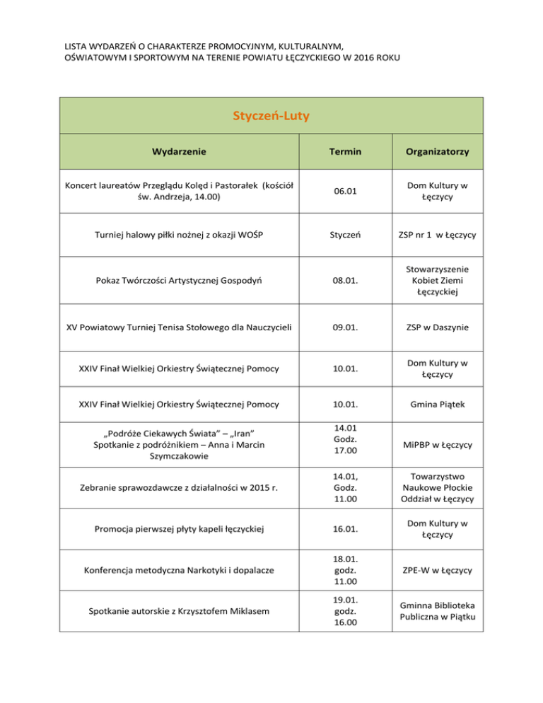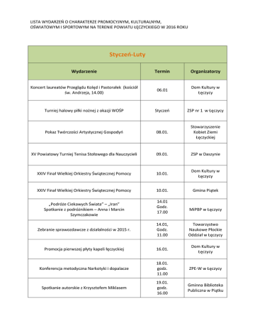 LISTA WYDARZEO O CHARAKTERZE PROMOCYJNYM, KULTURALNYM, OŚWIATOWYM I SPORTOWYM NA TERENIE POWIATU ŁĘCZYCKIEGO W 2016 ROKU Styczeń-Luty Wydarzenie Termin Organizatorzy Koncert laureatów Przeglądu Kolęd i Pastorałek (kościół św. Andrzeja, 14.00) 06.01 Dom Kultury w Łęczycy Turniej halowy piłki nożnej z okazji WOŚP Styczeo ZSP nr 1 w Łęczycy Pokaz Twórczości Artystycznej Gospodyo 08.01. Stowarzyszenie Kobiet Ziemi Łęczyckiej XV Powiatowy Turniej Tenisa Stołowego dla Nauczycieli 09.01. ZSP w Daszynie XXIV Finał Wielkiej Orkiestry Świątecznej Pomocy 10.01. Dom Kultury w Łęczycy XXIV Finał Wielkiej Orkiestry Świątecznej Pomocy 10.01. Gmina Piątek „Podróże Ciekawych Świata” – „Iran” Spotkanie z podróżnikiem – Anna i Marcin Szymczakowie 14.01 Godz. 17.00 MiPBP w Łęczycy Zebranie sprawozdawcze z działalności w 2015 r. 14.01, Godz. 11.00 Towarzystwo Naukowe Płockie Oddział w Łęczycy Promocja pierwszej płyty kapeli łęczyckiej 16.01. Dom Kultury w Łęczycy Konferencja metodyczna Narkotyki i dopalacze 18.01. godz. 11.00 ZPE-W w Łęczycy Spotkanie autorskie z Krzysztofem Miklasem 19.01. godz. 16.00 Gminna Biblioteka Publiczna w Piątku LISTA WYDARZEO O CHARAKTERZE PROMOCYJNYM, KULTURALNYM, OŚWIATOWYM I SPORTOWYM NA TERENIE POWIATU ŁĘCZYCKIEGO W 2016 ROKU Turniej Piłki Siatkowej im. Czesława Lichoty 24.01 Gmina Piątek Warsztaty rękodzielnicze w Bibliotece 28.01 MiPBP w Łęczycy Mistrzostwa powiatu w tenisie stołowym Styczeo ZSMR w Piątku Konkurs Kolęd i Pastorałek Styczeo Paostwowa Szkoła Muzyczna w Łęczycy Warsztaty edukacyjne dla dzieci w ramach projektu „Psi świat – wiem o nim więcej”. 3 i 10 luty 2016 Dzieo Łasucha XVI Regionalny Pokaz Potraw Ziemi Łęczyckiej MiPBP w Łęczycy 04.02. Dom Kultury w Łęczycy IV „Rajd Zimowy” 06.02. PTTK Oddział "Ziemi Łęczyckiej Turniej Halowej Piłki Nożnej o Puchar Przewodniczącego RG Piątek 14.02. Gmina Piątek PTTK Oddział "Ziemi Łęczyckiej VIII Rodzinny wyjazd w góry 15-20.02 „Ferie z Biblioteką” – zajęcia biblioteczne dla dzieci i młodzieży spędzających wakacje w 15-26.02. MIPBP w Łęczycy 18 Lutego 2016 Godz.17.00 MIPBP w Łęczycy „Zielone gry” – zajęcia dla młodzieży gimnazjalnej, ponadgimnazjalnej i studenckiej w ramach projektu edukacyjno-ekologicznego „Zielone Gry. Biblioteki i organizacje pozarządowe włączają młodych do gry o przyrodę”. Luty-Marzec 2016 Dom Kultury w Łęczycy „Psi świat – wiem o nim więcej” – realizacja projektu dla dzieci w ramach programu „Na dobry początek” . Luty – Czerwiec 2016 MIPBP w Łęczycy Spotkanie autorskie z dziennikarzem, autorem książki „Przewrotnośd losu” – Krzysztofem Miklasem. LISTA WYDARZEO O CHARAKTERZE PROMOCYJNYM, KULTURALNYM, OŚWIATOWYM I SPORTOWYM NA TERENIE POWIATU ŁĘCZYCKIEGO W 2016 ROKU „Projekt dofinansowany przez Fundację BGK w programie „Na dobry początek”” O finansach…w bibliotece” – warsztaty komputerowe dla osób 50+. Tematy spotkao warsztatowych: Jak Internet może byd pomocny w budżecie domowy. Jak zaoszczędzid robiąc zakupy przez Internet. Jak korzystad z bankowości elektronicznej. Wyszukiwanie tanich produktów. Projekt realizowany z Narodowym Bankiem Polskim w ramach programu edukacji ekonomicznej. Realizatorem projektu jest Fundacja Rozwoju Społeczeostwa Informacyjnego zgodnie z celami Programu Rozwoju Bibliotek. Luty – Maj 2016 Spotkania w czwartki godz. 10.00 (jak zbierze się grupa 6 os.) MIPBP w Łęczycy Marzec Warsztaty rękodzielnicze w Bibliotece 03.03. MIPBP w Łęczycy III Rajd Kobiet 05.03. PTTK Oddział "Ziemi Łęczyckiej Spotkanie integracyjne „Dzieo Kobiet dla Zdrowia” Szkolenie z zakresu profilaktyki zdrowotnej kobiet „Cholesterol to twój wróg” 10.03. Stowarzyszenie Kobiet Ziemi Łęczyckiej VIII Łęczyckie Mistrzostwa Ortografii 17.03. Wielkanocne warsztaty rękodzieła ludowego 17.03. XV Rajd „Powitanie wiosny na Ziemi Łęczyckiej” 19.03. Wielkanocny Kiermasz Świąteczny 20.03. Dom Kultury w Łęczycy Spotkanie twórców ludowych w Goślubiu 8 lub 12.03. Gmina Piątek „Podróże Ciekawych Świata” Spotkanie z podróżnikiem Wojciechem Ziemnickim „Islandia – czasem zielona wyspa”. 10.03.2016 godz.17.00 MIPBP w Łęczycy Inauguracja sezonu w Kwiatkówku 20.03. SKANSEN „Łęczycka Zagroda Chłopska” Dom Kultury w Łęczycy Dom Kultury w Łęczycy PTTK Oddział "Ziemi Łęczyckiej LISTA WYDARZEO O CHARAKTERZE PROMOCYJNYM, KULTURALNYM, OŚWIATOWYM I SPORTOWYM NA TERENIE POWIATU ŁĘCZYCKIEGO W 2016 ROKU Pokaz stroików i innych dekoracji wielkanocnych (ZPE-W) 22.03 Stowarzyszenie Kobiet Ziemi Łęczyckiej „Tydzieo z Internetem” – to doroczna ogólnoeuropejska kampania, mająca na celu zachęcenie jak największej liczby osób do skorzystania z Internetu. – zajęcia komputerowe dla seniorów, dorosłych, dzieci i młodzieży. Marzec MIPBP w Łęczycy Spotkanie autorskie dla młodzieży Marzec MIPBP w Łęczycy Mistrzostwa powiatu w piłce koszykowej ZSMR w Piątku Turniej wiedzy pożarniczej Marzec ZOSPRP Międzyszkolna Olimpiada Biologiczno-Chemiczna Marzec/ Kwiecieo ZPE-W Powiatowe Eliminacje Ogólnopolskiego Konkursu Recytatorskiego Marzec Dom Kultury w Łęczycy XXIV Festiwal Piosenki Zuchowej i Harcerskiej Hufca ZHP Uniejów w Stemplewie o zasięgu ponadpowiatowym Kwiecieo SOSW w Stemplewie Święto Palanta w Grabowie Kwiecieo Gmina Grabów Kwiecień Powiatowy Inspektorat Sanitarno – Epidemiologiczny Dom Kultury w Łęczycy PTTK Oddział "Ziemi Łęczyckiej Światowy Dzieo Zdrowia 07.04. PREMIERY- popisy dokonao dzieci z kół zainteresowao DK 09.04. VII Rajd „ Śladami Marii Konopnickiej „ 16.04. Miejska i Powiatowa Biblioteka Publiczna w Łęczycy„ Podróże Ciekawych Świata” Spotkanie z podróżnikiem Kwiecieo MIPBP w Łęczycy Konkurs fotograficzny i wystawa pokonkursowa 09.04. Dom Kultury w Łęczycy VII Otwarty Konkurs Taneczny „Mój jest t