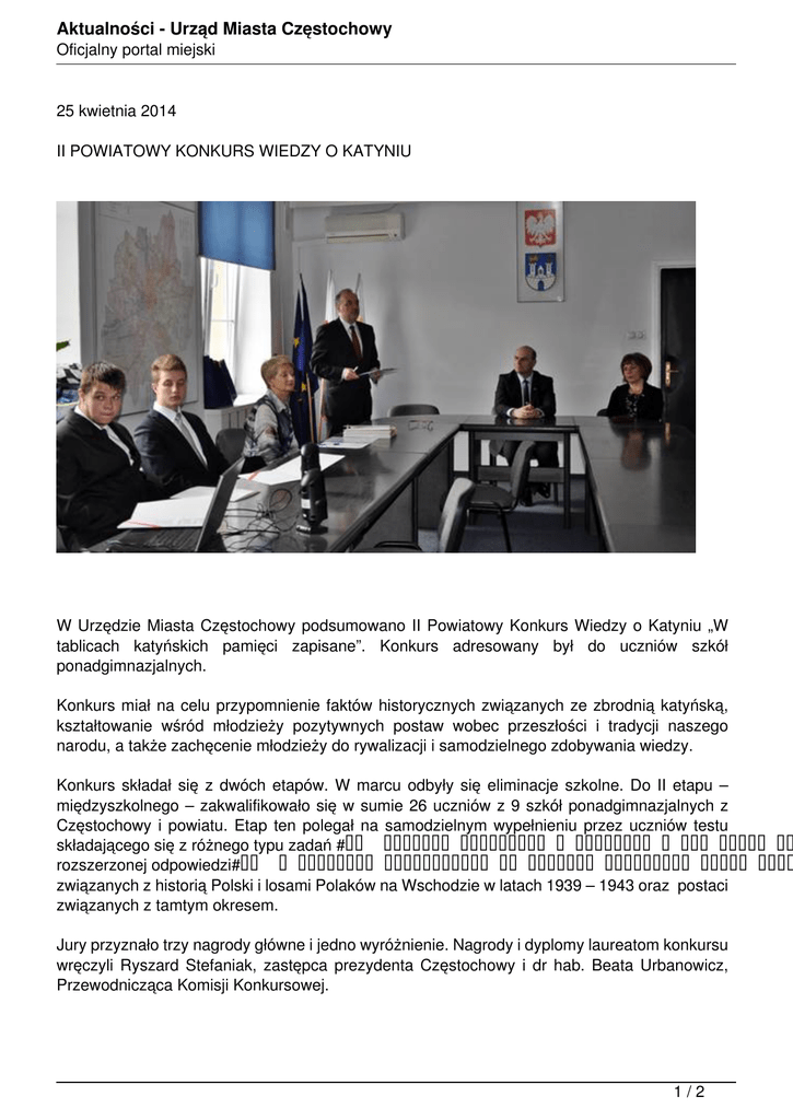 Aktualności - Urząd Miasta Częstochowy Oficjalny portal miejski 25 kwietnia 2014 II POWIATOWY KONKURS WIEDZY O KATYNIU W Urzędzie Miasta Częstochowy podsumowano II Powiatowy Konkurs Wiedzy o Katyniu „W tablicach katyńskich pamięci zapisane”. Konkurs adresowany był do uczniów szkół ponadgimnazjalnych. Konkurs miał na celu przypomnienie faktów historycznych związanych ze zbrodnią katyńską, kształtowanie wśród młodzieży pozytywnych postaw wobec przeszłości i tradycji naszego narodu, a także zachęcenie młodzieży do rywalizacji i samodzielnego zdobywania wiedzy. Konkurs składał się z dwóch etapów. W marcu odbyły się eliminacje szkolne. Do II etapu – międzyszkolnego – zakwalifikowało się w sumie 26 uczniów z 9 szkół ponadgimnazjalnych z Częstochowy i powiatu. Etap ten polegał na samodzielnym wypełnieniu przez uczniów testu składającego się z różnego typu zadań #℣佐⌡⌀瀀礀琀愀渀椀愀 稀愀洀欀渀椁ᤀ琀攀 椀 漀琀眀愀爀琀攀Ⰰ 眀 琀礀洀 樀攀搀渀漀 稀愀 rozszerzonej odpowiedzi#℣䍐⌡⌀⸀ 䴁䈀漀搀稀椀攁簀 漀搀瀀漀眀椀愀搀愁䈀愀 渀愀 瀀礀琀愀渀椀愀 搀漀琀礀挀稁Ԁ挀攀 洀⸀椀渀⸀ 稀愀最愀 związanych z historią Polski i losami Polaków na Wschodzie w latach 1939 – 1943 oraz postaci związanych z tamtym okresem. Jury przyznało trzy nagrody główne i jedno wyróżnienie. Nagrody i dyplomy laureatom konkursu wręczyli Ryszard Stefaniak, zastępca prezydenta Częstochowy i dr hab. Beata Urbanowicz, Przewodnicząca Komisji Konkursowej. 1/2 Aktualności - Urząd Miasta Częstochowy Oficjalny portal miejski Laureaci: I miejsce - Dominik Majczak, Zespół Szkół Ponadgimnazjalnych w Koniecpolu. II miejsce - Piotr Sadowski, Społeczne Liceum Ogólnokształcące im. Zbigniewa Herberta w Częstochowie. III miejsce - Mikołaj Zbrojkiewicz, IX Liceum Ogólnokształcące im. Cypriana Kamila Norwida w Częstochowie. wyróżnienie - Magdalena Chudzik, IV Liceum Ogólnokształcące im. Henryka Sienkiewicza w Częstochowie. Organizatorami turnieju byli Wydział Edukacji Urzędu Miasta Częstochowy i Samorządowy Ośrodek Doskonalenia w Częstochowie. Stowarzyszenie Rodzina Katyńska w Częstochowie zaprasza 26 kwietnia na Uroczystości Związane z Obchodami 74. Rocznicy Zbrodni Katyńskiej. Miejsce: Cmentarz Kule, ul. Cmentarna Program: 11.30 - zbiórka pocztów sztandarowych i uczestników uroczystości przed bramą główną Cmentarza Kule, ul. Cmentarna. 12.00 – Msza Św. w Kaplicy Cmentarnej 13.00 – ustawienie szyku i przemarsz pod Pomnik Ofiar Zbrodni Katyńskiej 13.10 – rozpoczęcie uroczystości - wystąpienia - złożenie kwiatów Pozostałe aktualności 2/2 Powered by TCPDF (www.tcpdf.org)