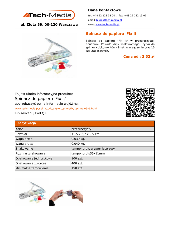 Dane kontaktowe tel. +48 22 122 13 00 , fax. +48 22 122 13 01 email: [email protected] ul. Złota 59, 00-120 Warszawa www: www.tech-media.pl Spinacz do papieru 'Fix it' Spinacz do papieru "Fix it" w przezroczystej obudowie. Posiada klipy wielokrotnego użytku do spinania dokumentów - 8 szt. w urządzeniu oraz 10 szt. Zapasowych. Cena od : 3,52 zł To jest ulotka informacyjna produktu: Spinacz do papieru 'Fix it' , aby zobaczyć pełną informację wejdź na: www.tech-media.pl/spinacz,do,papieru,primefix,it,prime,0586.html lub zeskanuj kod QR. Specyfikacja Kolor przezroczysty Rozmiar 11,5 x 2,7 x 2,5 cm Waga netto 0,039 kg. Waga brutto 0,040 kg. Znakowanie tampondruk, grawer laserowy Rozmiar znakowania tampondruk:35x11mm Opakowanie jednostkowe 100 szt. Opakowanie zbiorcze 400 szt. Minimalne zamówienie 150 szt.