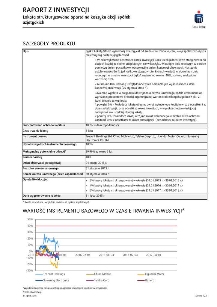 RAPORT Z INWESTYCJI Lokata strukturyzowana oparta na koszyku akcji spółek azjatyckich SZCZEGÓŁY PRODUKTU Zysk z Lokaty Strukturyzowanej zależny jest od średniej ze zmian wyceny akcji spółek z koszyka i obliczany wg następujących zasad: Opis 1.W celu wyliczenia odsetek za okres inwestycji Bank ustali jednostkowe stopy zwrotu na akcjach każdej ze spółek znajdujących się w koszyku, w każdym dniu roboczym w okresie pomiędzy dniem początkowej obserwacji a dniem końcowej obserwacji. Następnie ustalone przez Bank, jednostkowe stopy zwrotu, których wartość w dowolnym dniu roboczym w okresie inwestycji była:1.wyższa lub równa 40%, zostaną zastąpione wartością 10%, 2.niższa niż 40%, zostaną uwzględnione w ich nominalnych wysokościach z dnia końcowej obserwacji (25 stycznia 2018 r.). 3.Należna wypłata w przypadku dotrzymania okresu umownego będzie uzależniona od wyrażonej procentowo średniej arytmetycznej wartości określonych zgodnie z pkt. 2. Jeżeli średnia ta wyniesie: 1.powyżej 0% – Posiadacz lokaty otrzyma zwrot wpłaconego kapitału wraz z odsetkami za okres subskrypcji , oraz odsetki za okres inwestycji, w wysokości odpowiadającej iloczynowi ww. średniej i kwoty lokaty, 2.poniżej )0%– Posiadacz lokaty otrzyma zwrot wpłaconego kapitału (100% ochrona kapitału) wraz z odsetkami za okres subskrypcji (bez odsetek za okres inwestycji). Gwarantowana ochrona kapitału 100% w dniu zapadalności Czas trwania lokaty 3 lata Instrument bazowy Udział w wynikach instrumentu bazowego Tencent Holdings Ltd, China Mobile Ltd, Telstra Corp Ltd, Hyundai Motor Co. oraz Samsung Electronics Co. Ltd 100% Maksymalne potencjalne odsetki* 39,99% za okres 3 lat Poziom bariery 40% Dzień obserwacji początkowej 04 lutego 2015 r. Początek okresu umownego 31 stycznia 2015 r. Koniec okresu umownego (dzień zapadalności) 30 stycznia 2018 r. Opłata likwidacyjna • 6% kwoty lokaty strukturyzowanej w okresie (31.01.2015 r. –30.01.2016 r.) • 4% kwoty lokaty strukturyzowanej w okresie (31.01.2016 r. –30.01.2017 r.) • 2% kwoty lokaty strukturyzowanej w okresie (31.01.2017 r. –30.01.2018 r.) Data wygenerowania raportu 31 lipca 2015 r. * Kwota odsetek nie uwzględnia podatku od zysków kapitałowych. WARTOŚĆ INSTRUMENTU BAZOWEGO W CZASIE TRWANIA INWESTYCJI* 50% 40% 30% 20% 10% 0% 2015-02-04 -10% 2015-08-04 2016-02-04 2016-08-04 2017-02-04 2017-08-04 -20% -30% Tencent Holdings China Mobile Hyundai Motor Samsung Electronics Telstra Corp Bariera *Wyniki historyczne nie gwarantują osiągniecia podobnych wyników w przyszłości Źródło: Bloomberg 31 lipca 2015 Strona 1/2 RAPORT Z INWESTYCJI Lokata strukturyzowana oparta na koszyku akcji spółek azjatyckich ZMIANA WARTOŚCI INSTRUMENTU BAZOWEGO Nazwa Cena początkowa Cena bieżąca Zmiana Zmiana z uwzględnieniem bariery 8,07% 8,07% Tencent Holdings LTD 133,90 144,70 China Mobile LTD 105,60 101,50 -3,88% -3,88% 166 500 149 000 -10,51% -10,51% 1 359 000 1 185 000 -12,80% -12,80% 6,60 6,49 -1,67% -1,67% -4,16% -4,16% Hyundai Motor Co Samsung Electronics Co LTD Telstra Corp LTD Koszyk WARTOSĆ TEORETYCZNA NA DZIEŃ ZAPADALNOŚCI (KOMENTARZ) Na dzień 31 lipca 2015 r. wartość koszyka spółek spadła o 4,16% w porównaniu do wartości początkowej i z uwzględnieniem bariery 40%. Zakładając, iż stopa zwrotu z koszyka 5 spółek utrzyma się na bieżącym poziomie do ostatniego dnia obserwacji instrumentu bazowego, Inwestor otrzyma 100% zwrot zainwestowanych środków bez odsetek za okres inwestycji. Niniejszy materiał ma charakter wyłącznie informacyjny oraz nie stanowi oferty w rozumieniu Kodeksu cywilnego. Informacje zawarte w tym materiale nie mogą być traktowane jako propozycja nabycia jakichkolwiek instrumentów finansowych, usługa doradztwa inwestycyjnego, podatkowego lub jako forma świadczenia pomocy prawnej. PKO Bank Polski dołożył starań, aby zamieszczone w niniejszym materiale informacje były rzetelne oraz oparte na wiarygodnych źródłach. Materiał zawiera hipotetyczne wartości przyszłych wyników, które nie stanowią gwarancji osiągnięcia w przyszłości podobnych wyników z inwestycji. Scenariusze przebiegu inwestycji mają charakter wyłącznie przykładowy i nie odnoszą się do indywidualnej sytuacji Klienta. Niezależnie od informacji przekazanych przez PKO Bank Polski, przed zawarciem każdej transakcji Klient jest zobowiązany do oceny jej ryzyka, potencjalnych korzyści oraz ewentualnych strat, jak również w szczególności charakterystyki, konsekwencji prawnych i księgowych transakcji oraz konsekwencji zmieniających się czynników rynkowych. Klient powinien również w sposób niezależny ocenić, czy jest w stanie sam lub po konsultacjach ze swoimi doradcami podjąć takie ryzyko. PKO Bank Polski, mimo że oferuje produkty inwestycyjne, nie świadczy usług doradztwa inwestycyjnego ani nie udziela porad inwestycyjnych lub rekomendacji zawarcia transakcji. Ostateczna decyzja co do zawarcia transakcji, horyzontu inwestycyjnego oraz wielkości zaangażowanych środków należy wyłącznie do Klienta. Inwestycja w produkty strukturyzowane wiąże się z ryzykiem utraty zysków. Główne ryzyko związane z inwestowaniem to ryzyko rynkowe wynikające z faktu, że ceny instrumentów wbudowanych w produkty strukturyzowane podlegają wahaniom pod wpływem ogólnych tendencji rynkowych. Szczegółowe informacje o ryzyku związanym z inwestowaniem znajdują się w Katalogu instrumentów finansowych dostępnym na stronie www.pkobp.pl oraz w oddziałach Banku. 31 lipca 2015 Strona 2/2