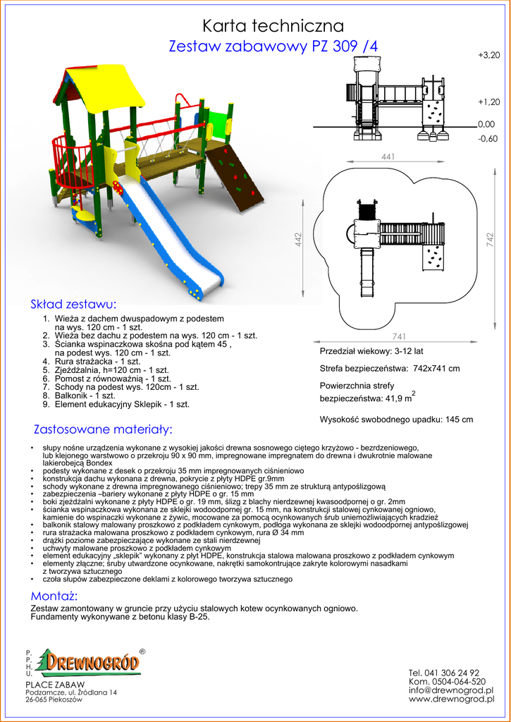 Karta techniczna Zestaw zabawowy PZ 309 /4 +3,20 +1,20 0,00 -0,60 742 442 441 Skład zestawu: 1. Wieża z dachem dwuspadowym z podestem na wys. 120 cm - 1 szt. 2. Wieża bez dachu z podestem na wys. 120 cm - 1 szt. 3. Ścianka wspinaczkowa skośna pod kątem 45 , na podest wys. 120 cm - 1 szt. 4. Rura strażacka - 1 szt. 5. Zjeżdżalnia, h=120 cm - 1 szt. 6. Pomost z równoważnią - 1 szt. 7. Schody na podest wys. 120cm - 1 szt. 8. Balkonik - 1 szt. 9. Element edukacyjny Sklepik - 1 szt. Zastosowane materiały: • • • • • • • • • • • • • • 741 Przedział wiekowy: 3-12 lat Strefa bezpieczeństwa: 742x741 cm Powierzchnia strefy 2 bezpieczeństwa: 41,9 m Wysokość swobodnego upadku: 145 cm słupy nośne urządzenia wykonane z wysokiej jakości drewna sosnowego ciętego krzyżowo - bezrdzeniowego, lub klejonego warstwowo o przekroju 90 x 90 mm, impregnowane impregnatem do drewna i dwukrotnie malowane lakierobejcą Bondex podesty wykonane z desek o przekroju 35 mm impregnowanych ciśnieniowo konstrukcja dachu wykonana z drewna, pokrycie z płyty HDPE gr.9mm schody wykonane z drewna impregnowanego ciśnieniowo; trepy 35 mm ze strukturą antypoślizgową zabezpieczenia –bariery wykonane z płyty HDPE o gr. 15 mm boki zjeżdżalni wykonane z płyty HDPE o gr. 19 mm, ślizg z blachy nierdzewnej kwasoodpornej o gr. 2mm ścianka wspinaczkowa wykonana ze sklejki wodoodpornej gr. 15 mm, na konstrukcji stalowej cynkowanej ogniowo, kamienie do wspinaczki wykonane z żywic, mocowane za pomocą ocynkowanych śrub uniemożliwiających kradzież balkonik stalowy malowany proszkowo z podkładem cynkowym, podłoga wykonana ze sklejki wodoodpornej antypoślizgowej rura strażacka malowana proszkowo z podkładem cynkowym, rura Ø 34 mm drążki poziome zabezpieczające wykonane ze stali nierdzewnej uchwyty malowane proszkowo z podkładem cynkowym element edukacyjny „sklepik” wykonany z płyt HDPE, konstrukcja stalowa malowana proszkowo z podkładem cynkowym elementy złączne; śruby utwardzone ocynkowane, nakrętki samokontrujące zakryte kolorowymi nasadkami z tworzywa sztucznego czoła słupów zabezpieczone deklami z kolorowego tworzywa sztucznego Montaż: Zestaw zamontowany w gruncie przy użyciu stalowych kotew ocynkowanych ogniowo. Fundamenty wykonywane z betonu klasy B-25. P. P. H. U. PLACE ZABAW Podzamcze, ul. Źródlana 14 26-065 Piekoszów Tel. 041 306 24 92 Kom. 0504-064-520 [email protected] www.drewnogrod.pl