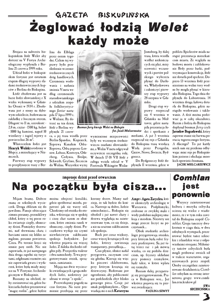 Żeglować łodzią Welet każdy może Stojąca na nabrzeżu bis− kupińskim łódź Welet aby dotrzeć na V Festyn Arche− ologiczny wypłynęła z Ber− lina 21 czerwca 1999 roku. Udział łodzi w biskupiń− skim festynie jest ostatnim etapem długiej wyprawy śla− dami średniowiecznych kup− ców z Berlina do Biskupina. Łódź zbudowana jest na bazie łodzi słowiańskiej z X wieku wykonanej w Gdańs− ku Orunii w 1934 r. Zbudo− wana jest z sosny na dębo− wym szkielecie, budowana na zakładkę z bocznym sterem. Długość to 11 m, szerokość − 2,8 m, ciężar − 1500 kg, balast − 1000 kg kamieni, napęd 10 wioślarzy i żagiel rejowy o powierzchni 26 m2. Właścicielem łodzi jest Henryk Wolski urodzony w Słupcy, a mieszkający w Nie− mczech. Pierwszy etap wyprawy to przepłynięcie trasy z Ber− Jomsborg, by dalej lina do Elbląga trasą, która wiodła przez osiem tygo− wzdłuż niekończą− dni. Celem tej wy− cych się plaż, miej− prawy było prze− scowości wczaso− śledzenie wczesno− wych i portów pol− średniowiecznych skiego wybrzeża dróg handlowych. płynąć do Darło− Ceremonia wodo− wa, Władysławowa wania i nadania i zakończyć pierw− imienia Vineta we− szy etap wyprawy dług ceremoniału 28 sierpnia w Gda− starosłowiańskiego ńsku. z udziałem zespo− Drugi etap wy− łu folklorystycz− prawy rozpoczął nego Jantar nastą− się 4 września w piła 17 lipca 1999 r. Gdańsku na Moł− w Wolinie. By do− tawie, gdzie nastą− trzeć na ten dzień, piła prezentacja ło− łódź z Berlina wy− Bosman Jerry kieruje Welet na Biskupin fot. Jacek Mielcarzewicz dzi i spotkanie z płynęła 21 czerw− ca, a jej trasa wiodła przez wymienione miejscowości mediami. A już 5 września Berlin−Spandau, Kopenick, były we wczesnym średnio− rozpoczął się rejs z Gdańska Szprewą Kanałem Odra− wieczu osadami słowiański− do Biskupina trasą wiodącą Szprewa, Odrą poprzez Los− mi, a Wolin−Vineta odgrywał Wisłą przez Przegolin, sow, Lebusz, Kostrzyn, Ode− oczywiście szczególną rolę. Gniew, Nowe, Świecie, Byd− rberg, Cedynia, Stolpe, W dniach 17−18 VII łódź z goszcz. Do Bydgoszczy łódź do− Schwedt, Gryfino, Szczecin załogą wzięła udział w V do Wolina. Wszystkie wyżej Festiwalu Wikingów Wolin− płynęła 11 września, gdzie w impresje dzień przed otwarciem Na początku była cisza... Mijam bramę. Dobrze znaną ze szkolnych wycie− czek. Drogą zbliżam się do pawilonu. Panuje obiecujące zimno; poranny, przenikliwy chłód, który o tej porze ro− ku zwiastuje ciepły, słonecz− ny dzień. Pomiędzy drzewa− mi, nad drewnianą chatą i barciami unosi się lekko za− mglone, poranne powietrze. Cisza. Po terenie kręci się sennie parę osób. Nic nie zapowiada, że już następnego dnia droga zapełni się turys− tami, odgłosami rozmów; nic nie zapowiada gwaru i wyda− rzeń, które będą miały miej− sce na V Festynie Archeolo− gicznym w Biskupinie. Ruszamy na obchód, że− by zorientować się, gdzie bu− kieciarka będzie prezentować “magię roślin”, gdzie będzie można obejrzeć koraliki, gdzie spróbować miodu, po− patrzeć jak się warzy sól. Chodzimy od stoiska do sto− iska, wdzierając się w spokój i ciszę chat razem ze słoń− cem, które zmienia ranek w słoneczny, ciepły dzień. Po− czątkowo wydaje się czymś niewłaściwym zakłócanie spokoju budynków. Już wkrótce pojawia się więcej ludzi. Z daleka dochodzi od− głos piły. Przejeżdża traktor i dwa samochody. Trwa przy− gotowywanie stoisk, sprzą− tanie, zamiatanie. Mijają nas dwie wyciecz− ki zwiedzających i grupa mło− dych ludzi, niektórzy już ubrani w stroje “z epoki”. Przewidujemy pogodę na czas festynu. Na razie pro− mienie przebijają się przez korony drzew. Mamy nad− zieję, że tak będzie do koń− ca. Nastroje są dobre, ludzie uśmiechnięci... Biskupin się obudził i już nawet chaty i drzewa wyglądają na zainte− resowane tym, co się dzieje, a nie na urażone zakłócaniem ich spokoju. Ruch jest coraz większy, coraz więcej krzątających się ludzi, którzy zawieszają transparenty, porządkują.... Czas płynie, słońce nadal przygrzewa, zaczynam czuć się głodna. Kieruję się więc ku piecowi chlebowemu, przy którym krzątają się dziewczyny. Budowane jest ogrodzenie, aby publiczność nie podchodziła zbyt blisko gorącego pieca. Czuję już smak podpłomyków... Opo− wiadają mi o nich Katarzyna Ampt i Agata Zarychta Zarychta, któ− re ukończyły archeologię w Warszawie. Podpłomyki, zrobione ze zwykłej mąki i wody podobno najlepiej sma− kują z miodem. Niestety nie mogę jeszcze liczyć na po− częstunek... Obok studentki archeo− logii przygotowują stoisko, przy którym będą robić fry− zury pradziejowe. Są już tu− taj trzeci raz i jak mówią wiedzą, co się podoba dzie− ciom, np. fryzury układane przy pomocy rzemyków, bądź takie, w które wplata się rzemyki. Ruszam dalej, przypatru− ję się przygotowaniom. Pra− ca w Biskupinie wre... Już wkrótce pojawią się tu pier− wsi zwiedzający. PAULINA SZMYT pobliżu Spichrzów miała na− stąpić prezentacja mieszkań− com miasta. Ze względu na budowę mostu i zablokowa− nie Brdy przez barki, pod− trzymujące konstrukcję, łódź nie dotarła pod spichrze. Do− piero 13 września łódź prze− niesiono na wolne tory wod− ne by mogła płynąć w kieru− nku Biskupina. Tego dnia do− płynęła do Lubostronia. 14 września drogą lądową dota− rła do Biskupina, gdzie na− stąpiło wodowanie i taklo− wanie. A dziś można podzi− wiać ją w całej okazałości. Razem z łodzią do Biskupina dopłynął bosman Jerry czyli Jarosław Bogusławski Bogusławski, który zapewne stanie się barwną po− stacią tegorocznego festynu. A dlaczego? To już każdy niech sam się przekona odby− wając m