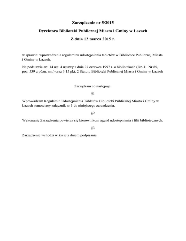 Zarządzenie nr 5/2015 Dyrektora Biblioteki Publicznej Miasta i Gminy w Łazach Z dnia 12 marca 2015 r. w sprawie: wprowadzenia regulaminu udostępniania tabletów w Bibliotece Publicznej Miasta i Gminy w Łazach. Na podstawie art. 14 ust. 4 ustawy z dnia 27 czerwca 1997 r. o bibliotekach (Dz. U. Nr 85, poz. 539 z późn. zm.) oraz § 15 pkt. 2 Statutu Biblioteki Publicznej Miasta i Gminy w Łazach Zarządzam co następuje: §1 Wprowadzam Regulamin Udostępniania Tabletów Biblioteki Publicznej Miasta i Gminy w Łazach stanowiący załącznik nr 1 do niniejszego zarządzenia. §2 Wykonanie Zarządzenia powierza się kierownikom agend udostępniania i filii bibliotecznych. §3 Zarządzenie wchodzi w życie z dniem podpisania. Załącznik nr 1 REGULAMIN UDOSTĘPNIANIA TABLETÓW W BIBLIOTECE PUBLICZNEJ MIASTA I GMINY W ŁAZACH 1. Biblioteka Publiczna Miasta i Gminy w Łazach zwana dalej Biblioteką udostępnia na miejscu do korzystania przez Czytelników tablety marki Apple: iPady wraz z akcesoriami. 2. Każdy Czytelnik może korzystać z tabletu w godzinach otwarcia Biblioteki w nieograniczonym wymiarze czasu, chyba że liczba chętnych do korzystania z tabletu jest większa niż liczba dostępnych tabletów. W takiej sytuacji jednorazowy czas korzystania z tabletu ograniczony jest do 1 godziny. 3. Biblioteka nie pobiera opłat za korzystanie z tabletów i Internetu oraz aplikacji zainstalowanych na tabletach. 4. Czytelnicy korzystający z tabletów wpisują się do rejestru odwiedzin. 5. Tablet udostępnia się na podstawie formularza udostępniania tabletu. Podpisując formularz Czytelnik akceptuje postanowienia niniejszego Regulaminu dotyczące udostępniania tabletu. W przypadku osób niepełnoletnich formularz udostępniania podpisuje rodzic lub opiekun prawny. 6. Czytelnicy do 13 roku życia mogą korzystać z tabletów tylko pod nadzorem osoby dorosłej. 7. Tablety podłączone są do sieci Wi-Fi Biblioteki, za pomocą której mogą łączyć się z Internetem. 8. Czytelnik korzysta z tabletu na własne ryzyko i odpowiedzialność, włączając w to odpowiedzialność karną. 9. Po zakończeniu pracy z tabletem Czytelnik zobowiązany jest zwrócić tablet wraz z akcesoriami w stanie nienaruszonym. Za każde uszkodzenie tabletu lub akcesoriów Czytelnik ponosi odpowiedzialność finansową, w maksymalnej wysokości ceny detalicznej takiego samego lub analogicznego modelu iPada oraz akcesoriów w sklepie firmowym producenta. 10. Korzystając z tabletu Czytelnik zobowiązany jest do przestrzegania prawa, a w szczególności czytelnik nie może zamieszczać w Internecie: obrazów przemocy, treści pornograficznych, treści obrażających lub oczerniających inne osoby fizyczne lub prawne, treści wzywających do nienawiści na tle rasowym lub religijnym, wizerunku osoby bez jej zgody, danych osobowych innych osób, reklamy alkoholu, tytoniu, hazardu, treści chronionych na podstawie ustawy z dnia 14 lutego 1994 r. o prawie autorskim i prawach pokrewnych, tj. m.in. filmów, piosenek, zdjęć, teledysków, tekstów, które nie są dostępne legalnie. 11. Zabronione jest także wysyłanie spamu (mass mailing), próba obejścia zabezpieczeń technicznych, próba nielegalnego wejścia do systemów informatycznych osób trzecich, używanie fałszywego adresu IP, wysyłanie wirusów komputerów lub innego niebezpiecznego oprogramowania oraz wszelkie inne działania zagrażające bezpieczeństwu Internetu i jego użytkowników. 12. Tablety wyposażone są w aplikacje umożliwiające naukę, tworzenie i dzielenie się treściami, a także zabawę. Czytelnik nie może samodzielnie instalować na tablecie żadnych dodatkowych aplikacji. Czytelnik może zaproponować Bibliotece zainstalowanie dodatkowych aplikacji. O instalacji bądź jej odmowie Biblioteka zdecyduje wedle własnego uznania. 13. Na zakończenie korzystania z tabletu Czytelnik zobowiązany jest usunąć z tabletu wszelkie dane osobowe, aplikacje bądź inne treści, które na nim umieści. Czytelnik zobowiązany jest do wylogowania się ze wszelkich internetowych aplikacji z których korzystał, np. bankowości internetowej. Czytelnik usunie z przeglądarki internetowej historię wyszukiwania. 14. Czytelnik przyjmuje do wiadomości, że w przypadku nie zastosowania się do postanowień pkt. 12 powyżej, Biblioteka może usunąć z tabletu wszelkie dane i treści umieszczone na nim przez Czytelnika. Jednak w żadnym wypadku Biblioteka nie ponosi odpowiedzialności za ewentualne roszczenia osób trzecich bądź szkody Czytelnika, w tym naruszenie poufności danych osobowych, wynikłe na skutek korzystania przez Czytelnika z Internetu za pośrednictwem tabletu. 15. Niniejszy Regulamin obowiązuje od dnia 12 marca 2015 r. Załącznik nr 2 FORMULARZ UDOSTĘPNIANIA TABLETU BIBLIOTEKI PUBLICZNEJ MIASTA I GMINY W ŁAZACH DANE CZYTELNIKA Imię: Nazwisko: Adres zamieszkania: PESEL: Telefon: E-mail: TABLET – iPad [model] o numerze seryjnym: …………………………………………… Data/godzina udostępnienia Planowana data/godzina zwrotu Rzeczywista data/godzina zwrotu Poniżej proszę wstawić: ✓= element w dobrym stanie X = element w złym stanie, zniszczony bądź zagubiony Stan sprzętu przed udostępnieniem Udostępniony sprzęt* Stan sprzętu przy zwrocie Tablet Ładowarka Słuchawki Pokrowiec *Skreślić w przypadku nieudostępnienia któregoś sprzętu. UWAGI Ja niżej podpisany, niniejszym akceptuję zasady udostępniania i korzystania z tabletu zawarte w regulaminie Biblioteki. Rozumiem, że korzystam z tabletu na własne ryzyko i odpowiedzialność oraz ponoszę osobistą odpowiedzialność za uszkodzenie lub utratę tabletu. Podpis Czytelnika Podpis Bibliotekarza
