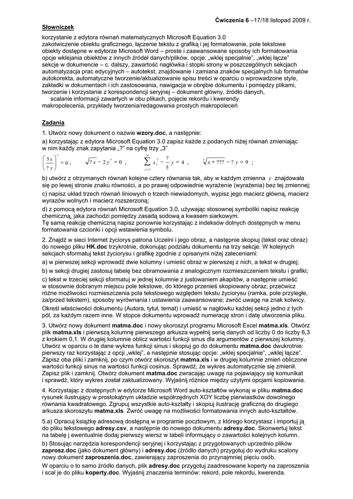 Ćwiczenia 6 –17/18 listopad 2009 r. Słowniczek korzystanie z edytora równań matematycznych Microsoft Equation 3.0 zakotwiczenie obiektu graficznego, łączenie tekstu z grafiką i jej formatowanie, pole tekstowe obiekty dostępne w edytorze Microsoft Word – proste i zaawansowane sposoby ich formatowania opcje wklejania obiektów z innych źródeł danych/plików, opcje: „wklej specjalnie”, „wklej łącze” sekcje w dokumencie – c. dalszy, zawartość nagłówka i stopki strony w poszczególnych sekcjach automatyzacja prac edycyjnych – autotekst, znajdowanie i zamiana znaków specjalnych lub formatów autokorekta, automatyczne tworzenie/aktualizowanie spisu treści w oparciu o wprowadzone style, zakładki w dokumentach i ich zastosowania, nawigacja w obrębie dokumentu i pomiędzy plikami, tworzenie i korzystanie z korespondencji seryjnej – dokument główny, źródło danych, scalanie informacji zawartych w obu plikach, pojęcie rekordu i kwerendy makropolecenia, przykłady tworzenia/redagowania prostych makropoleceń Zadania 1. Utwórz nowy dokument o nazwie wzory.doc, a następnie: a) korzystając z edytora Microsoft Equation 3.0 zapisz każde z podanych niżej równań zmieniając w nim każdy znak zapytania „?” na cyfrę trzy „3” ? 5x ?y ?? 0, ?x 2y ? ? 0 , xi i ? ? y 4 , ? x ??? ?y 9 ; 5 b) utwórz z otrzymanych równań kolejne cztery równania tak, aby w każdym zmienna y znajdowała się po lewej stronie znaku równości, a po prawej odpowiednie wyrażenie (wyrażenia) bez tej zmiennej; c) napisz układ trzech równań liniowych o trzech niewiadomych, wypisz jego macierz główną, macierz wyrazów wolnych i macierz rozszerzoną; d) z pomocą edytora równań Microsoft Equation 3.0, używając stosownej symboliki napisz reakcję chemiczną, jaka zachodzi pomiędzy zasadą sodową a kwasem siarkowym. Tę samą reakcję chemiczną napisz ponownie korzystając z indeksów dolnych dostępnych w menu formatowania czcionki i opcji wstawienia symbolu. 2. Znajdź w sieci Internet życiorys patrona Uczelni i jego obraz, a następnie skopiuj (tekst oraz obraz) do nowego pliku HK.doc trzykrotnie, dokonując podziału dokumentu na trzy sekcje. W kolejnych sekcjach sformatuj tekst życiorysu i grafikę zgodnie z opisanymi niżej zaleceniami: a) w pierwszej sekcji wprowadź dwie kolumny i umieść obraz w pierwszej z nich, a tekst w drugiej; b) w sekcji drugiej zastosuj tabelę bez obramowania z analogicznym rozmieszczeniem tekstu i grafiki; c) tekst w trzeciej sekcji sformatuj w jednej kolumnie z justowaniem akapitów, a następnie umieść w stosownie dobranym miejscu pole tekstowe, do którego przenieś skopiowany obraz; przećwicz różne możliwości rozmieszczenia pola tekstowego względem tekstu życiorysu (ramka, pole przyległe, za/przed tekstem), sposoby wyrównania i ustawienia zaawansowane; zwróć uwagę na znak kotwicy. Określ właściwości dokumentu (Autora, tytuł, temat) i umieść w nagłówku każdej sekcji jedno z tych pól, za każdym razem inne. W stopce dokumentu wprowadź numerację stron i datę utworzenia pliku. 3. Utwórz nowy dokument matma.doc i nowy skoroszyt programu Microsoft Excel matma.xls. Otwórz plik matma.xls i pierwszą kolumnę pierwszego arkusza wypełnij serią danych od liczby 0 do liczby 6,3 z krokiem 0,1. W drugiej kolumnie oblicz wartości funkcji sinus dla argumentów z pierwszej kolumny. Utwórz w oparciu o te dane wykres funkcji sinus i skopiuj go do dokumentu matma.doc dwukrotnie: pierwszy raz korzystając z opcji „wklej”, a następnie stosując opcje: „wklej specjalnie”, „wklej łącze”. Zapisz oba pliki i zamknij, po czym otwórz skoroszyt matma.xls i w drugiej kolumnie zmień obliczone wartości funkcji sinus na wartości funkcji cosinus. Sprawdź, że wykres automatycznie się zmienił. Zapisz plik i zamknij. Otwórz dokument matma.doc zwracając uwagę na pojawiający się komunikat i sprawdź, który wykres został zaktualizowany. Wyjaśnij różnice między użytymi opcjami kopiowania. 4. Korzystając z dostępnych w edytorze Microsoft Word auto-kształtów wykonaj w pliku matma.doc rysunek ilustrujący w prostokątnym układzie współrzędnych XOY liczbę pierwiastków dowolnego równania kwadratowego. Zgrupuj wszystkie auto-kształty i skopiuj ilustrację graficzną do drugiego arkusza skoroszytu matma.xls. Zwróć uwagę na możliwości formatowania innych auto-kształtów. 5.a) Opracuj książkę adresową dostępną w programie pocztowym, z którego korzystasz i importuj ją do pliku tekstowego adresy.csv, a następnie do nowego dokumentu adresy.doc. Skonwertuj tekst na tabelę j ewentualnie dodaj pierwszy wiersz w tabeli informujący o zawartości kolejnych kolumn. b) Stosując narzędzia korespondencji seryjnej i korzystając z przygotowanych uprzednio plików zaprosz.doc (jako dokument główny) i adresy.doc (źródło danych) przygotuj do wydruku scalony nowy dokument zaproszenia.doc, zawierający zaproszenia do przynajmniej pięciu osób. W oparciu o to samo źródło danych, plik adresy.doc przygotuj zaadresowane koperty na zaproszenia i scal je do pliku koperty.doc. Wyjaśnij znaczenia terminów: rekord, pole rekordu, kwerenda.