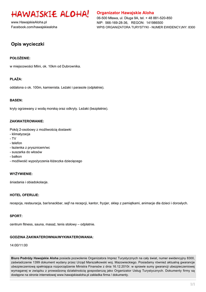 Organizator Hawajskie Aloha www.HawajskieAloha.pl Facebook.com/hawajskiealoha 06-500 Mława, ul. Długa 9A, tel. + 48 881-520-850 NIP: 566-169-28-36, REGON: 141986500 WPIS ORGANIZATORA TURYSTYKI - NUMER EWIDENCYJNY: 8300 Opis wycieczki POŁOŻENIE: w miejscowości Mlini, ok. 10km od Dubrownika. PLAŻA: oddalona o ok. 100m, kamienista. Leżaki i parasole (odpłatnie). BASEN: kryty ogrzewany z wodą morską oraz odkryty. Leżaki (bezpłatnie). ZAKWATEROWANIE: Pokój 2-osobowy z możliwością dostawki - klimatyzacja - TV - telefon - łazienka z prysznicem/wc - suszarka do włosów - balkon - możliwość wypożyczenia łóżeczka dziecięcego WYŻYWIENIE: śniadania i obiadokolacje. HOTEL OFERUJE: recepcja, restauracja, bar/snackbar, sejf na recepcji, kantor, fryzjer, sklep z pamiątkami, animacje dla dzieci i dorosłych. SPORT: centrum fitness, sauna, masaż, tenis stołowy – odpłatnie. GODZINA ZAKWATEROWNIA/WYKWATEROWANIA: 14:00/11:00 Biuro Podróży Hawajskie Aloha posiada pozwolenie Organizatora Imprez Turystycznych na cały świat, numer ewidencyjny 8300, zaświadczenie 1399 dokument wydany przez Urząd Marszałkowski woj. Mazowieckiego. Posiadamy również aktualną gwarancje ubezpieczeniową spełniająca rozporządzenie Ministra Finansów z dnia 16.12.2010r. w sprawie sumy gwarancji ubezpieczeniowej wymaganej w związku z prowadzoną działalnością gospodarczą jako Organizator Usług Turystycznych. Dokumenty firmy są dostępne na stronie internetowej www.hawajskiealoha.pl zakładka firma / dokumenty. 1/1