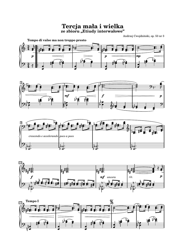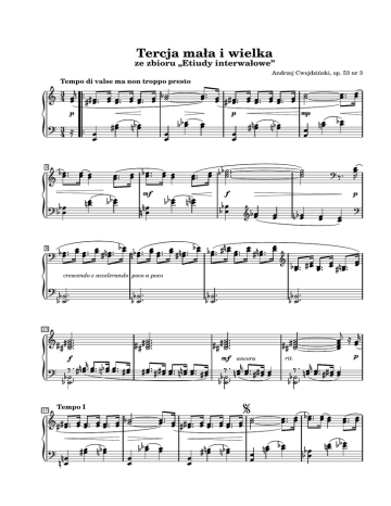 Tercja mała i wielka ze zbioru „Etiudy interwałowe” Andrzej Cwojdziński, op. 53 nr 3 3 4 p 3 4 Tempo di valse ma non troppo presto 5 9 mf f crescendo e accelerando poco a poco 13 17 mp p p p rit. mf ancora f Tempo I 22 cresc. e accel. 27 31 35 dim. rit. pp crescendo poco a poco f 44 subito più mosso dim. 40 Coda a tempo ff p cresc. e rit. Da capo al e poi coda pp