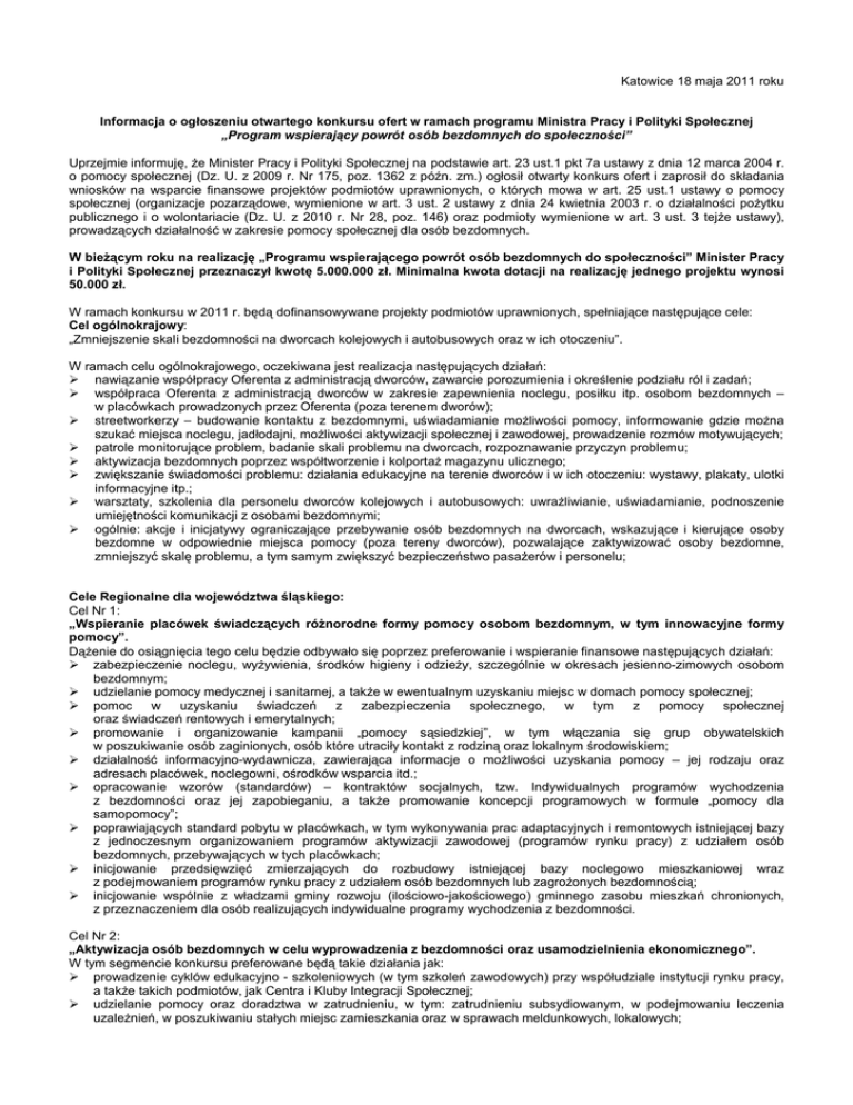 Katowice 18 maja 2011 roku Informacja o ogłoszeniu otwartego konkursu ofert w ramach programu Ministra Pracy i Polityki Społecznej „Program wspierający powrót osób bezdomnych do społeczności” Uprzejmie informuję, że Minister Pracy i Polityki Społecznej na podstawie art. 23 ust.1 pkt 7a ustawy z dnia 12 marca 2004 r. o pomocy społecznej (Dz. U. z 2009 r. Nr 175, poz. 1362 z późn. zm.) ogłosił otwarty konkurs ofert i zaprosił do składania wniosków na wsparcie finansowe projektów podmiotów uprawnionych, o których mowa w art. 25 ust.1 ustawy o pomocy społecznej (organizacje pozarządowe, wymienione w art. 3 ust. 2 ustawy z dnia 24 kwietnia 2003 r. o działalności pożytku publicznego i o wolontariacie (Dz. U. z 2010 r. Nr 28, poz. 146) oraz podmioty wymienione w art. 3 ust. 3 tejże ustawy), prowadzących działalność w zakresie pomocy społecznej dla osób bezdomnych. W bieżącym roku na realizację „Programu wspierającego powrót osób bezdomnych do społeczności” Minister Pracy i Polityki Społecznej przeznaczył kwotę 5.000.000 zł. Minimalna kwota dotacji na realizację jednego projektu wynosi 50.000 zł. W ramach konkursu w 2011 r. będą dofinansowywane projekty podmiotów uprawnionych, spełniające następujące cele: Cel ogólnokrajowy: „Zmniejszenie skali bezdomności na dworcach kolejowych i autobusowych oraz w ich otoczeniu”. W ramach celu ogólnokrajowego, oczekiwana jest realizacja następujących działań: nawiązanie współpracy Oferenta z administracją dworców, zawarcie porozumienia i określenie podziału ról i zadań; współpraca Oferenta z administracją dworców w zakresie zapewnienia noclegu, posiłku itp. osobom bezdomnych – w placówkach prowadzonych przez Oferenta (poza terenem dworów); streetworkerzy – budowanie kontaktu z bezdomnymi, uświadamianie możliwości pomocy, informowanie gdzie można szukać miejsca noclegu, jadłodajni, możliwości aktywizacji społecznej i zawodowej, prowadzenie rozmów motywujących; patrole monitorujące problem, badanie skali problemu na dworcach, rozpoznawanie przyczyn problemu; aktywizacja bezdomnych poprzez współtworzenie i kolportaż magazynu ulicznego; zwiększanie świadomości problemu: działania edukacyjne na terenie dworców i w ich otoczeniu: wystawy, plakaty, ulotki informacyjne itp.; warsztaty, szkolenia dla personelu dworców kolejowych i autobusowych: uwrażliwianie, uświadamianie, podnoszenie umiejętności komunikacji z osobami bezdomnymi; ogólnie: akcje i inicjatywy ograniczające przebywanie osób bezdomnych na dworcach, wskazujące i kierujące osoby bezdomne w odpowiednie miejsca pomocy (poza tereny dworców), pozwalające zaktywizować osoby bezdomne, zmniejszyć skalę problemu, a tym samym zwiększyć bezpieczeństwo pasażerów i personelu; Cele Regionalne dla województwa śląskiego: Cel Nr 1: „Wspieranie placówek świadczących różnorodne formy pomocy osobom bezdomnym, w tym innowacyjne formy pomocy”. Dążenie do osiągnięcia tego celu będzie odbywało się poprzez preferowanie i wspieranie finansowe następujących działań: zabezpieczenie noclegu, wyżywienia, środków higieny i odzieży, szczególnie w okresach jesienno-zimowych osobom bezdomnym; udzielanie pomocy medycznej i sanitarnej, a także w ewentualnym uzyskaniu miejsc w domach pomocy społecznej; pomoc w uzyskaniu świadczeń z zabezpieczenia społecznego, w tym z pomocy społecznej oraz świadczeń rentowych i emerytalnych; promowanie i organizowanie kampanii „pomocy sąsiedzkiej”, w tym włączania się grup obywatelskich w poszukiwanie osób zaginionych, osób które utraciły kontakt z rodziną oraz lokalnym środowiskiem; działalność informacyjno-wydawnicza, zawierająca informacje o możliwości uzyskania pomocy – jej rodzaju oraz adresach placówek, noclegowni, ośrodków wsparcia itd.; opracowanie wzorów (standardów) – kontraktów socjalnych, tzw. Indywidualnych programów wychodzenia z bezdomności oraz jej zapobieganiu, a także promowanie koncepcji programowych w formule „pomocy dla samopomocy”; poprawiających standard pobytu w placówkach, w tym wykonywania prac adaptacyjnych i remontowych istniejącej bazy z jednoczesnym organizowaniem programów aktywizacji zawodowej (programów rynku pracy) z udziałem osób bezdomnych, przebywających w tych placówkach; inicjowanie przedsięwzięć zmierzających do rozbudowy istniejącej bazy noclegowo mieszkaniowej wraz z podejmowaniem programów rynku pracy z udziałem osób bezdomnych lub zagrożonych bezdomnością; inicjowanie wspólnie z władzami gminy rozwoju (ilościowo-jakościowego) gminnego zasobu mieszkań chronionych, z przeznaczeniem dla osób realizujących indywidualne programy wychodzenia z bezdomności. Cel Nr 2: „Aktywizacja osób bezdomnych w celu wyprowadzenia z bezdomności oraz usamodzielnienia ekonomicznego”. W tym segmencie konkursu preferowane będą takie działania jak: prowadzenie cyklów edukacyjno - szkoleniowych (w tym szkoleń zawodowych) przy współudziale instytucji rynku pracy, a także takich podmiotów, jak Centra i Kluby Integracji Społecznej; udzielanie pomocy oraz doradztwa w zatrudnieniu, w tym: zatrudnieniu subsydiowanym, w podejmowaniu leczenia uzależnień, w poszukiwaniu stałych miejsc zamieszkania oraz w sprawach meldunkowych, lokalowych; udzielanie pomocy psychologicznej mającej na celu przywracanie godności ludzkiej, a także w przystosowywaniu do życia społecznego w lokalnym środowisku. WYDATKI KWALIFIKOWALNE I NIEKWALIFIKOWALNE 1. WYDATKI KWALIFIKOWALNE 1.1 KOSZTY BEZPOŚREDNIE PROJEKTU: a) W ramach Celu Ogólnopolskiego kwalifikowanymi wydatkami są: wydatki związane z zapewnieniem noclegu, posiłku itp. osobom bezdomnym w placówkach prowadzonych przez Oferenta (poza terenem dworców): • wydatki związane z działalnością placówek, w których udzielana będzie pomoc osobom bezdomnym: czynsz, nośniki energii i ciepła, opał, dostawa w