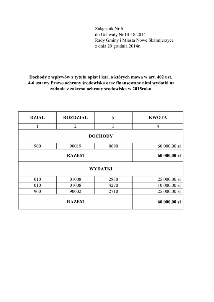 Załącznik Nr 6 do Uchwały Nr III.18.2014 Rady Gminy i Miasta Nowe Skalmierzyce z dnia 29 grudnia 2014r. Dochody z wpływów z tytułu opłat i kar, o których mowa w art. 402 ust. 4-6 ustawy Prawo ochrony środowiska oraz finansowane nimi wydatki na zadania z zakresu ochrony środowiska w 2015roku DZIAŁ ROZDZIAŁ § KWOTA 1 2 3 4 DOCHODY 900 90019 0690 60 000,00 zł 60 000,00 zł RAZEM WYDATKI 010 010 900 01008 01008 90002 RAZEM 2830 4270 2710 25 000,00 zł 10 000,00 zł 25 000,00 zł 60 000,00 zł