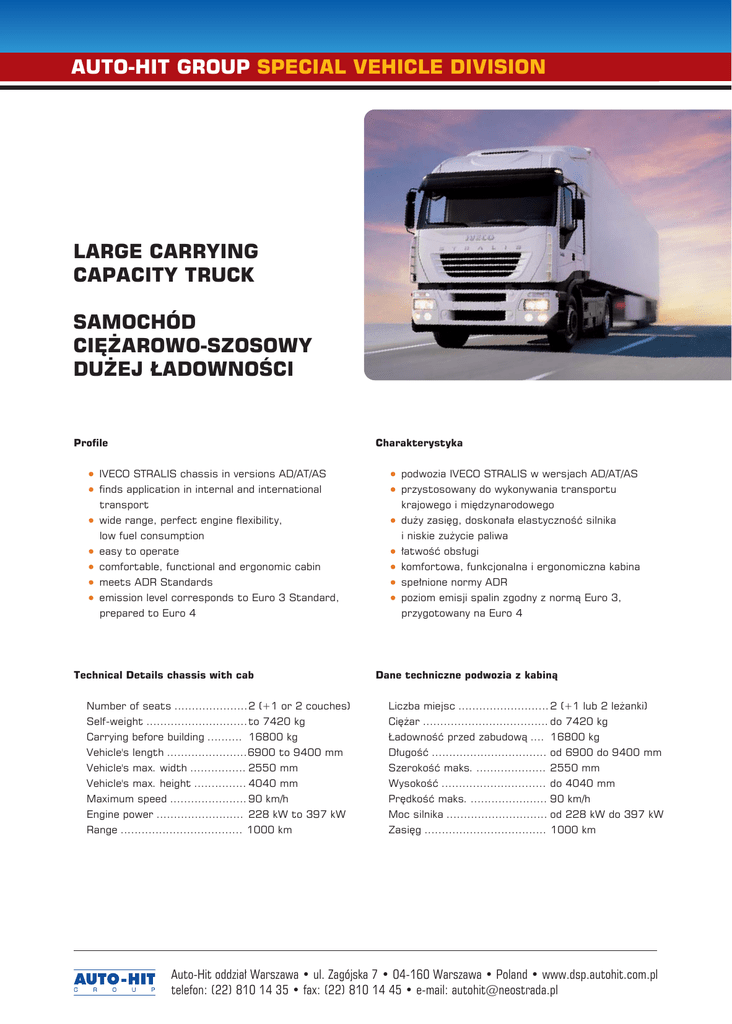 AUTO-HIT GROUP SPECIAL VEHICLE DIVISION LARGE CARRYING CAPACITY TRUCK SAMOCHÓD CIʯAROWO-SZOSOWY DU¯EJ £ADOWNOŒCI Profile Charakterystyka • IVECO STRALIS chassis in versions AD/AT/AS • finds application in internal and international • • • • • transport wide range, perfect engine flexibility, low fuel consumption easy to operate comfortable, functional and ergonomic cabin meets ADR Standards emission level corresponds to Euro 3 Standard, prepared to Euro 4 Technical Details chassis with cab Number of seats .....................2 (+1 or 2 couches) Self-weight .............................to 7420 kg Carrying before building .......... 16800 kg Vehicle's length .......................6900 to 9400 mm Vehicle's max. width ................ 2550 mm Vehicle's max. height ............... 4040 mm Maximum speed ...................... 90 km/h Engine power ......................... 228 kW to 397 kW Range ................................... 1000 km • podwozia IVECO STRALIS w wersjach AD/AT/AS • przystosowany do wykonywania transportu • • • • • krajowego i miêdzynarodowego du¿y zasiêg, doskona³a elastycznoœæ silnika i niskie zu¿ycie paliwa ³atwoœæ obs³ugi komfortowa, funkcjonalna i ergonomiczna kabina spe³nione normy ADR poziom emisji spalin zgodny z norm¹ Euro 3, przygotowany na Euro 4 Dane techniczne podwozia z kabin¹ Liczba miejsc ..........................2 (+1 lub 2 le¿anki) Ciê¿ar .................................... do 7420 kg £adownoœæ przed zabudow¹ .... 16800 kg D³ugoœæ ................................. od 6900 do 9400 mm Szerokoœæ maks. .................... 2550 mm Wysokoœæ .............................. do 4040 mm Prêdkoœæ maks. ...................... 90 km/h Moc silnika ............................. od 228 kW do 397 kW Zasiêg ................................... 1000 km Auto-Hit oddzia³ Warszawa • ul. Zagójska 7 • 04-160 Warszawa • Poland • www.dsp.autohit.com.pl telefon: (22) 810 14 35 • fax: (22) 810 14 45 • e-mail: [email protected]