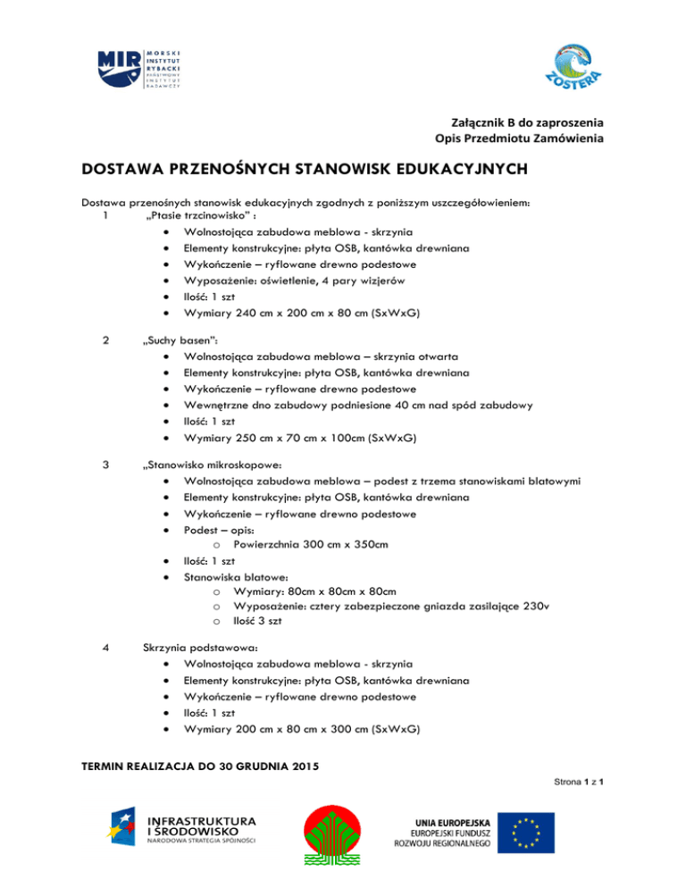 Załącznik B do zaproszenia Opis Przedmiotu Zamówienia DOSTAWA PRZENOŚNYCH STANOWISK EDUKACYJNYCH Dostawa przenośnych stanowisk edukacyjnych zgodnych z poniższym uszczegółowieniem: 1 „Ptasie trzcinowisko” : Wolnostojąca zabudowa meblowa - skrzynia Elementy konstrukcyjne: płyta OSB, kantówka drewniana Wykończenie – ryflowane drewno podestowe Wyposażenie: oświetlenie, 4 pary wizjerów Ilość: 1 szt Wymiary 240 cm x 200 cm x 80 cm (SxWxG) 2 „Suchy basen”: Wolnostojąca zabudowa meblowa – skrzynia otwarta Elementy konstrukcyjne: płyta OSB, kantówka drewniana Wykończenie – ryflowane drewno podestowe Wewnętrzne dno zabudowy podniesione 40 cm nad spód zabudowy Ilość: 1 szt Wymiary 250 cm x 70 cm x 100cm (SxWxG) 3 „Stanowisko mikroskopowe: Wolnostojąca zabudowa meblowa – podest z trzema stanowiskami blatowymi Elementy konstrukcyjne: płyta OSB, kantówka drewniana Wykończenie – ryflowane drewno podestowe Podest – opis: o Powierzchnia 300 cm x 350cm Ilość: 1 szt Stanowiska blatowe: o Wymiary: 80cm x 80cm x 80cm o Wyposażenie: cztery zabezpieczone gniazda zasilające 230v o Ilość 3 szt 4 Skrzynia podstawowa: Wolnostojąca zabudowa meblowa - skrzynia Elementy konstrukcyjne: płyta OSB, kantówka drewniana Wykończenie – ryflowane drewno podestowe Ilość: 1 szt Wymiary 200 cm x 80 cm x 300 cm (SxWxG) TERMIN REALIZACJA DO 30 GRUDNIA 2015 Strona 1 z 1