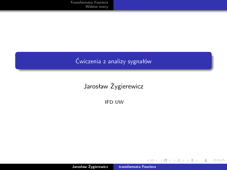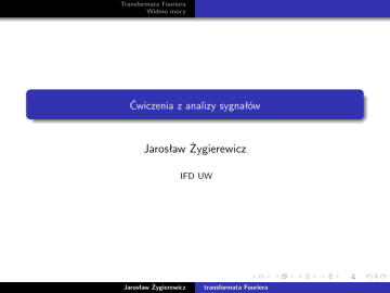 Transformata Fouriera Widmo mocy Ćwiczenia z analizy sygnałów Jarosław Żygierewicz IFD UW Jarosław Żygierewicz transformata Fouriera Transformata Fouriera Widmo mocy Wzory F s(t) k , S(ω) F −1 Ciągły sygnał okresowy ∞ X s(t) = cn e −i 2πt n T (1) n=−∞ gdzie: cn = 1 T Z Jarosław Żygierewicz T s(t)e i 2πt n T dt 0 transformata Fouriera (2) Transformata Fouriera Widmo mocy Nieskończony sygnał ciągły s(t) = ∞ 1 X S (fn ) e −i2πtfn ∆f T n=−∞ Formalnie bierzemy granicę T → ∞ i dostajemy: Z ∞ s(t) = S(f )e 2πift df (3) (4) −∞ Z ∞ S(f ) = s(t)e −2πift dt −∞ Jarosław Żygierewicz transformata Fouriera (5) Transformata Fouriera Widmo mocy Sygnał skończony dyskretny S[k] = = 1 T 1 N RT s(t)δ(t − nTs )e i PN−1 i 2π kn N n=0 s[n]e 0 2πt k T dt = 1 NTs PN−1 n=0 s[n]e i 2πknTs T Ts (6) Z tego wzorku widać, że k może być tylko k = 0, . . . , N − 1. Mamy więc tylko N wyrażeń. Ze wzorów Eulera wiemy, że dla sygnałów rzeczywistych musimy mieć pary sprzężonych exp. zespolonych więc efektywnie dostajemy tylko N/2 różnych częstośći. Transformata odwrotna (IDFT): s[n] = N−1 X S[k]e −i 2π kn N n = 0, . . . , N − 1. k=0 Jarosław Żygierewicz transformata Fouriera (7) Transformata Fouriera Widmo mocy Moc Moc sygnału przez analogię do układów elektrycznych jest w analizie sygnałów przyjęta jako kwadraty próbek. P Niech sygnał x[n], wówczas moc P[n] = x[n]2 , a energia E = n x[n]2 przykładowy kod matlabowy f=1; fi=0; T=1; Fs=100; [s, t]=m_sin(f,fi,T,Fs); P=s.^2 E=sum(s.^2) Jarosław Żygierewicz transformata Fouriera Transformata Fouriera Widmo mocy Widmo mocy: tw. Plancherel’a i tw. Parseval’a Twierdzenie Plancherel Jeśli X [k] i Y [k] są transformatami x[n] i y [n] odpowiednio to: N−1 X x[n]y ∗ [n] = n=0 N−1 1 X X [k]Y ∗ [k] N (8) k=0 gwiazdka oznacza sorzężenie zespolone. Twierdzenie Parseval’a jest specjalnym przypadkiem twierdzenia Plancherel’a : N−1 X n=0 N−1 1 X |x[n]| = |X [k]|2 . N 2 (9) k=0 Twierdzenie to upoważnia nas do utożsamiania kwadratów wartości bezwzględnej składowych transformaty fouriera z mocą niesioną przez odpowiadające im składowe. Jarosław Żygierewicz transformata Fouriera Transformata Fouriera Widmo mocy Przykład liczenia widma funkcja zwracająca widmo plik moc.m function [P, F, P_re, F_re]=moc(s,Fs) S=fft(s); N=length(s); if mod(N,2)==0 f=linspace(0,Fs/2,N/2); F=[f fliplr(-f)]; P=S.*conj(S)/length(S); P_re=P(1:end/2); P_re(2:end)=2*P(2:end/2); F_re=f; else f=linspace(0,Fs/2,(N+1)/2); F=[f fliplr(-f(1:end-1))]; P=S.*conj(S)/length(S); P_re=P(1:(end+1)/2); P_re(2:end)=2*P(2:(end+1)/2); F_re=f; end skrypt testujący test moc.m f=10; fi=0; T=1; Fs=100; [s, t]=m_sin(f,fi,T,Fs); P=s.^2; E=sum(s.^2) [P, F, P_re, F_re]=moc(s,Fs); disp(’moc sumowana po całym widmie’); sum(P) disp(’moc sumowana po widmie sygnalu rzeczywistego’); sum(P_re) subplot(211);plot(F,P); axis tight subplot(224);plot(F_re, P_re); axis tight Jarosław Żygierewicz transformata Fouriera Transformata Fouriera Widmo mocy Rozdzielczość widma Proszę zbadać rozdzielczość częstotliwościową widma w zależności od długości sygnału. Używamy funkcji m_sin. Zwrócić uwagę na to co dzieje się na końcach odcinka. Jarosław Żygierewicz transformata Fouriera Transformata Fouriera Widmo mocy Podstawowe właściwości: Przy użyciu sygnałów testowych s(t), g (t) i h(t) oraz ich transformat Fouriera S(f ), G (f ) i H(f ). Proszę sprawdzić: Liniowość dla liczb zespolonych a i b: ⇒ h(t) = as(t)+bg (t) H(f ) = a·S(f )+b ·G (f ) Translacja dla dowolnego rzeczywistego t0 : h(t) = s(t − t0 ) ⇒ H(f ) = e −2πit0 f S(f ) Modulacja dla dowolnego rzeczywistego f0 : h(t) = e 2πf0 s(t) ⇒ H(f ) = S(f − f0 ) Skalowanie Dla niezerowych liczb rzeczywistych a: ⇒ h(t) = s(at) 1 S H(f ) = |a| f a a = −1 prowadzi do własności odrócenia czasowego: h(t) = f (−t) Jarosław Żygierewicz ⇒ H(f ) = S(−f ) transformata Fouriera Transformata Fouriera Widmo mocy Twierdzenie o splocie g (t) = (s ∗ h) (t) ⇒ G (f ) = S(f ) · H(f ) (10) To twierdzenie działa też w drugą stronę: G (f ) = (S ∗ H) (f ) ⇒ g (t) = s(t) · h(t) Zastosowania: zamiana splotu na mnożenie daje wgląd w okienkowanie łatwo zrozumieć działanie flitrów Jarosław Żygierewicz transformata Fouriera (11) Transformata Fouriera Widmo mocy Okienkowana transformata Fouriera: Polecenia 1 obejrzyj przykładowe okna hanning, kaaiser itp zrob okno prostokatne (na sygnale o dlugosci 128 wytworz same zera i elementy od 50 do 70 poloz =1) jakie jest widmo takiego sygnalu, jakie jest widmo tego sygnalu w skali pol logarytmicznej? zrob sygnał następującej postaci zera, fragment sinusa, zera (sinus okienkowany prostokątem, to jest właśnie to co mamy gdy nie stosujemy okienkowania do zwykłego fft) narysuj widmo oryginalny sygnał zokienkuj oknem cosinusowym i obejrzyj widmo zbadaj co się dzieje wraz ze zmianą długości niezerowego fragmentu sugnału Jarosław Żygierewicz transformata Fouriera Transformata Fouriera Widmo mocy Okienkowana transformata Fouriera: Polecenia 2 splec w dziedzinie czasu okno prostokatne o dlugosci 0.5 s z sinusem o czestosci 20 Hz i dlugosci 3s obejrzyj sygnal i widmo wytworz sygnal 2s Fs=128 Hz zlozony z bialego szumu, przetransformuj go do dziedziny czestosci, przytnij widmo tak, aby zastalo tylko cos w okolicy 10 Hz i przetransformuj z powrotem do dziedziny czasu obejrzyj sygnal. Operacje ta wykonaj jprzy pomocy okna prostokatnego i gausowskiego. Jarosław Żygierewicz transformata Fouriera