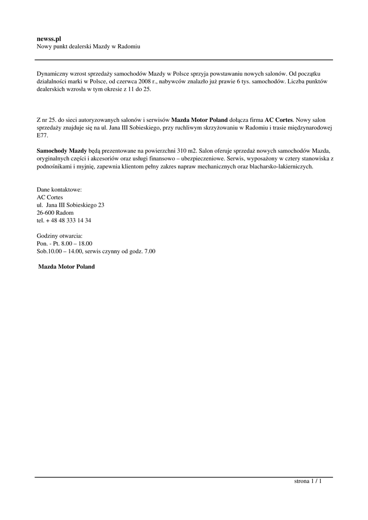 newss.pl Nowy punkt dealerski Mazdy w Radomiu Dynamiczny wzrost sprzedaży samochodów Mazdy w Polsce sprzyja powstawaniu nowych salonów. Od początku działalności marki w Polsce, od czerwca 2008 r., nabywców znalazło już prawie 6 tys. samochodów. Liczba punktów dealerskich wzrosła w tym okresie z 11 do 25. Z nr 25. do sieci autoryzowanych salonów i serwisów Mazda Motor Poland dołącza firma AC Cortes. Nowy salon sprzedaży znajduje się na ul. Jana III Sobieskiego, przy ruchliwym skrzyżowaniu w Radomiu i trasie międzynarodowej E77. Samochody Mazdy będą prezentowane na powierzchni 310 m2. Salon oferuje sprzedaż nowych samochodów Mazda, oryginalnych części i akcesoriów oraz usługi finansowo – ubezpieczeniowe. Serwis, wyposażony w cztery stanowiska z podnośnikami i myjnię, zapewnia klientom pełny zakres napraw mechanicznych oraz blacharsko-lakierniczych. Dane kontaktowe: AC Cortes ul. Jana III Sobieskiego 23 26-600 Radom tel. + 48 48 333 14 34 Godziny otwarcia: Pon. - Pt. 8.00 – 18.00 Sob.10.00 – 14.00, serwis czynny od godz. 7.00 Mazda Motor Poland strona 1 / 1