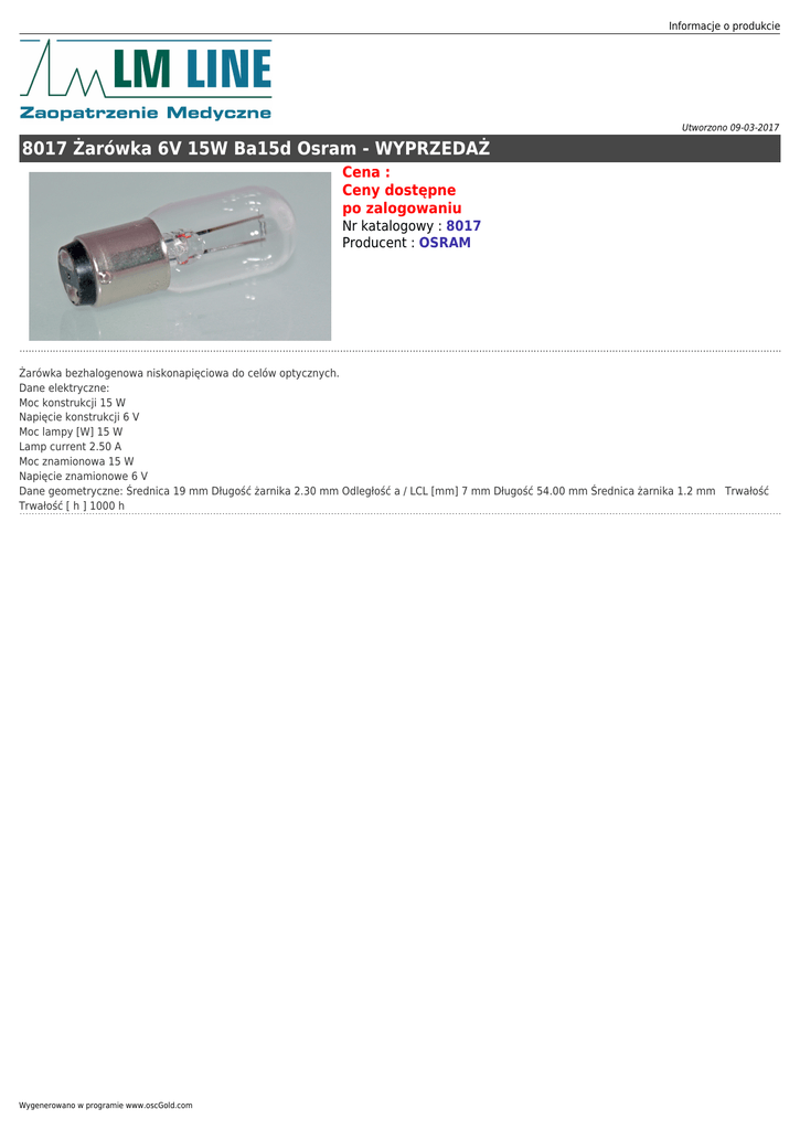 Informacje o produkcie Utworzono 09-03-2017 8017 Żarówka 6V 15W Ba15d Osram - WYPRZEDAŻ Cena : Ceny dostępne po zalogowaniu Nr katalogowy : 8017 Producent : OSRAM Żarówka bezhalogenowa niskonapięciowa do celów optycznych. Dane elektryczne: Moc konstrukcji 15 W Napięcie konstrukcji 6 V Moc lampy [W] 15 W Lamp current 2.50 A Moc znamionowa 15 W Napięcie znamionowe 6 V Dane geometryczne: Średnica 19 mm Długość żarnika 2.30 mm Odległość a / LCL [mm] 7 mm Długość 54.00 mm Średnica żarnika 1.2 mm Trwałość Trwałość [ h ] 1000 h Wygenerowano w programie www.oscGold.com
