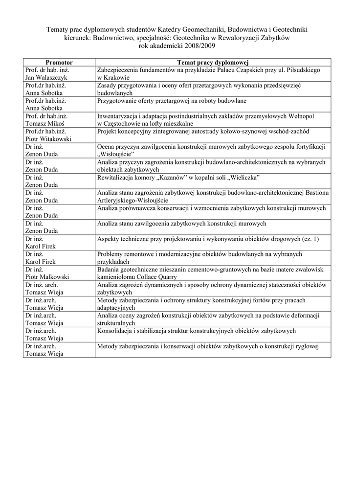 Tematy prac dyplomowych studentów Katedry Geomechaniki, Budownictwa i Geotechniki kierunek: Budownictwo, specjalność: Geotechnika w Rewaloryzacji Zabytków rok akademicki 2008/2009 Promotor Prof. dr hab. inŜ. Jan Walaszczyk Prof.dr hab.inŜ. Anna Sobotka Prof.dr hab.inŜ. Anna Sobotka Prof. dr hab.inŜ. Tomasz Mikoś Prof.dr hab.inŜ. Piotr Witakowski Dr inŜ. Zenon Duda Dr inŜ. Zenon Duda Dr inŜ. Zenon Duda Dr inŜ. Zenon Duda Dr inŜ. Zenon Duda Dr inŜ. Zenon Duda Dr inŜ. Karol Firek Dr inŜ. Karol Firek Dr inŜ. Piotr Małkowski Dr inŜ. arch. Tomasz Wieja Dr inŜ.arch. Tomasz Wieja Dr inŜ.arch. Tomasz Wieja Dr inŜ.arch. Tomasz Wieja Dr inŜ.arch. Tomasz Wieja Temat pracy dyplomowej Zabezpieczenia fundamentów na przykładzie Pałacu Czapskich przy ul. Piłsudskiego w Krakowie Zasady przygotowania i oceny ofert przetargowych wykonania przedsięwzięć budowlanych Przygotowanie oferty przetargowej na roboty budowlane Inwentaryzacja i adaptacja postindustrialnych zakładów przemysłowych Wełnopol w Częstochowie na lofty mieszkalne Projekt koncepcyjny zintegrowanej autostrady kołowo-szynowej wschód-zachód Ocena przyczyn zawilgocenia konstrukcji murowych zabytkowego zespołu fortyfikacji „Wisłoujście” Analiza przyczyn zagroŜenia konstrukcji budowlano-architektonicznych na wybranych obiektach zabytkowych Rewitalizacja komory „Kazanów” w kopalni soli „Wieliczka” Analiza stanu zagroŜenia zabytkowej konstrukcji budowlano-architektonicznej Bastionu Artleryjskiego-Wisłoujście Analiza porównawcza konserwacji i wzmocnienia zabytkowych konstrukcji murowych Analiza stanu zawilgocenia zabytkowych konstrukcji murowych Aspekty techniczne przy projektowaniu i wykonywaniu obiektów drogowych (cz. 1) Problemy remontowe i modernizacyjne obiektów budowlanych na wybranych przykładach Badania geotechniczne mieszanin cementowo-gruntowych na bazie matere zwałowisk kamieniołomu Collace Quarry Analiza zagroŜeń dynamicznych i sposoby ochrony dynamicznej stateczności obiektów zabytkowych Metody zabezpieczania i ochrony struktury konstrukcyjnej fortów przy pracach adaptacyjnych Analiza oceny zagroŜeń konstrukcji obiektów zabytkowych na podstawie deformacji strukturalnych Konsolidacja i stabilizacja struktur konstrukcyjnych obiektów zabytkowych Metody zabezpieczania i konserwacji obiektów zabytkowych o konstrukcji ryglowej