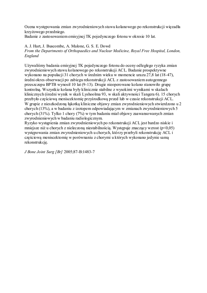 Ocena występowania zmian zwyrodnieniowych stawu kolanowego po rekonstrukcji więzadła krzyżowego przedniego. Badanie z zastosowaniem emisyjnej TK pojedynczego fotonu w okresie 10 lat. A. J. Hart, J. Buscombe, A. Malone, G. S. E. Dowd From the Departments of Orthopaedics and Nuclear Medicine, Royal Free Hospital, London, England Używaliśmy badania emisyjnej TK pojedynczego fotonu do oceny odległego ryzyka zmian zwyrodnieniowych stawu kolanowego po rekonstrukcji ACL. Badanie prospektywne wykonano na populacji 31 chorych w średnim wieku w momencie urazu 27,8 lat (18-47), średni okres obserwacji po zabiegu rekonstrukcji ACL z zastosowaniem autogennego przeszczepu BPTB wynosił 10 lat (9-13). Drugie nieoperowane kolano stanowiło grupę kontrolną. Wszystkie kolana były klinicznie stabilne z wysokimi wynikami w skalach klinicznych (średni wynik w skali Lyshoolma 93, w skali aktywności Tangera 6). 15 chorych przebyło częściową meniscektomię przyśrodkową przed lub w czasie rekonstrukcji ACL. W grupie z nieszkodzoną łąkotką kliniczne objawy zmian zwyrodnieniowych stwierdzono u 2 chorych (13%), a w badaniu z izotopem odpowiadającym w zmianach zwyrodnieniowych 5 chorych (31%). Tylko 1 chory (7%) w tym badaniu miał objawy zaawansowanych zmian zwyrodnieniowych w badaniu radiologicznym. Ryzyko wystąpienia zmian zwyrodnieniowych po rekonstrukcji ACL jest bardzo niskie i mniejsze niż u chorych z nieleczoną niestabilnością. Występuje znaczący wzrost (p<0,05) występowania zmian zwyrodnieniowych u chorych, którzy przebyli rekonstrukcję ACL i częściową meniscektomię w porównaniu z chorymi u których wykonano jedynie samą rekonstrukcję. J Bone Joint Surg [Br] 2005;87-B:1483-7