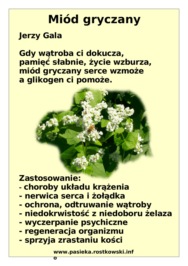 Miód gryczany Jerzy Gala Gdy wątroba ci dokucza, pamięć słabnie, życie wzburza, miód gryczany serce wzmoże a glikogen ci pomoże. Zastosowanie: - choroby układu krążenia - nerwica serca i żołądka - ochrona, odtruwanie wątroby - niedokrwistość z niedoboru żelaza - wyczerpanie psychiczne - regeneracja organizmu - sprzyja zrastaniu kości www.pasieka.rostkowski.inf o