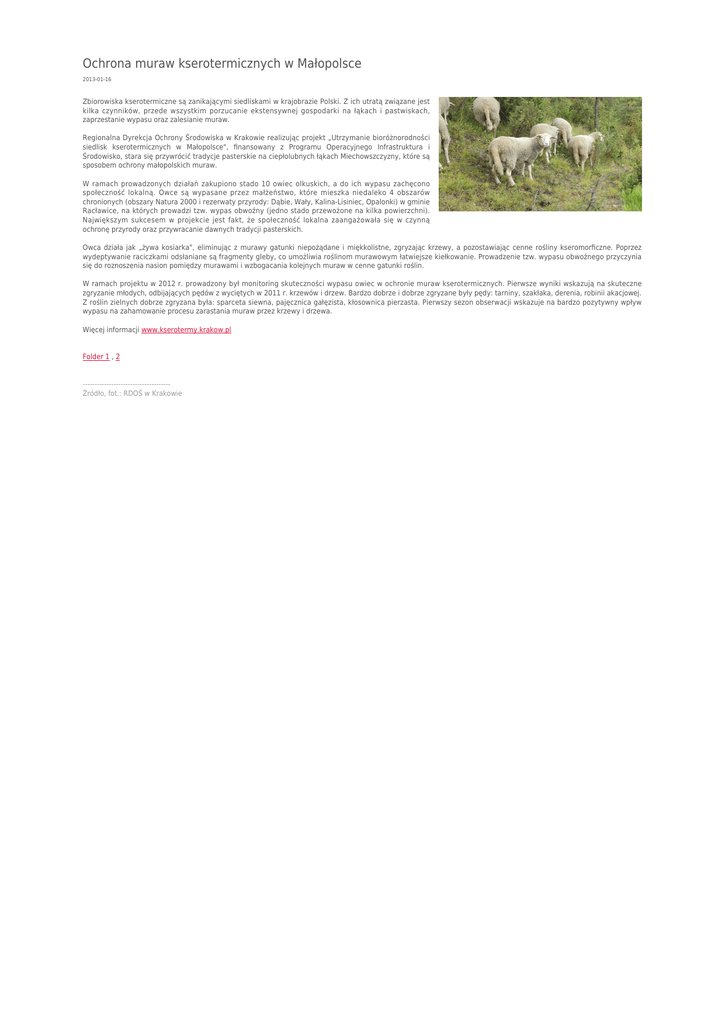 Ochrona muraw kserotermicznych w Małopolsce 2013-01-16 Zbiorowiska kserotermiczne są zanikającymi siedliskami w krajobrazie Polski. Z ich utratą związane jest kilka czynników, przede wszystkim porzucanie ekstensywnej gospodarki na łąkach i pastwiskach, zaprzestanie wypasu oraz zalesianie muraw. Regionalna Dyrekcja Ochrony Środowiska w Krakowie realizując projekt „Utrzymanie bioróżnorodności siedlisk kserotermicznych w Małopolsce", finansowany z Programu Operacyjnego Infrastruktura i Środowisko, stara się przywrócić tradycje pasterskie na ciepłolubnych łąkach Miechowszczyzny, które są sposobem ochrony małopolskich muraw. W ramach prowadzonych działań zakupiono stado 10 owiec olkuskich, a do ich wypasu zachęcono społeczność lokalną. Owce są wypasane przez małżeństwo, które mieszka niedaleko 4 obszarów chronionych (obszary Natura 2000 i rezerwaty przyrody: Dąbie, Wały, Kalina-Lisiniec, Opalonki) w gminie Racławice, na których prowadzi tzw. wypas obwoźny (jedno stado przewożone na kilka powierzchni). Największym sukcesem w projekcie jest fakt, że społeczność lokalna zaangażowała się w czynną ochronę przyrody oraz przywracanie dawnych tradycji pasterskich. Owca działa jak „żywa kosiarka", eliminując z murawy gatunki niepożądane i miękkolistne, zgryzając krzewy, a pozostawiając cenne rośliny kseromorficzne. Poprzez wydeptywanie raciczkami odsłaniane są fragmenty gleby, co umożliwia roślinom murawowym łatwiejsze kiełkowanie. Prowadzenie tzw. wypasu obwoźnego przyczynia się do roznoszenia nasion pomiędzy murawami i wzbogacania kolejnych muraw w cenne gatunki roślin. W ramach projektu w 2012 r. prowadzony był monitoring skuteczności wypasu owiec w ochronie muraw kserotermicznych. Pierwsze wyniki wskazują na skuteczne zgryzanie młodych, odbijających pędów z wyciętych w 2011 r. krzewów i drzew. Bardzo dobrze i dobrze zgryzane były pędy: tarniny, szakłaka, derenia, robinii akacjowej. Z roślin zielnych dobrze zgryzana była: sparceta siewna, pajęcznica gałęzista, kłosownica pierzasta. Pierwszy sezon obserwacji wskazuje na bardzo pozytywny wpływ wypasu na zahamowanie procesu zarastania muraw przez krzewy i drzewa. Więcej informacji www.kserotermy.krakow.pl Folder 1 , 2 ------------------------------------Źródło, fot.: RDOŚ w Krakowie
