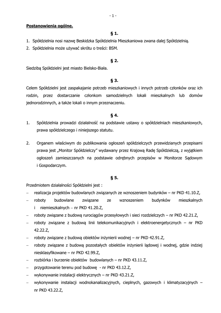 -1- Postanowienia ogólne. § 1. 1. Spółdzielnia nosi nazwę Beskidzka Spółdzielnia Mieszkaniowa zwana dalej Spółdzielnią. 2. Spółdzielnia może używać skrótu o treści: BSM. § 2. Siedzibą Spółdzielni jest miasto Bielsko-Biała. § 3. Celem Spółdzielni jest zaspakajanie potrzeb mieszkaniowych i innych potrzeb członków oraz ich rodzin, przez dostarczanie członkom samodzielnych lokali mieszkalnych lub domów jednorodzinnych, a także lokali o innym przeznaczeniu. § 4. 1. Spółdzielnia prowadzi działalność na podstawie ustawy o spółdzielniach mieszkaniowych, prawa spółdzielczego i niniejszego statutu. 2. Organem właściwym do publikowania ogłoszeń spółdzielczych przewidzianych przepisami prawa jest „Monitor Spółdzielczy” wydawany przez Krajową Radę Spółdzielczą, z wyjątkiem ogłoszeń zamieszczanych na podstawie odrębnych przepisów w Monitorze Sądowym i Gospodarczym. § 5. Przedmiotem działalności Spółdzielni jest : realizacja projektów budowlanych związanych ze wznoszeniem budynków – nr PKD 41.10.Z, roboty i budowlane związane ze wznoszeniem budynków mieszkalnych niemieszkalnych nr PKD 41.20.Z, roboty związane z budową rurociągów przesyłowych i sieci rozdzielczych – nr PKD 42.21.Z, roboty związane z budową linii telekomunikacyjnych i elektroenergetycznych – nr PKD 42.22.Z, roboty związane z budową obiektów inżynierii wodnej – nr PKD 42.91.Z, roboty związane z budową pozostałych obiektów inżynierii lądowej i wodnej, gdzie indziej niesklasyfikowane – nr PKD 42.99.Z, rozbiórka i burzenie obiektów budowlanych – nr PKD 43.11.Z, przygotowanie terenu pod budowę - nr PKD 43.12.Z, wykonywanie instalacji elektrycznych – nr PKD 43.21.Z, wykonywanie instalacji wodnokanalizacyjnych, cieplnych, gazowych i klimatyzacyjnych – nr PKD 43.22.Z, -2- wykonywanie pozostałych instalacji budowlanych – nr PKD 43.29.Z, tynkowanie – nr PKD 43.31.Z, zakładanie stolarki budowlanej nr PKD 43.32.Z, wykonywanie pozostałych robót wykończeniowych – nr PKD 43.39.Z, wykonywanie konstrukcji i pokryć dachowych – nr PKD 43.91.Z, pozostałe specjalistyczne roboty budowlane, gdzie indziej niesklasyfikowane – nr PKD 43.99.Z, posadzkarstwo; tapetowanie i oblicowywanie ścian – nr PKD 43.33.Z, malowanie i szklenie – nr PKD 43.34.Z, sprzedaż detaliczna prowadzona w niewyspecjalizowanych sklepach z przewagą żywności, napojów i wyrobów tytoniowych – nr PKD 47.11.Z, pozostała sprzedaż detaliczna prowadzona w niewyspecjalizowanych sklepach – nr PKD 47.19.Z, kupno i sprzedaż nieruchomości na własny rachunek – nr PKD 68.10.Z, niesklasyfikowana nr PKD 88.99.Z, działalność obiektów kulturalnych – nr PKD 90.04.Z, wynajem i zarządzanie nieruchomościami własnymi lub dzierżawionymi – nr PKD 68.20.Z, zarządzanie nieruchomościami wykonywane na zlecenie – nr PKD 68.32.Z. Rozdział II. Członkowie Spółdzielni. A. Przyjmowanie w poczet członków. § 6. 1. Członkiem Spółdzielni może być osoba fizyczna choćby nie miała zdolności do czynności prawnych lub miała ograniczoną zdolność do czynności prawnych. 2. Członkami Spółdzielni mogą być oboje małżonkowie, choćby spółdzielcze prawo do lokalu albo prawo odrębnej własności lokalu przysługiwało tylko jednemu z nich. Małżonkowi członka przysługuje roszczenie o przyjęcie w poczet członków Spółdzielni. 3. Członkiem Spółdzielni może być osoba prawna jednak osobie takiej nie przysługuje spółdzielcze lokatorskie prawo do lokalu mieszkalnego. Osoba prawna może być przyjęta w poczet członków Spółdzielni, o ile: a) ubiega się o prawo odrębnej własności lokalu mieszkalnego lub lokalu o innym przeznaczeniu na podstawie umowy zawartej ze Spółdzielnią, -3- b) nabyła spółdzielcze własnościowe prawo do lokalu mieszkalnego lub lokalu o innym przeznaczeniu albo prawo odrębnej własności w drodze dziedziczenia, zapisu, umowy lub postępowania egzekucyjnego. 4. Osoba fizyczna może być przyjęta w poczet członków, o ile spełnia jeden z następujących warunków: a) ubiega się o ustanowienie spółdzielczego lokatorskiego prawa do lokalu mieszkalnego, prawa odrębnej własności lokalu mieszkalnego lub lokalu o innym przeznaczeniu, b) jest małżonkiem członka Spółdzielni, c) w postępowaniu o podział majątku dorobkowego po ustaniu małżeństwa wskutek rozwodu lub po unieważnieniu małżeństwa przypadło jej spółdzielcze lokatorskie prawo do lokalu mieszkalnego lub spółdzielcze własnościowe prawo do lokalu mieszkalnego, d) nabyła ekspektatywę odrębnej własności lokalu w drodze dziedziczenia, zapisu lub umowy, e) nabyła spółdzielcze własnościowe prawo do lokalu lub prawo odrębnej własności lokalu w drodze dziedziczenia, zapisu, umowy lub postępowania egzekucyjnego, f) nabyła prawo odrębnej własności lokalu w drodze przetargu organizowanego przez Spółdzielnię, g) jest małżonkiem zmarłego członka z którym wspólnie posiadali spółdzielcze lokatorskie prawo do lokalu mieszkalnego, h) jest małżonkiem, dzieckiem lub inną osobą bliską członka, który posiadał spółdzielcze lokatorskie prawo do lokalu mieszkalnego, i) ubiega się o członkostwo w związku z zamianą lokalu mieszkalnego z członkiem Spółdzielni, j) została wskazana przez członka Spółdzielni, na podstawie art. 21 ust. 2 ustawy o spółdzielniach mieszkaniowych, jako osoba uprawniona do ustanowienia na jej rzecz odrębnej własności lokalu. 5. Osoba fizyczna może być przyjęta w poczet członków Spółdzielni również w przypadku gdy nabyła w części ułamkowej w drodze dziedziczenia, zapisu lub umowy : a) ekspektatywę odrębnej własności lokalu, z tym zastrzeżeniem, że jeżeli nabycie nastąpiło na rzecz kilku osób, członkiem Spółdzielni może być tylko jedna z nich, chyba że prawo przysługuje wspólnie małżonkom, b) spółdzielcze własnościowe prawo do lokalu lub prawo od