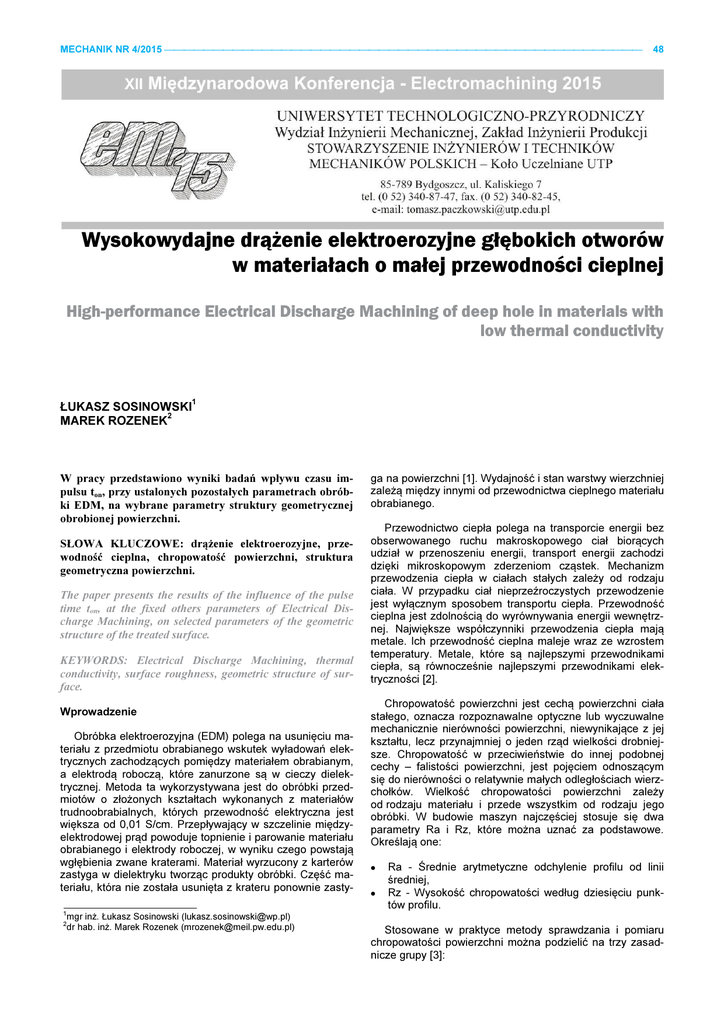 MECHANIK NR 4/2015 48 Wysokowydajne drążenie elektroerozyjne głębokich otworów w materiałach o małej przewodności cieplnej High-performance Electrical Discharge Machining of deep hole in materials with low thermal conductivity 1 ŁUKASZ SOSINOWSKI 2 MAREK ROZENEK W pracy przedstawiono wyniki badań wpływu czasu impulsu ton, przy ustalonych pozostałych parametrach obróbki EDM, na wybrane parametry struktury geometrycznej obrobionej powierzchni. SŁOWA KLUCZOWE: drążenie elektroerozyjne, przewodność cieplna, chropowatość powierzchni, struktura geometryczna powierzchni. The paper presents the results of the influence of the pulse time ton, at the fixed others parameters of Electrical Discharge Machining, on selected parameters of the geometric structure of the treated surface. KEYWORDS: Electrical Discharge Machining, thermal conductivity, surface roughness, geometric structure of surface. Wprowadzenie Obróbka elektroerozyjna (EDM) polega na usunięciu materiału z przedmiotu obrabianego wskutek wyładowań elektrycznych zachodzących pomiędzy materiałem obrabianym, a elektrodą roboczą, które zanurzone są w cieczy dielektrycznej. Metoda ta wykorzystywana jest do obróbki przedmiotów o złożonych kształtach wykonanych z materiałów trudnoobrabialnych, których przewodność elektryczna jest większa od 0,01 S/cm. Przepływający w szczelinie międzyelektrodowej prąd powoduje topnienie i parowanie materiału obrabianego i elektrody roboczej, w wyniku czego powstają wgłębienia zwane kraterami. Materiał wyrzucony z karterów zastyga w dielektryku tworząc produkty obróbki. Część materiału, która nie została usunięta z krateru ponownie zasty- ga na powierzchni [1]. Wydajność i stan warstwy wierzchniej zależą między innymi od przewodnictwa cieplnego materiału obrabianego. Przewodnictwo ciepła polega na transporcie energii bez obserwowanego ruchu makroskopowego ciał biorących udział w przenoszeniu energii, transport energii zachodzi dzięki mikroskopowym zderzeniom cząstek. Mechanizm przewodzenia ciepła w ciałach stałych zależy od rodzaju ciała. W przypadku ciał nieprzeźroczystych przewodzenie jest wyłącznym sposobem transportu ciepła. Przewodność cieplna jest zdolnością do wyrównywania energii wewnętrznej. Największe współczynniki przewodzenia ciepła mają metale. Ich przewodność cieplna maleje wraz ze wzrostem temperatury. Metale, które są najlepszymi przewodnikami ciepła, są równocześnie najlepszymi przewodnikami elektryczności [2]. Chropowatość powierzchni jest cechą powierzchni ciała stałego, oznacza rozpoznawalne optyczne lub wyczuwalne mechanicznie nierówności powierzchni, niewynikające z jej kształtu, lecz przynajmniej o jeden rząd wielkości drobniejsze. Chropowatość w przeciwieństwie do innej podobnej cechy – falistości powierzchni, jest pojęciem odnoszącym się do nierówności o relatywnie małych odległościach wierzchołków. Wielkość chropowatości powierzchni zależy od rodzaju materiału i przede wszystkim od rodzaju jego obróbki. W budowie maszyn najczęściej stosuje się dwa parametry Ra i Rz, które można uznać za podstawowe. Określają one: • • Ra - Średnie arytmetyczne odchylenie profilu od linii średniej, Rz - Wysokość chropowatości według dziesięciu punktów profilu. 1 mgr inż. Łukasz Sosinowski ([email protected]) dr hab. inż. Marek Rozenek ([email protected]) 2 Stosowane w praktyce metody sprawdzania i pomiaru chropowatości powierzchni można podzielić na trzy zasadnicze grupy [3]: MECHANIK NR 4/2015 • • • 49 jący na wyniki badań. Widok jednej z przygotowanych do pomiarów próbek został pokazany na rys. 2. porównanie z wzorcami, pomiar metodami optycznymi, pomiar metodą stykową. Metodyka badań Przeprowadzono badania doświadczalne w celu sprawdzenia wpływu czasu impulsu ton, przy stałych pozostałych parametrach EDM, na strukturę geometryczną powierzchni po obróbce elektroerozyjnej [4]. Badania zostały wykonane na drążarce elektroerozyjnej Charmilles Drill 20, widocznej na rys. 1. Rys. 2. Widok jednej z próbek pomiarowych Po przygotowaniu próbek podzielono każdą z nich na trzy strefy: górną, środkową i dolną. W każdej ze stref wykonano pomiary na profilometrze Talysurf 10, przedstawionym na rys. 3. Rys. 3. Profilometr Talysurf 10 firmy Taylor Hobson Rys. 1. Drążarka elektroerozyjna Drill 20 firmy Charmilles. Wyniki badań Wykonano 9 przelotowych otworów w płaskowniku o grubości 40 mm ze stali nierdzewnej – kwasoodpornej OH18N9. Stal ta charakteryzuje się niską przewodnością cieplną wynoszącą λ = 15 W/mK. Do tego celu użyto elektrod rurkowych, mosiężnych (Cu-Zn) o średnicy 1 mm. Proces odbywał się w obecności dielektryka (woda demineralizowana i dejonizowana). W poniższej tabeli przedstawiono parametry obróbki z jakimi były realizowane badania. Chropowatość powierzchni oraz dokładność wymiarowo – kształtowa są to jedne z najważniejszych użytkowych cech charakteryzujących obróbkę EDM. Chropowatość powierzchni obrabianych elektroerozyjnie jest wynikiem wzajemnie nakładających się kraterów. W rezultacie wysokość nierówności jest tym większa, im większa jest energia poszczególnych impulsów [5], [6]. W wyniku przeprowadzonych badań wyznaczono zależność chropowatości Ra i Rz powierzchni obrabianej od czasu trwania impulsu ton. Zależność parametru chropowatości Ra od czasu trwania impulsu ton przedstawia rys. 4, zaś zależność Rz od ton, została pokazana na rys. 5. Tab. 1. Parametry obróbki realizowane w badaniu Parametry wejściowe czas impulsu ton w przedziale 19 – 99 µs Parametry wejściowe ustalone napięcie wyładowania U amplituda natężenia prądu I czas przerwy między impulsami toff 6V 25 ~30 A 19 µs Parametry wyjściowe średnica wydrążonych otworów d chropowatość powierzchni Ra, Rz Po wykonaniu otworów przecięto je równolegle do ich osi z
