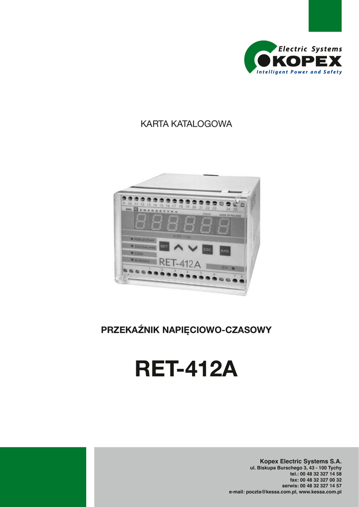KARTA KATALOGOWA PRZEKAŹNIK NAPIĘCIOWO-CZASOWY RET-412A Kopex Electric Systems S.A. ul. Biskupa Burschego 3, 43 - 100 Tychy tel.: 00 48 32 327 14 58 fax: 00 48 32 327 00 32 serwis: 00 48 32 327 14 57 e-mail: [email protected], www.kessa.com.pl RET-412A 2 RET-412A 3 RET-412A 4 RET-412A 5 RET-412A KARTA KATALOGOWA RET-412A PRZYKŁAD ZASTOSOWANIA Przekaźnik RET-412A może być stosowany m. in. jako zabezpieczenie nadnapięciowe zwłoczne do sygnalizacji zwarć doziemnych w sieciach elektroenergetycznych z izolowanym punktem neutralnym. Przykład takiej aplikacji przedstawiono na rysunku 4. Rys. 4. Schemat połączeń zewnętrznych przekaźnika RET-412A w układzie sygnalizacji zwarć doziemnych w sieciach elektroenergetycznych z izolowanym punktem neutralnym. - 6/8 6 EE 426061.01 RET-412A < 7 RET-412A Kopex Electric Systems S.A. ul. Biskupa Burschego 3, 43 - 100 Tychy tel.: 00 48 32 327 14 58 fax: 00 48 32 327 00 32 serwis: 00 48 32 327 14 57 e-mail: [email protected], www.kessa.com.pl 8 Zakład Chorzów ul. Opolska 19 41- 500 Chorzów Zakład Tychy ul. Biskupa Burschego 3 43 - 100 Tychy www.kessa.com.pl e-mail: [email protected] Kopex Electric Systems S.A. ul. Biskupa Burschego 3, 43 - 100 Tychy tel.: 00 48 32 327 14 58 fax: 00 48 32 327 00 32 serwis: 00 48 32 327 14 57