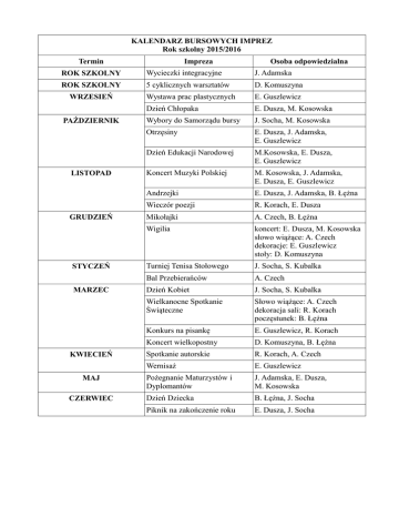 KALENDARZ BURSOWYCH IMPREZ Rok szkolny 2015/2016 Termin Impreza Osoba odpowiedzialna ROK SZKOLNY Wycieczki integracyjne J. Adamska ROK SZKOLNY 5 cyklicznych warsztatów D. Komuszyna Wystawa prac plastycznych E. Guszlewicz Dzień Chłopaka E. Dusza, M. Kosowska Wybory do Samorządu bursy J. Socha, M. Kosowska Otrzęsiny E. Dusza, J. Adamska, E. Guszlewicz Dzień Edukacji Narodowej M.Kosowska, E. Dusza, E. Guszlewicz Koncert Muzyki Polskiej M. Kosowska, J. Adamska, E. Dusza, E. Guszlewicz Andrzejki E. Dusza, J. Adamska, B. Łężna Wieczór poezji R. Korach, E. Dusza Mikołajki A. Czech, B. Łężna Wigilia koncert: E. Dusza, M. Kosowska słowo wiążące: A. Czech dekoracje: E. Guszlewicz stoły: D. Komuszyna Turniej Tenisa Stołowego J. Socha, S. Kubalka Bal Przebierańców A. Czech Dzień Kobiet J. Socha, S. Kubalka Wielkanocne Spotkanie Świąteczne Słowo wiążące: A. Czech dekoracja sali: R. Korach poczęstunek: B. Łężna Konkurs na pisankę E. Guszlewicz, R. Korach Koncert wielkopostny D. Komuszyna, B. Łężna Spotkanie autorskie R. Korach, A. Czech Wernisaż E. Guszlewicz Pożegnanie Maturzystów i Dyplomantów J. Adamska, E. Dusza, M. Kosowska Dzień Dziecka B. Łężna, J. Socha Piknik na zakończenie roku E. Dusza, J. Socha WRZESIEŃ PAŹDZIERNIK LISTOPAD GRUDZIEŃ STYCZEŃ MARZEC KWIECIEŃ MAJ CZERWIEC
