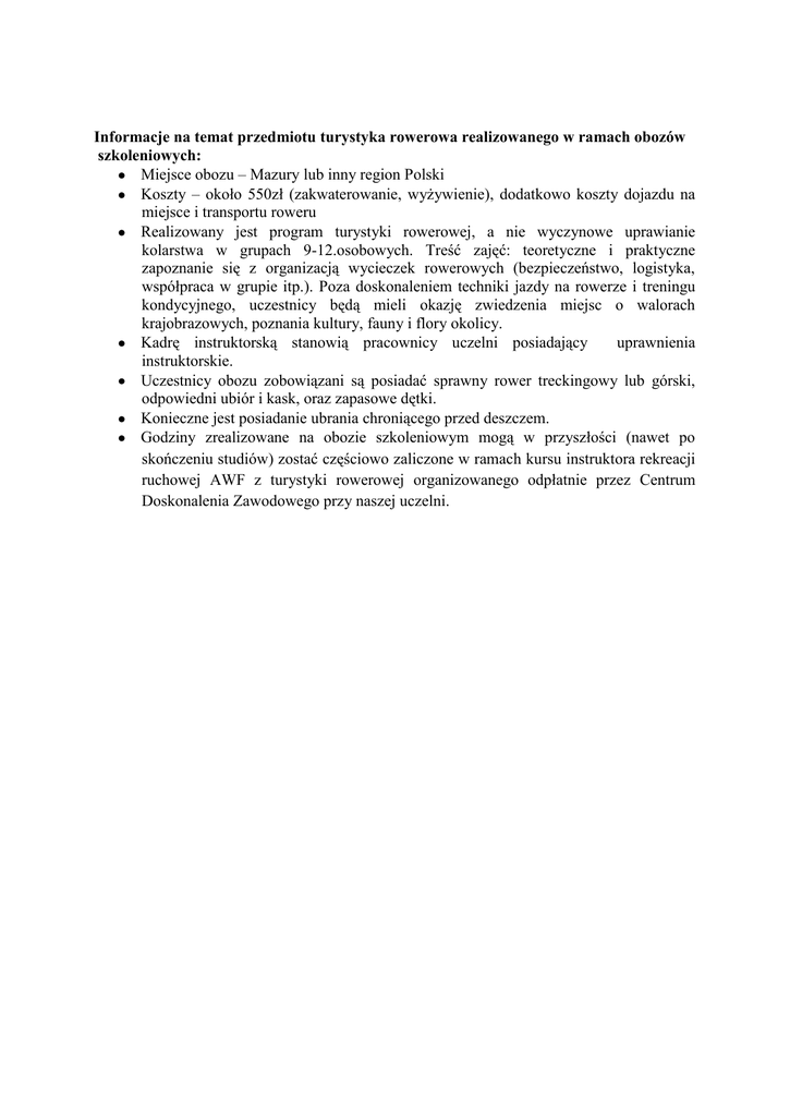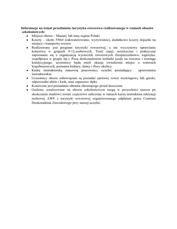 Informacje na temat przedmiotu turystyka rowerowa realizowanego w ramach obozów szkoleniowych: Miejsce obozu – Mazury lub inny region Polski Koszty – około 550zł (zakwaterowanie, wyżywienie), dodatkowo koszty dojazdu na miejsce i transportu roweru Realizowany jest program turystyki rowerowej, a nie wyczynowe uprawianie kolarstwa w grupach 9-12.osobowych. Treść zajęć: teoretyczne i praktyczne zapoznanie się z organizacją wycieczek rowerowych (bezpieczeństwo, logistyka, współpraca w grupie itp.). Poza doskonaleniem techniki jazdy na rowerze i treningu kondycyjnego, uczestnicy będą mieli okazję zwiedzenia miejsc o walorach krajobrazowych, poznania kultury, fauny i flory okolicy. Kadrę instruktorską stanowią pracownicy uczelni posiadający uprawnienia instruktorskie. Uczestnicy obozu zobowiązani są posiadać sprawny rower treckingowy lub górski, odpowiedni ubiór i kask, oraz zapasowe dętki. Konieczne jest posiadanie ubrania chroniącego przed deszczem. Godziny zrealizowane na obozie szkoleniowym mogą w przyszłości (nawet po skończeniu studiów) zostać częściowo zaliczone w ramach kursu instruktora rekreacji ruchowej AWF z turystyki rowerowej organizowanego odpłatnie przez Centrum Doskonalenia Zawodowego przy naszej uczelni.