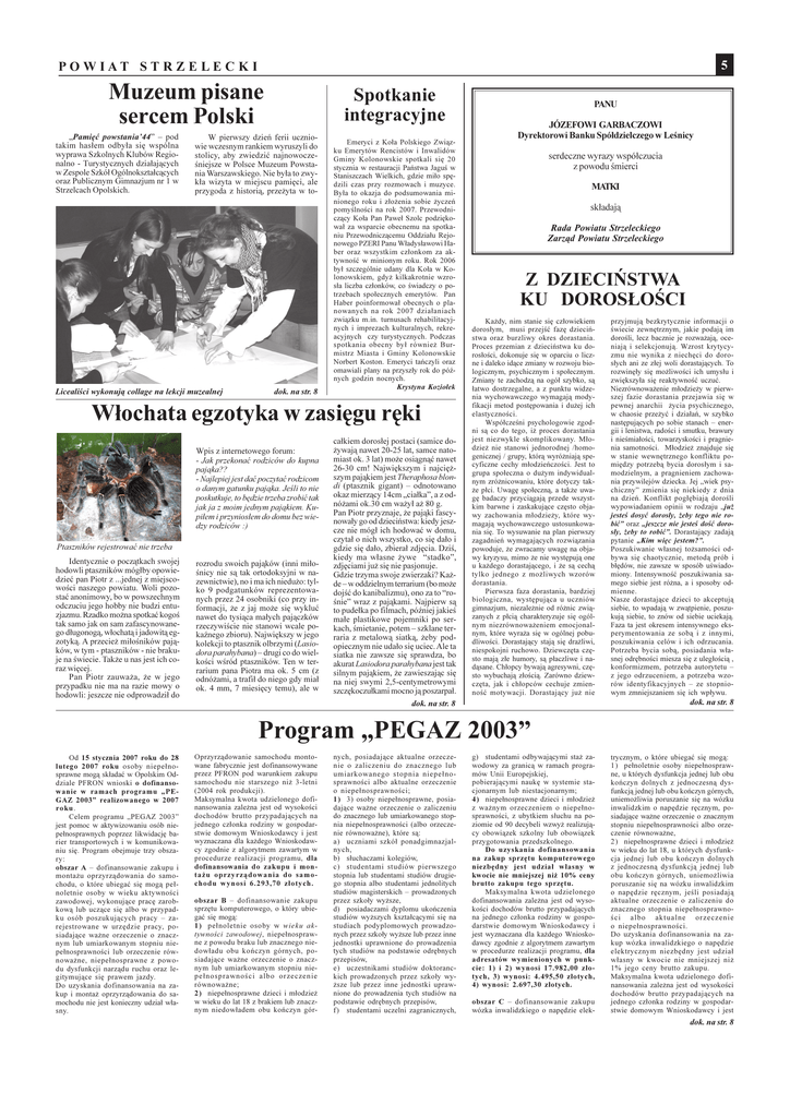 5 POWIAT STR Z E LE C K I Muzeum pisane sercem Polski Pamiêæ powstania44 pod takim has³em odby³a siê wspólna wyprawa Szkolnych Klubów Regionalno - Turystycznych dzia³aj¹cych w Zespole Szkó³ Ogólnokszta³c¹cych oraz Publicznym Gimnazjum nr 1 w Strzelcach Opolskich. Spotkanie integracyjne W pierwszy dzieñ ferii uczniowie wczesnym rankiem wyruszyli do stolicy, aby zwiedziæ najnowoczeniejsze w Polsce Muzeum Powstania Warszawskiego. Nie by³a to zwyk³a wizyta w miejscu pamiêci, ale przygoda z histori¹, prze¿yta w to- Licealici wykonuj¹ collage na lekcji muzealnej dok. na str. 8 Emeryci z Ko³a Polskiego Zwi¹zku Emerytów Rencistów i Inwalidów Gminy Kolonowskie spotkali siê 20 stycznia w restauracji Pañstwa Jagu w Staniszczach Wielkich, gdzie mi³o spêdzili czas przy rozmowach i muzyce. By³a to okazja do podsumowania minionego roku i z³o¿enia sobie ¿yczeñ pomylnoci na rok 2007. Przewodnicz¹cy Ko³a Pan Pawe³ Szolc podziêkowa³ za wsparcie obecnemu na spotkaniu Przewodnicz¹cemu Oddzia³u Rejonowego PZERI Panu W³adys³awowi Haber oraz wszystkim cz³onkom za aktywnoæ w minionym roku. Rok 2006 by³ szczególnie udany dla Ko³a w Kolonowskiem, gdy¿ kilkakrotnie wzros³a liczba cz³onków, co wiadczy o potrzebach spo³ecznych emerytów. Pan Haber poinformowa³ obecnych o planowanych na rok 2007 dzia³aniach zwi¹zku m.in. turnusach rehabilitacyjnych i imprezach kulturalnych, rekreacyjnych czy turystycznych. Podczas spotkania obecny by³ równie¿ Burmistrz Miasta i Gminy Kolonowskie Norbert Koston. Emeryci tañczyli oraz omawiali plany na przysz³y rok do pónych godzin nocnych. Krystyna Kozio³ek W³ochata egzotyka w zasiêgu rêki Wpis z internetowego forum: - Jak przekonaæ rodziców do kupna paj¹ka?? - Najlepiej jest daæ poczytaæ rodzicom o danym gatunku paj¹ka. Jeli to nie poskutkuje, to bêdzie trzeba zrobiæ tak jak ja z moim jednym paj¹kiem. Kupi³em i przynios³em do domu bez wiedzy rodziców :) Ptaszników rejestrowaæ nie trzeba Identycznie o pocz¹tkach swojej hodowli ptaszników móg³by opowiedzieæ pan Piotr z ...jednej z miejscowoci naszego powiatu. Woli pozostaæ anonimowy, bo w powszechnym odczuciu jego hobby nie budzi entuzjazmu. Rzadko mo¿na spotkaæ kogo tak samo jak on sam zafascynowanego d³ugonog¹, w³ochat¹ i jadowit¹ egzotyk¹. A przecie¿ mi³oników paj¹ków, w tym - ptaszników - nie brakuje na wiecie. Tak¿e u nas jest ich coraz wiêcej. Pan Piotr zauwa¿a, ¿e w jego przypadku nie ma na razie mowy o hodowli: jeszcze nie odprowadzi³ do rozrodu swoich paj¹ków (inni mi³onicy nie s¹ tak ortodoksyjni w nazewnictwie), no i ma ich niedu¿o: tylko 9 podgatunków reprezentowanych przez 24 osobniki (co przy informacji, ¿e z jaj mo¿e siê wykluæ nawet do tysi¹ca ma³ych paj¹czków rzeczywicie nie stanowi wcale pokanego zbioru). Najwiêkszy w jego kolekcji to ptasznik olbrzymi (Lasiodora parahybana) drugi co do wielkoci wród ptaszników. Ten w terrarium pana Piotra ma ok. 5 cm (z odnó¿ami, a trafi³ do niego gdy mia³ ok. 4 mm, 7 miesiêcy temu), ale w ca³kiem doros³ej postaci (samice do¿ywaj¹ nawet 20-25 lat, samce natomiast ok. 3 lat) mo¿e osi¹gn¹æ nawet 26-30 cm! Najwiêkszym i najciê¿szym paj¹kiem jest Theraphosa blondi (ptasznik gigant) odnotowano okaz mierz¹cy 14cm cia³ka, a z odnó¿ami ok.30 cm wa¿y³ a¿ 80 g. Pan Piotr przyznaje, ¿e paj¹ki fascynowa³y go od dzieciñstwa: kiedy jeszcze nie móg³ ich hodowaæ w domu, czyta³ o nich wszystko, co siê da³o i gdzie siê da³o, zbiera³ zdjêcia. Dzi, kiedy ma w³asne ¿ywe stadko, zdjêciami ju¿ siê nie pasjonuje. Gdzie trzyma swoje zwierzaki? Ka¿de w oddzielnym terrarium (bo mo¿e dojæ do kanibalizmu), ono za to ronie wraz z paj¹kami. Najpierw s¹ to pude³ka po filmach, póniej jakie ma³e plastikowe pojemniki po serkach, mietanie, potem szklane terraria z metalow¹ siatk¹, ¿eby podopiecznym nie uda³o siê uciec. Ale ta siatka nie zawsze siê sprawdza, bo akurat Lasiodora parahybana jest tak silnym paj¹kiem, ¿e zawieszaj¹c siê na niej swymi 2,5-centymetrowymi szczêkoczu³kami mocno j¹ poszarpa³. dok. na str. 8 PANU JÓZEFOWI GARBACZOWI Dyrektorowi Banku Spó³dzielczego w Lenicy serdeczne wyrazy wspó³czucia z powodu mierci MATKI sk³adaj¹ Rada Powiatu Strzeleckiego Zarz¹d Powiatu Strzeleckiego Z DZIECIÑSTWA KU DOROS£OCI Ka¿dy, nim stanie siê cz³owiekiem doros³ym, musi przejæ fazê dzieciñstwa oraz burzliwy okres dorastania. Proces przemian z dzieciñstwa ku doros³oci, dokonuje siê w oparciu o liczne i daleko id¹ce zmiany w rozwoju biologicznym, psychicznym i spo³ecznym. Zmiany te zachodz¹ na ogó³ szybko, s¹ ³atwo dostrzegalne, a z punktu widzenia wychowawczego wymagaj¹ modyfikacji metod postêpowania i du¿ej ich elastycznoci. Wspó³czeni psychologowie zgodni s¹ co do tego, i¿ proces dorastania jest niezwykle skomplikowany. M³odzie¿ nie stanowi jednorodnej /homogenicznej / grupy, któr¹ wyró¿niaj¹ specyficzne cechy m³odzieñczoci. Jest to grupa spo³eczna o du¿ym indywidualnym zró¿nicowaniu, które dotyczy tak¿e p³ci. Uwagê spo³eczn¹, a tak¿e uwagê badaczy przyci¹gaj¹ przede wszystkim barwne i zaskakuj¹ce czêsto objawy zachowania m³odzie¿y, które wymagaj¹ wychowawczego ustosunkowania siê. To wysuwanie na plan pierwszy zagadnieñ wymagaj¹cych rozwi¹zania powoduje, ¿e zwracamy uwagê na objawy kryzysu, mimo ¿e nie wystêpuj¹ one u ka¿dego dorastaj¹cego, i ¿e s¹ cech¹ tylko jednego z mo¿liwych wzorów dorastania. Pierwsza faza dorastania, bardziej biologiczna, wystêpuj¹ca u uczniów gimnazjum, niezale¿nie od ró¿nic zwi¹zanych z p³ci¹ charakteryzuje siê ogólnym niezrównowa¿eniem emocjonalnym, które wyra¿a siê w ogólnej pobudliwoci. Dorastaj¹cy staj¹ siê dra¿liwi, niespokojni ruchowo. Dziewczêta czêsto maj¹ z³e humory, s¹ p³aczliwe i nad¹sane. Ch³opcy bywaj¹ agresywni, czêsto wybuchaj¹ z³oci¹. Zarówno dziewczêta, jak i ch³opców cechuje zm